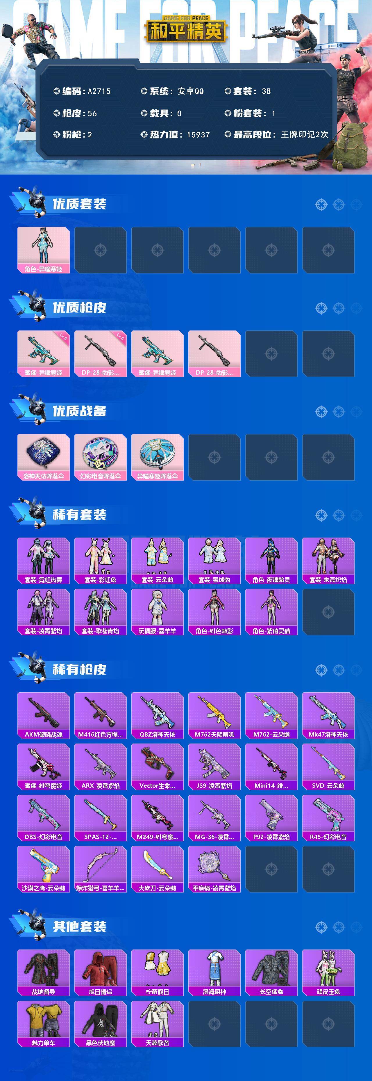 [15972419]安卓【小号】 手q-1粉装-2特效呛-0载具-1粉色飞行器-15937热力值-2王牌印记-38套装-56呛皮 【粉色套装】:角色-异瞳寒姬 【粉色呛皮等级】:蜜獾-异瞳寒姬六级,dp-28-豹影疾电五级 【粉色呛皮】:蜜獾-异瞳寒姬,dp-28-豹影疾电 【粉色降落伞】:洛神天依降落伞,幻彩电音降落伞,异瞳寒姬降落伞,炫彩糖果降落伞 【稀有套装】:套装-霓虹热舞,套装-彩虹兔,套装-云朵鹅,套装-雪绒豹,角色-夜瞳黯灵,套装-朱霞炽焰,套装-凌霄紫焰,套装-擎苍青焰,玩偶服-喜羊羊,角色-绯色魅影,角色-紫俏灵猫,套装-炫彩糖果 【稀有呛皮】:akm-破晓战魂,m416-红色方程式,q-洛神天依,m762-天降萌叽,m762-云朵鹅,mk47-洛神天依,蜜獾-绯穹魔姬,arx-凌霄紫焰,vect-生命誓言,js9-凌霄紫焰,mini14-绯穹魔姬,svd-云朵鹅,dbs-幻彩电音,spas-12-云朵鹅,m249-绯穹魔姬,mg-36-凌霄紫焰,p92-凌霄紫焰,r45-幻彩电音,沙墨之鹦-云朵鹅,爆炸猎弓-喜羊羊与灰太狼,大砍刀-云朵鹅,平底锅-凌霄紫焰 【其他套装】:套装-战地督导,套装-旭日情侣,套装-柠萌假日,套装-滨海厨神,套装-长空猛禽,套装-顽皮玉兔,套装-魅力单车,套装-黑色伏地魔,套装-天籁歌者 【营地id】:1027970306