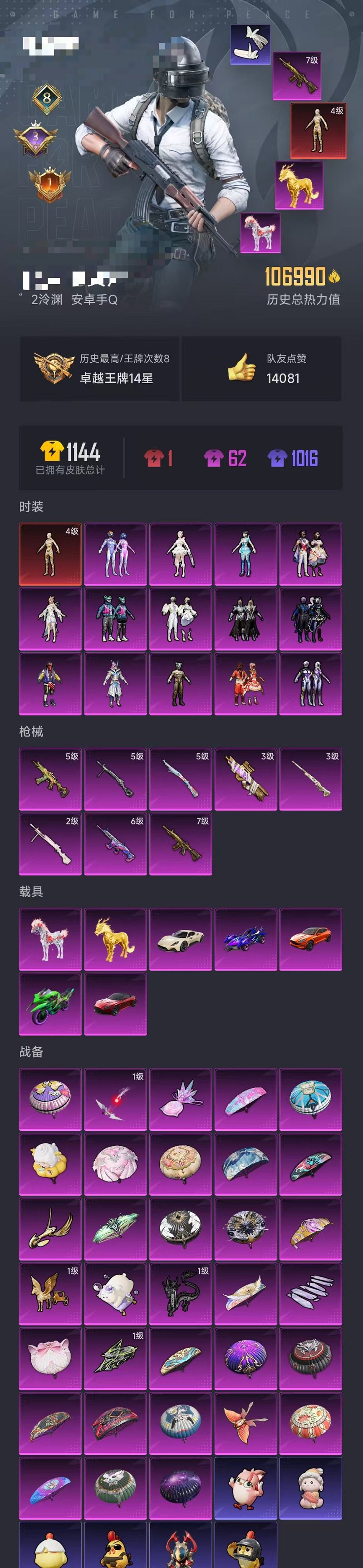 7载具-243套装-289呛皮-【连体号 4极图卡盟14粉装8特效呛7载具带王者193皮2珍品1典藏13传说 可秒换绑】 安卓q区-热力值-8印记-243套装-289呛皮 【1红装】 沙丘之主-图卡盟4级【6载具】 玛莎拉蒂m白色 阿斯顿马丁s红色 阿斯顿马丁x橙色 海龙奔腾 双刃魅影绿色 护世瑞兽【1稀有】 奇异狩猎者【14粉装】 梦幻火箭 赛罗闪耀型 暗夜玫瑰 寒光使者 铁血龙王 骨龙祭渊