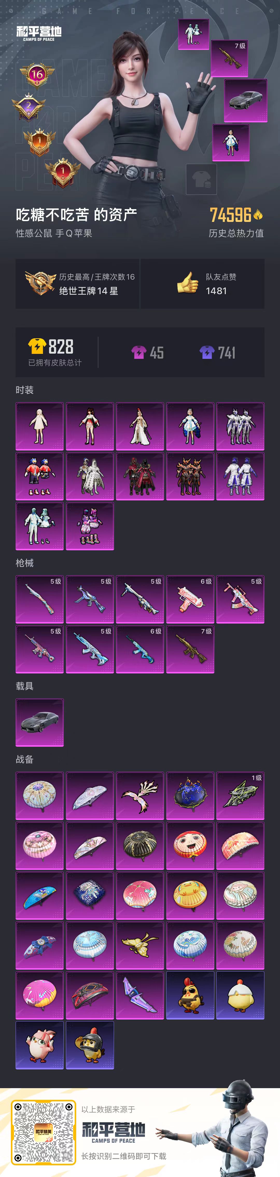 【和平精英】【txhp6476】12粉装,9特效呛,1载具,历史最高段位:绝世王牌14星 王牌印记16次 热力值:74596,158套装,217呛械,286装备,141战备;套装:套装-新星烈龙,套装-冰霜白皇,套装-炙焰红王,角色-洛天依,套装-蓝莓炮弹,套装-赤焰黑爵,套装-紫电风暴,套装-百合蜜语,套装-音爆索尼克,角色-小可学妹,角色-白勺歌姬,角色-萨利娅,套装-蓝色运动,套装-黑色伏地魔,套装-竞技名士,套装-深蓝色名流,套装-酒红色名流,套装-湖蓝色名流,套装-黄色名流,套装-猛禽,套装-长空猛禽,套装-黎明保卫者,套装-冷焰舞者,套装-灼焰舞者,套装-战地督导,套装-特殊使命,套装-灰色格斗者,套装-龙腾端午,套装-滨海假日,套装-完美偶像,套装-人气偶像,套装-幻影武者,套装-街头潮人,套装-蓝彩潮人,套装-神秘领域,套装-魅力单车,套装-绮丽涂鸦,套装-耀眼新星,套装-竞技达人朋克,套装-都市漫游者,套装-野性战魂,套装-破晓战魂,套装-沙漠兵团,套装-酷潮明星,套装-幻世战舞者,套装-甜蜜熊情侣,套装-缤纷果语,套装-龙魂突击队,套装-麻辣教官,套装-霓虹街区,套装-萌黄之夏,套装-超能拳王,套装-夏日音浪,套装-探宝勇士,套装-诡面顽熊,套装-青春冒险家,套装-潮流游乐家,套装-萌趣颜团子,套装-特种颜团子,套装-战术大师,套装-ss18特训,套装-银白舞王,套装-耀粉歌者,套装-迅捷之星,套装-治愈之星,套装-科技之星,套装-ss13特训,套装-曼妙人鱼,套装-热情海星,套装-纯真浪花,套装-ss14特训,套装-天籁歌者,套装-电音精灵,角色-捷德奥特曼,套装-吉莉礼服,套装-ss15特训,套装-act追光队服,套装-ss16特训,套装-暴风机械师,套装-时空追击者,套装-ss17特训,套装-醒狮腾龙,套装-瑞龙福将,套装-团圆交子,套装-福星高照,套装-海龙战士,套装-豚鼠丹丹,套装-雪兔飞飞,套装-虎虎生威吉莉,套装-异彩先驱,套装-霓虹极客,套装-ss19特训,套装-极速竞梦,套装-飞驰魅影,套装-音速流光,套装-茉莉之诺,套装-炫蓝之夏,套装-ss20特训,套装-甜心亚梦,套装-虚音幻奏,套装-香草威化,套装-ss21特训,套装-萌趣咩咩,套装-娇憨猪猪,套装-玉兔迎春,套装-ss22特训,套装-田园牧歌,套装-轻风白浪,套装-胡桃卫兵,套装-绯格组合,套装-ss23特训,套装-飞狐塔尔斯,套装-龙舌兰冰茶,套装-妙红点点,套装-幻彩翩翩,套装-跃动晴空,套装-活力清阳,套装-ss24特训,套装-龟仙人,套装-ss25特训,套装-惊鸿侠骨,套装-锦衣飞扬,套装-绝对偶像,套装-香桃花海,套装-龙的传人,套装-冰河战士,套装-ss26特训,套装-快闪甜心,套装-春光漫游,套装-空岛之星,套装-焰鹰斗篷,套装-幻羽潜行,套装-ss27特训,套装-恋语绒绒,套装-老实芭蕉,套装-ss28特训,角色-湖雨初晴,角色-米开朗基罗,套装-街头风暴,套装-海盐绵绵冰,套装-蝶变,套装-ss29特训,套装-雏菊兔兔,套装-萝兰蝴蝶,角色-摩登魅猫,角色-蜜桃派对,套装-星途旅人,套装-ss30特训,套装-摩登天骄,套装-ss31特训,套装-紫幽梦,套装-ss33特训,套装-巳巳如意,套装-ss32特训,套装-蓝冰羽,套装-大橘大利,套装-ss34特训,套装-ss35特训;呛皮:q-彩虹符号,q-洛神天依,q-飞驰魅影,q-妙趣可丽,q-纯真浪花,aug-青春冒险家,aug-天降萌叽,5级scar-l-童趣迷兔,scar-l-龙宫之主,scar-l-玉兔迎春,scar-l-海盐豹豹,6级akm-百合蜜语,akm-破晓战魂,akm-霓虹街区,akm-夜灯,akm-彩虹符号,akm-萌趣颜团子,akm-虎虎生威,7级m416-五爪金龙,m416-夜灯,m416-蓝色火焰,m416-糯团青竹,5级groza-旋转彩虹,groza-治愈之星,groza-彩虹符号,groza-蓝莓炮弹,groza-异彩先驱,groza-田园牧歌,g36c-时空追击者,g36c-暗夜玫瑰,g36c-乌木金纹,5级m762-冷魅冰骑,m762-镭射皇者,m762-瑞龙福将,m762-天降萌叽,m762-雏菊兔兔,mk47-青春冒险家,mk47-洛神天依,mk47-乌木金纹,mk47-妙红点点,ac-val-甜心亚梦,ac-val-乌木金纹,ac-val-天降萌叽,ac-val-快闪甜心,蜜獾-娇憨猪猪,蜜獾-天降萌叽,蜜獾-乌木金纹,m16a4-夜灯,m16a4-甜心亚梦,m16a4-幻世战舞者,m16a4-冰河战士,awm-王牌四分卫,awm-音爆索尼克,awm-焰鹰斗篷,awm-纯真浪花,awm-盛世惊鸿,awm-乌木金纹,莫辛纳甘-乌木金纹,莫辛纳甘-银碳小老虎,5级kar98k-巳巳如意,kar98k-梦幻火箭,kar98k-彩虹符号,kar98k-炫彩节奏,kar98k-洛神天依,kar98k-飞驰魅影,kar98k-星穹咏叹调,kar98k-乌木金纹,m200-绿野极光,m200-惊鸿侠骨,m200-乌木金纹,m24-治愈之星,m24-炫彩节奏,m24-百合蜜语,m24-妙趣可丽,m24-乌木金纹,win94-瑞龙福将,win94-乌木金纹,amr-妙红点点,amr-白勺歌姬,amr-乌木金纹,sks-夜灯,sks-炫彩节奏,sks-时空追击者,slr-葫芦兄弟,slr-娇憨猪猪,slr-金丰海韵,mini14-异彩先驱,mini14-旋转彩虹,mini14-香桃花海,mini14-雏菊兔兔,mk14-童趣迷兔,mk14-治愈之星,mk14-乌木金纹,mk14-冰河战士,mk14-紫幽梦,mk20-h-快闪甜心,mk20-h-狂鲨锋刃,mk20-h-乌木金纹,m417-惊鸿侠骨,m417-猪猪侠,vss-镭射皇者,vss-田园牧歌,vss-香桃花海,qbu-青春冒险家,6级uzi-畅跳缤纷,uzi-红色方程式,uzi-炫彩节奏,uzi-娇憨猪猪,uzi-天降萌叽,uzi-冰河战士,p90-飞驰魅影,p90-甜蜜旋律,p90-快闪甜心,p90-玩趣呆呆,p90-乌木金纹,汤姆逊-奇异狩猎者,汤姆逊-银刃赛罗,汤姆逊-炫彩节奏,汤姆逊-异彩先驱,汤姆逊-暗夜鎏金,汤姆逊-天降萌叽,汤姆逊-纯真浪花,vect-生命誓言,vect-夜灯,vect-彩虹符号,vect-治愈之星,vect-香水柠檬,vect-百合蜜语,vect-田园牧歌,vect-音爆索尼克,vect-焰鹰斗篷,野牛-青春冒险家,野牛-雏菊兔兔,野牛-乌木金纹,5级ump45-量子极限,ump45-粉色回忆,ump45-时空追击者,ump45-海渊国主,ump45-猪猪侠,ump45-海盐豹豹,mp5k-蓝莓炮弹,