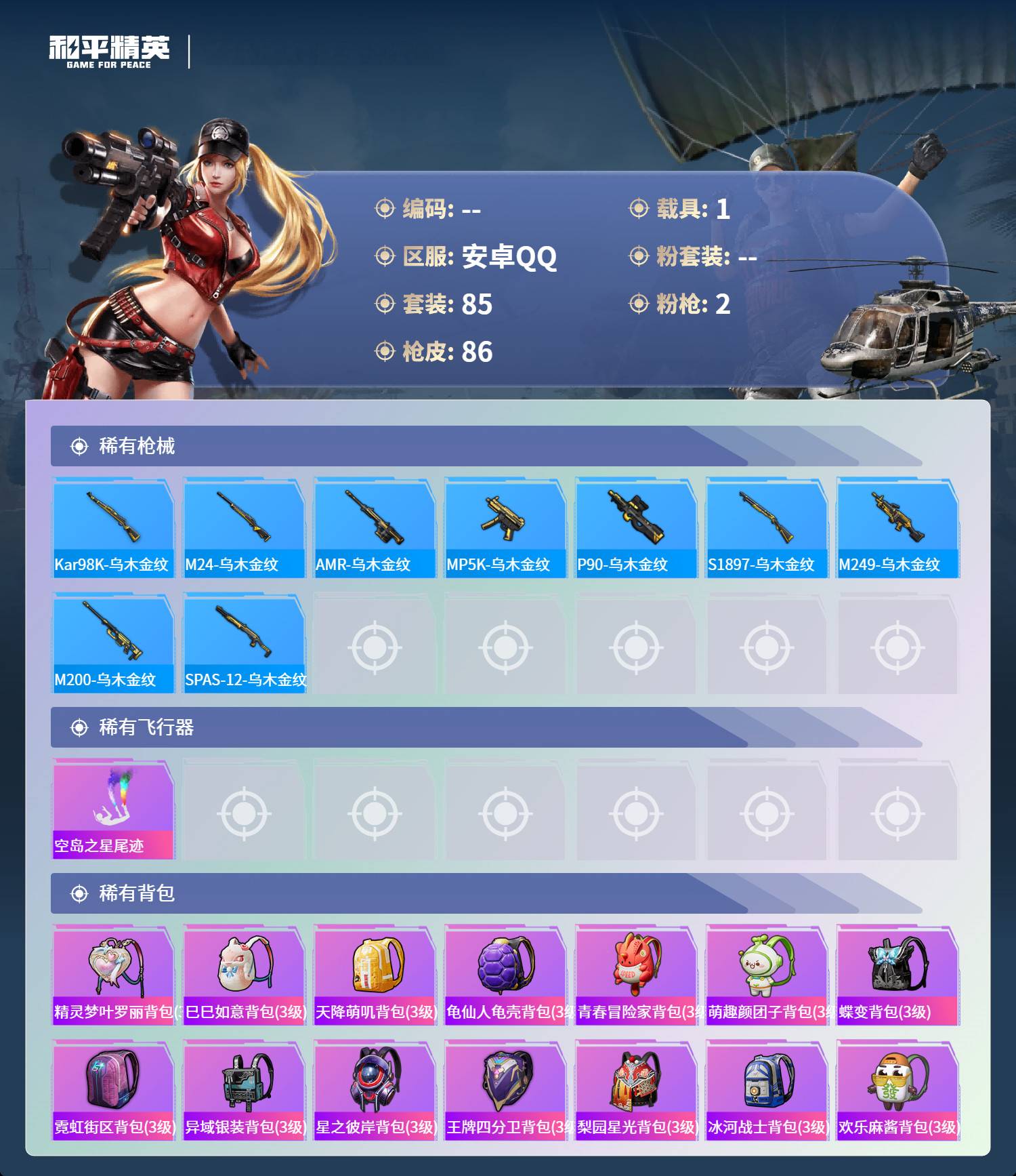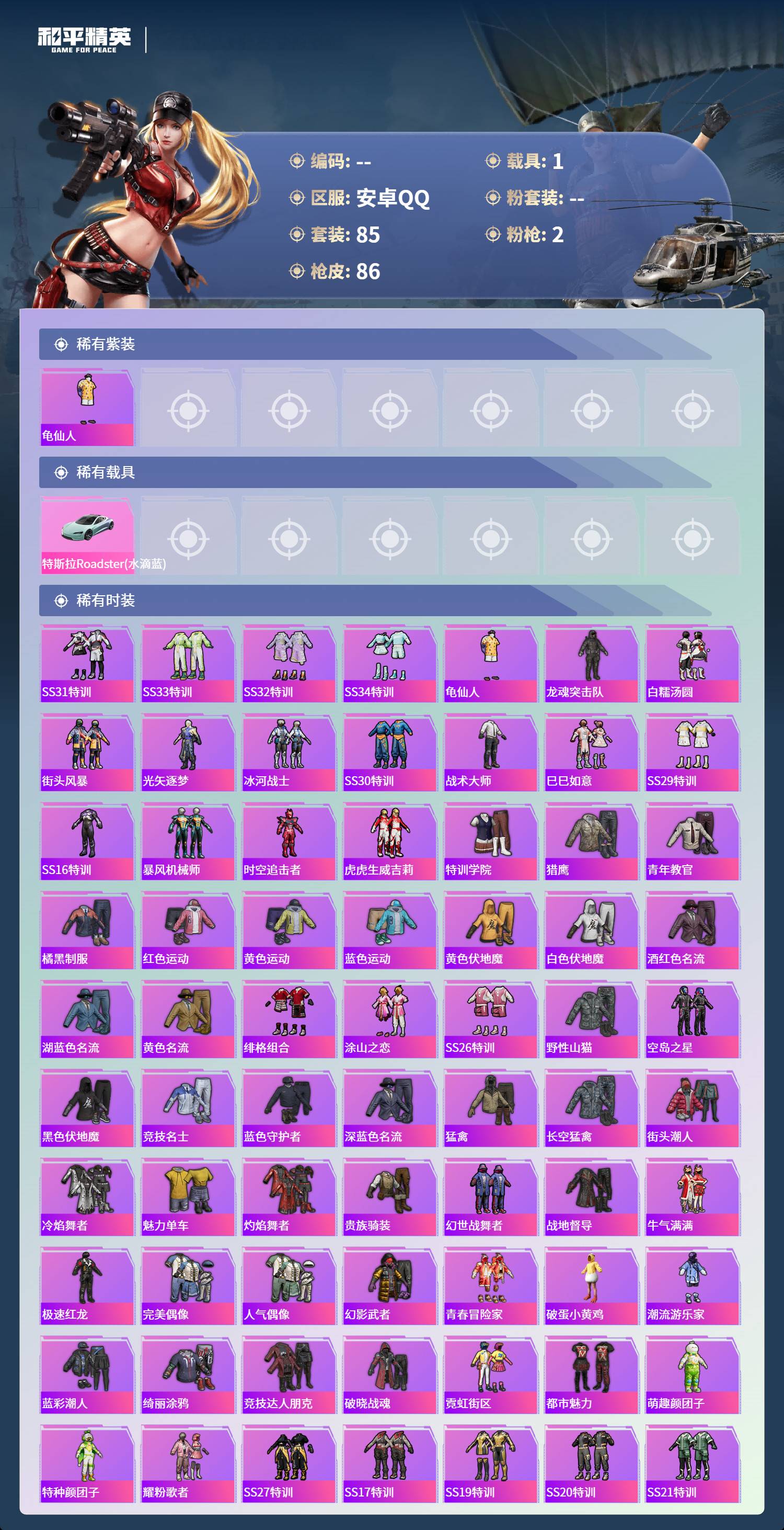 006fs:k3902安卓手q-4王牌印记-2特效呛-1载具-26398热力值-85套装-86呛皮-2卓越印记-1传奇印记 【2特效呛】kar98k-巳巳如意/5级vss-烈焰拳霸/5级 【1稀有紫装】龟仙人 【1稀有载具】特斯拉roadster水滴蓝 【85稀有时装】ss31特训ss33特训ss32特训ss34特训龟仙人龙魂突击队白糯汤圆街头风暴光矢逐梦冰河战士ss30特训战术大师巳巳如意ss29特训ss16特训暴风机械师时空追击者虎虎生威吉莉特训学院猎鹰青年教官橘黑制服红色运动黄色运动蓝色运动黄色伏地魔白色伏地魔酒红色名流湖蓝色名流黄色名流绯格组合涂山之恋ss26特训野性山猫空岛之星黑色伏地魔竞技名士蓝色守护者深蓝色名流猛禽长空猛禽街头潮人冷焰舞者魅力单车灼焰舞者贵族骑装幻世战舞者战地督导牛气满满极速红龙完美偶像人气偶像幻影武者青春冒险家破蛋小黄鸡潮流游乐家蓝彩潮人绮丽涂鸦竞技达人朋克破晓战魂霓虹街区都市魅力萌趣颜团子特种颜团子耀粉歌者ss27特训ss17特训ss19特训ss20特训ss21特训玉兔迎春ss22特训星河入梦ss23特训冰爽海盐缤纷果语迪迦奥特曼海盐绵绵冰老实芭蕉吉莉礼服王牌教练荣耀ss24特训ss25特训ss15特训 【86稀有呛械】dbs-乌木金纹kar98k-巳巳如意/5级mk14-冰河战士uzi-冰河战士m16a4-冰河战士mk20-h-乌木金纹vss-烈焰拳霸/5级svd-冷漠罗丽m417-玩趣呆呆盐雾蛋-冰氧夏日groza-荧海星豚m416-红色方程式m416-糯团青竹akm-夜灯akm-破晓战魂akm-虎虎生威akm-恐龙拽拽akm-萌趣颜团子akm-霓虹街区scar-l-红色方程式scar-l-炫彩节奏m16a4-幻世战舞者groza-彩虹符号aug-耀粉歌者aug-青春冒险家aug-天降萌叽q-彩虹符号m762-天降萌叽mk47-乌木金纹mk47-青春冒险家g36c-乌木金纹g36c-时空追击者ac-val-乌木金纹蜜獾-天降萌叽kar98k-乌木金纹kar98k-彩虹符号m24-乌木金纹莫辛纳甘-乌木金纹amr-乌木金纹sks-时空追击者sks-夜灯sks-炫彩节奏vss-彩虹符号mk14-乌木金纹qbu-青春冒险家uzi-红色方程式uzi-天降萌叽uzi-啾咪啾咪ump45-涂山之恋ump45-夜灯ump45-时空追击者vect-夜灯vect-彩虹符号汤姆逊-耀粉歌者汤姆逊-天降萌叽野牛-青春冒险家野牛-王牌四分卫野牛-夜灯mp5k-乌木金纹p90-乌木金纹p90-玩趣呆呆s686-葫芦兄弟s686-生命誓言s1897-春暖花开s1897-乌木金纹s12k-玩趣呆呆s12k-幻世战舞者dbs-时空追击者m249-破晓战魂m249-彩虹符号m249-糯团青竹m249-乌木金纹mg3-幻世战舞者mg3-乌木金纹平底锅-空岛之星平底锅-光之冒险平底锅-青春冒险家平底锅-时空追击者撬棍-幻世战舞者破片手留单-呆爆全场破片手留单-萌趣颜团子aug-异域银装m200-乌木金纹spas-12-乌木金纹vss-香桃花海p90-巳巳如意 【1稀有飞行器】空岛之星尾迹 【14稀有背包】精灵梦叶罗丽背包3级巳巳如意背包3级天降萌叽背包3级龟仙人龟壳背包3级青春冒险家背包3级萌趣颜团子背包3级蝶变背包3级霓虹街区背包3级异域银装背包3级星之彼岸背包3级王牌四分卫背包3级梨园星光背包3级冰河战士背包3级欢乐麻酱背包3级