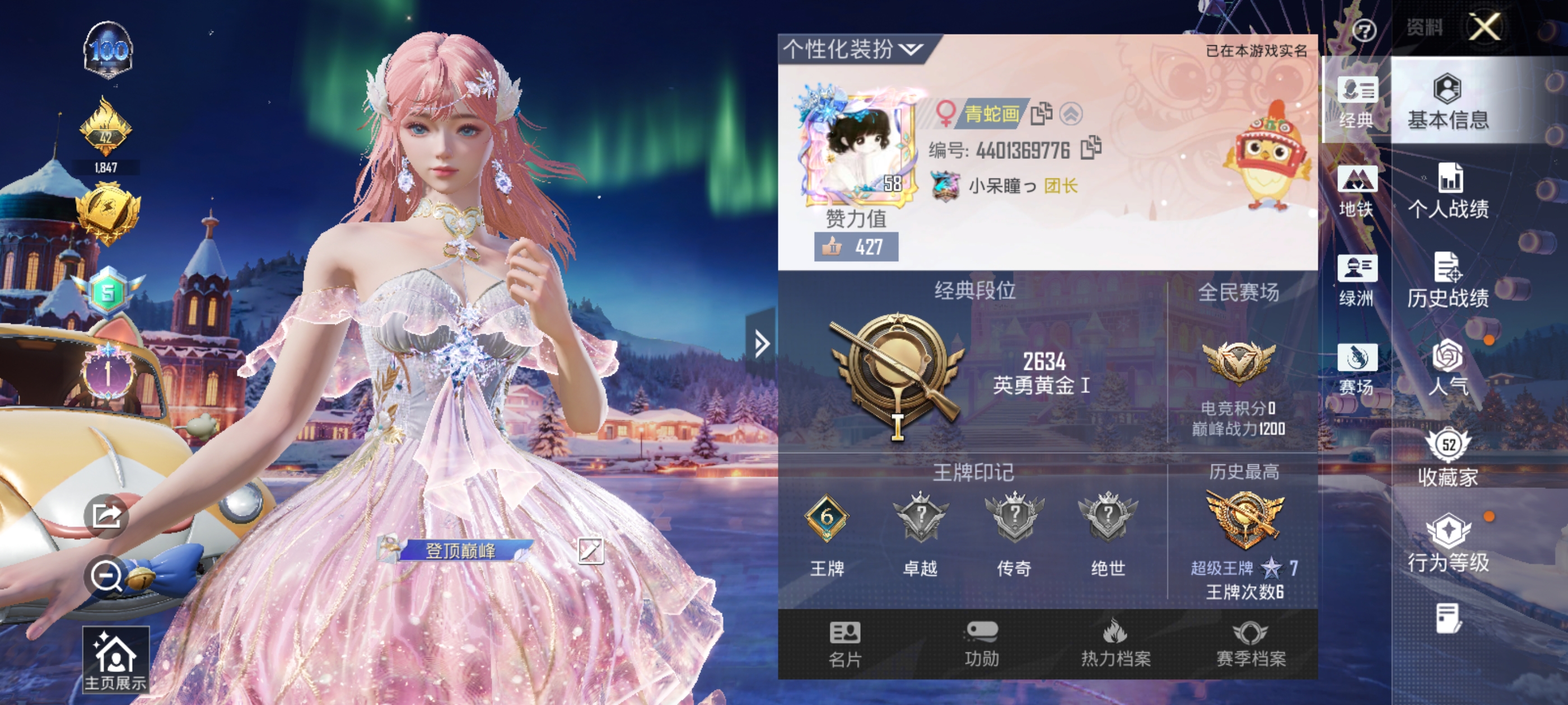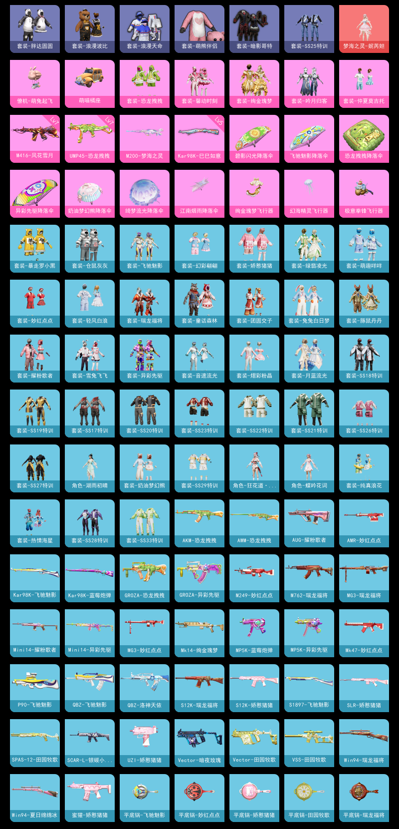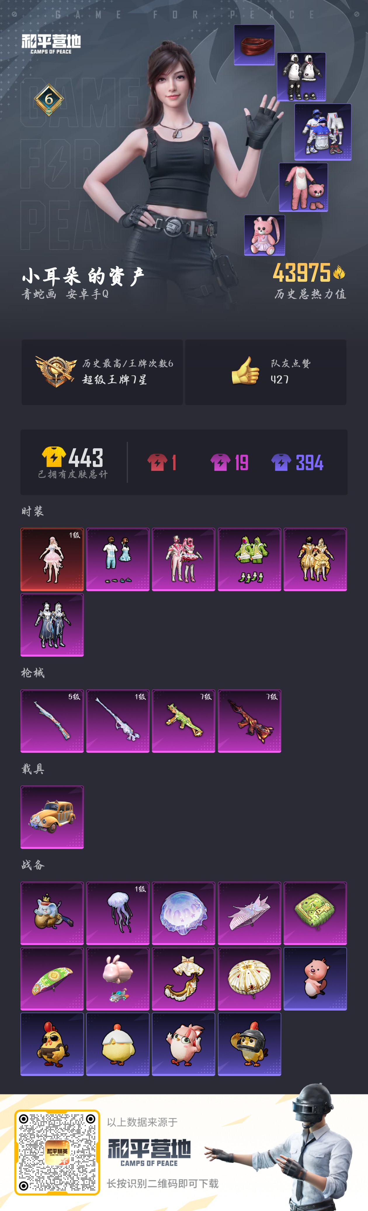 【和平精英】【txhp6387】5粉装,4特效呛,1载具,历史最高段位:超级王牌7星 王牌印记6次 热力值:43975,105套装,107呛械,145装备,67战备;套装:梦海之灵-妮芮妲,套装-馨动时刻,套装-吟月归客,套装-恐龙拽拽,套装-绚金瑰梦,套装-仲夏莫吉托,套装-白色伏地魔,套装-骑行爱好者,套装-竞技名士,套装-湖蓝色名流,套装-猛禽,套装-长空猛禽,套装-蓝色守护者,套装-旭日情侣,套装-冷焰舞者,套装-浪漫天命,套装-滨海假日,套装-人气偶像,套装-怒火燎原,套装-魅力单车,套装-绮丽涂鸦,套装-耀眼新星,套装-狂战萌兔,套装-狂沙舞者,套装-萌熊伴侣,套装-破晓战魂,套装-极地朋克,套装-幻世战舞者,套装-甜蜜菠萝,套装-暗影哥特,套装-甜蜜熊情侣,套装-缤纷果语,套装-龙魂突击队,套装-冰川特警,套装-元素星魂,套装-胖达圆圆,套装-格斗先锋,套装-麻辣教官,套装-浪漫波比,套装-仓鼠灰灰,套装-鹤鸣,套装-暴走罗小黑,套装-萌黄之夏,套装-夏日音浪,套装-探宝勇士,套装-牛气满满,套装-童话森林,套装-白糯汤圆,套装-战术大师,套装-ss18特训,套装-耀粉歌者,套装-热情海星,套装-纯真浪花,套装-ss17特训,套装-瑞龙福将,套装-团圆交子,套装-福星高照,套装-豚鼠丹丹,套装-雪兔飞飞,套装-虎虎生威吉莉,套装-异彩先驱,套装-霓虹极客,套装-绿翡凌光,套装-月蓝流光,套装-空投萌叽,套装-ss19特训,套装-兔兔白日梦,套装-飞驰魅影,套装-音速流光,套装-炫蓝之夏,套装-ss20特训,套装-ss21特训,套装-萌趣咩咩,套装-娇憨猪猪,套装-玉兔迎春,套装-ss22特训,套装-轻风白浪,套装-熠彩粉晶,套装-绯格组合,套装-ss23特训,套装-妙红点点,套装-幻彩翩翩,套装-王牌教练,套装-柠萌假日,套装-龟仙人,套装-ss25特训,套装-ss26特训,套装-空岛之星,套装-云魄琉璃,套装-ss27特训,套装-恋语绒绒,套装-ss28特训,角色-蝶吟花词,角色-湖雨初晴,套装-奶油梦幻熊,套装-海盐绵绵冰,套装-蝶变,套装-ss29特训,角色-狂花道·娜可露露,套装-ss31特训,套装-ss33特训,套装-巳巳如意,套装-ss32特训,套装-阳光菠萝,套装-雪国风尚;呛皮:scar-l-银碳小老虎,scar-l-玉兔迎春,scar-l-海盐豹豹,ac-val-乌木金纹,ac-val-天降萌叽,ac-val-梦海之灵,q-彩虹符号,q-洛神天依,q-飞驰魅影,q-纯真浪花,akm-彩虹符号,akm-虎虎生威,akm-恐龙拽拽,akm-龙的传人,蜜獾-娇憨猪猪,m16a4-幻世战舞者,7级m416-风花雪月,m416-糯团青竹,aug-耀粉歌者,aug-天降萌叽,groza-异彩先驱,groza-恐龙拽拽,groza-奶油梦幻熊,mk47-乌木金纹,mk47-妙红点点,g36c-乌木金纹,m762-瑞龙福将,m762-天降萌叽,莫辛纳甘-乌木金纹,5级kar98k-巳巳如意,kar98k-炫彩节奏,kar98k-蓝莓炮弹,kar98k-飞驰魅影,win94-夏日绵绵冰,win94-瑞龙福将,awm-恐龙拽拽,awm-纯真浪花,1级m200-梦海之灵,m200-乌木金纹,m24-樱桃泡泡,m24-乌木金纹,amr-妙红点点,amr-乌木金纹,slr-娇憨猪猪,vss-田园牧歌,vss-香桃花海,mini14-耀粉歌者,mini14-异彩先驱,mini14-香桃花海,mk12-乌木金纹,mk20-h-乌木金纹,mk14-绚金瑰梦,mk14-乌木金纹,mk14-冰河战士,uzi-炫彩节奏,uzi-娇憨猪猪,uzi-冰河战士,uzi-啾咪啾咪,uzi-梦海之灵,野牛-奶油梦幻熊,野牛-乌木金纹,mp5k-蓝莓炮弹,mp5k-异彩先驱,mp5k-乌木金纹,vect-生命誓言,vect-暗夜玫瑰,vect-田园牧歌,p90-飞驰魅影,p90-甜蜜旋律,p90-乌木金纹,汤姆逊-耀粉歌者,汤姆逊-炫彩节奏,汤姆逊-异彩先驱,汤姆逊-纯真浪花,7级ump45-恐龙拽拽,ump45-生命誓言,aa12-g-纯真浪花,s1897-飞驰魅影,s1897-精灵梦叶罗丽,spas-12-田园牧歌,spas-12-乌木金纹,s12k-瑞龙福将,s12k-娇憨猪猪,s12k-幻世战舞者,dbs-乌木金纹,mg3-瑞龙福将,mg3-幻世战舞者,mg3-乌木金纹,mg3-妙红点点,mg3-梦海之灵,mg-36-薄荷星砂,dp-28-彩虹符号,m249-彩虹符号,m249-妙红点点,蝎式手呛-奶油梦幻熊,平底锅-瑞龙福将,平底锅-空投萌叽,平底锅-异彩先驱,平底锅-飞驰魅影,平底锅-娇憨猪猪,平底锅-田园牧歌,平底锅-妙红点点,平底锅-精灵梦叶罗丽,平底锅-纯真浪花,平底锅-霁蓝缠春,破片手留单-呆爆全场,破片手留单-巳巳如意;载具:萌喵橘座;降落伞:绚金瑰梦飞行器,极意拳锋飞行器,幻海精灵飞行器;滑翔尾迹:僚机-萌兔起飞; 详情看图6印记-4.3w热力-1红-5粉-4特-1载具 1级妮芮妲 天命 哥特 粉熊 胖达圆圆 1级梦海之灵m200-7级恐龙ump45-7级风花雪月m4