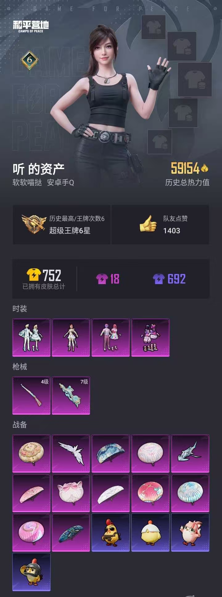 【和平精英】【lyhp20666】4粉装,2特效呛,0载具,历史最高段位:超级王牌6星 王牌印记6次 热力值:59154,162套装,195呛械,235装备,132战备;套装:套装-天使彩虹糖,套装-蓝莓炮弹,角色-圣堂之誓,套装-雪月幻音,套装-特训学院,套装-猎鹰,套装-青年教官,套装-红色运动,套装-黄色运动,套装-蓝色运动,套装-白色伏地魔,套装-黑色伏地魔,套装-冰川格斗者,套装-竞技名士,套装-深蓝色名流,套装-酒红色名流,套装-湖蓝色名流,套装-黄色名流,套装-猛禽,套装-长空猛禽,套装-冷焰舞者,套装-灼焰舞者,套装-贵族骑装,套装-滨海假日,套装-完美偶像,套装-人气偶像,套装-幻影武者,套装-街头潮人,套装-蓝彩潮人,套装-魅力单车,套装-绮丽涂鸦,套装-竞技达人朋克,套装-野性战心,套装-破晓战魂,套装-都市魅力,套装-极地朋克,套装-幻世战舞者,套装-迅捷狂鲨,套装-甜蜜熊情侣,套装-缤纷果语,套装-滨海厨神,套装-龙魂突击队,套装-冰川特警,套装-元素星魂,套装-极速红龙,套装-麻辣教官,套装-小丑鱼,套装-金环蜂王,套装-粉红小猪,套装-破蛋小黄鸡,套装-鹤鸣,套装-霓虹街区,套装-萌黄之夏,套装-超能拳王,套装-夏日音浪,套装-山经魅狐,套装-辉星之火,套装-白糯汤圆,套装-青春冒险家,套装-潮流游乐家,套装-萌趣颜团子,套装-特种颜团子,套装-战术大师,套装-ss18特训,套装-耀粉歌者,套装-暗影爵士,套装-迅捷之星,套装-治愈之星,套装-科技之星,套装-闪银刀客,套装-ss14特训,套装-吉莉礼服,套装-ss15特训,套装-ss16特训,套装-暴风机械师,套装-时空追击者,套装-暗夜魅影,套装-ss17特训,套装-智慧隐士,套装-瑞龙福将,套装-团圆交子,套装-焰山流火,套装-福星高照,套装-海龙战士,套装-虎虎生威吉莉,套装-异彩先驱,套装-霓虹极客,套装-浓情摩卡,套装-魔力冰咖,套装-空投萌叽,套装-ss19特训,套装-飞驰魅影,套装-音速流光,套装-炫蓝之夏,套装-ss20特训,套装-甜心亚梦,套装-虚音幻奏,套装-ss21特训,套装-萌趣咩咩,套装-娇憨猪猪,套装-俏皮奶喵,套装-酸甜橘柚,套装-玉兔迎春,套装-ss22特训,套装-田园牧歌,套装-轻风白浪,套装-绚烂繁星,套装-光之冒险,套装-绯格组合,套装-ss23特训,套装-莱茵河畔,套装-香榭午后,套装-妙红点点,套装-幻彩翩翩,套装-王牌教练,套装-柠萌假日,套装-青玉碎影,套装-ss24特训,套装-春野茶蘼,套装-ss25特训,套装-惊鸿侠骨,套装-锦衣飞扬,套装-香桃花海,套装-果汁能量,套装-龙的传人,套装-ss26特训,套装-空岛之星,套装-童真绒兔,套装-恋语绒绒,角色-粉雾星云,套装-航行童话,套装-蝶变,套装-雪夜云雾,套装-ss29特训,套装-雏菊兔兔,套装-萝兰蝴蝶,角色-摩登魅猫,套装-星途旅人,套装-ss30特训,套装-青团波波,套装-糖糖葫芦,套装-小鸟芋圆,套装-绒宝小鹅,套装-墨青刃影,套装-ss31特训,套装-鱼渊荷华,套装-燕燕于飞,套装-紫幽梦,套装-粉恋花,套装-晶辉守护,套装-ss33特训,套装-云朵鹅,套装-巳巳如意,套装-ss32特训,套装-风舞幻音,套装-蓝冰羽,套装-雪绒豹,套装-大橘大利,角色-鲛海歌灵,套装-星渊小夜曲,角色-玫纹锢梦,套装-ss34特训;呛皮:aug-耀粉歌者,aug-青春冒险家,aug-圣光天使,aug-异域银装,ac-val-甜心亚梦,ac-val-彩虹甜喵,ac-val-天降萌叽,蜜獾-娇憨猪猪,蜜獾-天降萌叽,蜜獾-糖糖葫芦,蜜獾-乌木金纹,akm-灼热熔岩,akm-破晓战魂,akm-霓虹街区,akm-夜灯,akm-彩虹符号,akm-萌趣颜团子,akm-虎虎生威,akm-墨染幽兰,akm-龙的传人,akm-星月云朵,famas-乌木金纹,groza-春暖花开,groza-治愈之星,groza-林间仙鹿,groza-彩虹符号,groza-异彩先驱,groza-田园牧歌,m762-绯红前夜,m762-瑞龙福将,m762-彩虹甜喵,m762-暗夜鎏金,m762-天降萌叽,m762-雏菊兔兔,m762-云朵鹅,m16a4-甜心亚梦,m16a4-幻世战舞者,m16a4-千金淑猫,g36c-时空追击者,g36c-乌木金纹,mk47-青春冒险家,mk47-乌木金纹,mk47-妙红点点,scar-l-红色方程式,scar-l-黄金龙骨,scar-l-甜蜜誓约,scar-l-炫彩节奏,m416-蓝色火焰,m416-绯红前夜,m416-红色方程式,m416-糯团青竹,q-飞驰魅影,4级kar98k-巳巳如意,kar98k-彩虹符号,kar98k-炫彩节奏,kar98k-灵符少年,kar98k-蓝莓炮弹,kar98k-飞驰魅影,kar98k-2b战斗服款,kar98k-星穹咏叹调,kar98k-乌木金纹,amr-妙红点点,amr-乌木金纹,m24-治愈之星,m24-幻彩电音,m24-乌木金纹,莫辛纳甘-乌木金纹,svd-云朵鹅,m200-惊鸿侠骨,m200-乌木金纹,win94-瑞龙福将,mini14-异彩先驱,mini14-筑梦精灵,mini14-旋转彩虹,mini14-香桃花海,mini14-雏菊兔兔,mk14-山经魅狐,mk14-治愈之星,mk14-乌木金纹,mk14-冰河战士,mk14-紫幽梦,vss-田园牧歌,vss-香桃花海,vss-星月云朵,m417-惊鸿侠骨,qbu-青春冒险家,qbu-烈焰拳霸,mk20-h-墨染幽兰,mk20-h-糖糖葫芦,mk20-h-乌木金纹,slr-娇憨猪猪,slr-金丰海韵,sks-时空追击者,mp5k-蓝莓炮弹,mp5k-异彩先驱,mp5k-乌木金纹,野牛-夜灯,野牛-青春冒险家,野牛-雏菊兔兔,野牛-燕燕于飞,野牛-乌木金纹,uzi-众神之王,uzi-炫彩节奏,uzi-娇憨猪猪,uzi-墨染幽兰,uzi-冰河战士,汤姆逊-花间之火,汤姆逊-耀粉歌者,汤姆逊-异彩先驱,汤姆逊-环太平洋,vect-彩虹符号,vect-治愈之星,vect-香水柠檬,vect-田园牧歌,vect-音爆索尼克,vect-燕燕于飞,ump45-蓝色火焰,ump45-生命誓言,ump45-时空追击者,ump45-糖糖葫芦,ump45-绒宝小鹅,7级p90-金丰海韵,p90-飞驰魅影,p90-巳巳如意,p90-乌木金纹,dbs-时空追击者,dbs-甜心亚梦,dbs-第五大道,s686-生命誓言,s686-巳巳如意,s12k-夏日绵绵冰,s12k-香水柠檬,s12k-龙宫之主,s12k-瑞龙福将,s12k-娇憨猪猪,s12k-幻世战舞者,s12k-玩趣呆呆,s12k-极意拳锋,spa