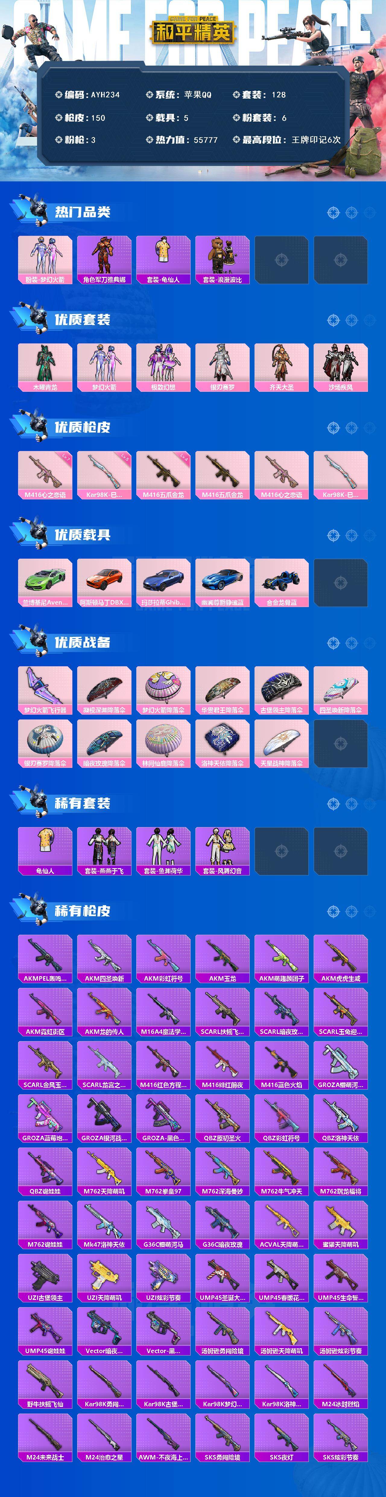 [15979479]【特价出售/店主推荐】苹果 手q-6粉装-3特效呛-5载具-1粉色飞行器-55777热力值-6王牌印记-128套装-150呛皮 【热门品类】:粉装-梦幻火箭,角色-军刀雅典娜,套装-龟仙人,套装-浪漫波比 【粉色套装】:粉装-木曜青龙,粉装-梦幻火箭,粉装-极致幻想,粉装-银刃赛罗,粉装-齐天大圣,粉装-沙场疾风 【粉色呛皮等级】:m416-五爪金龙四级,m416-心之恋语七级,kar98k-巳巳如意五级 【粉色载具】:兰博基尼aventad svj(翡翠绿),阿斯顿马丁dbx(橙),玛莎拉蒂ghibli(蓝),幽澜尊爵(静谧蓝),合金龙骨(蓝) 【粉色呛皮】:m416-五爪金龙,m416-心之恋语,kar98k-巳巳如意 【粉色飞行器】:梦幻火箭飞行器 【粉色降落伞】:凝视深渊降落伞,梦幻火箭降落伞,华贵君王降落伞,古堡领主降落伞,四圣焕新降落伞,银刃赛罗降落伞,暗夜玫瑰降落伞,林间仙鹿降落伞,洛神天依降落伞,天星战神降落伞 【稀有套装】:套装-龟仙人,套装-燕燕于飞,套装-鱼渊荷华,套装-风舞幻音 【稀有呛皮】:akm-pel轰鸣竞梦者,akm-四圣焕新,akm-彩虹符号,akm-玉龙,akm-萌趣颜团子,akm-虎虎生威,akm-霓虹街区,akm-龙的传人,m16a4-魔法学院,scar-l-扶摇飞仙,scar-l-暗夜玫瑰,scar-l-玉兔迎春,scar-l-金风玉露,scar-l-龙宫之主,m416-红色方程式,m416-绯红前夜,m416-蓝色火焰,groza-懵萌河马,groza-蓝莓炮弹,groza-银河战甲,groza-黑色刀锋,q-原初圣火,q-彩虹符号,q-洛神天依,q-诡娃娃,m762-天降萌叽,m762-拳皇97,m762-深海曼妙,m762-牛气冲天,m762-瑞龙福将,m762-诡娃娃,mk47-洛神天依,g36c-懵萌河马,g36c-暗夜玫瑰,ac-val-天降萌叽,蜜獾-天降萌叽,uzi-古堡领主,uzi-天降萌叽,uzi-炫彩节奏,ump45-圣诞大吉,ump45-春暖花开,ump45-生命誓言,ump45-诡娃娃,vect-暗夜玫瑰,vect-黑色刀锋,汤姆逊-勇闯险境,汤姆逊-天降萌叽,汤姆逊-炫彩节奏,野牛-扶摇飞仙,kar98k-勇闯险境,kar98k-古堡领主,kar98k-梦