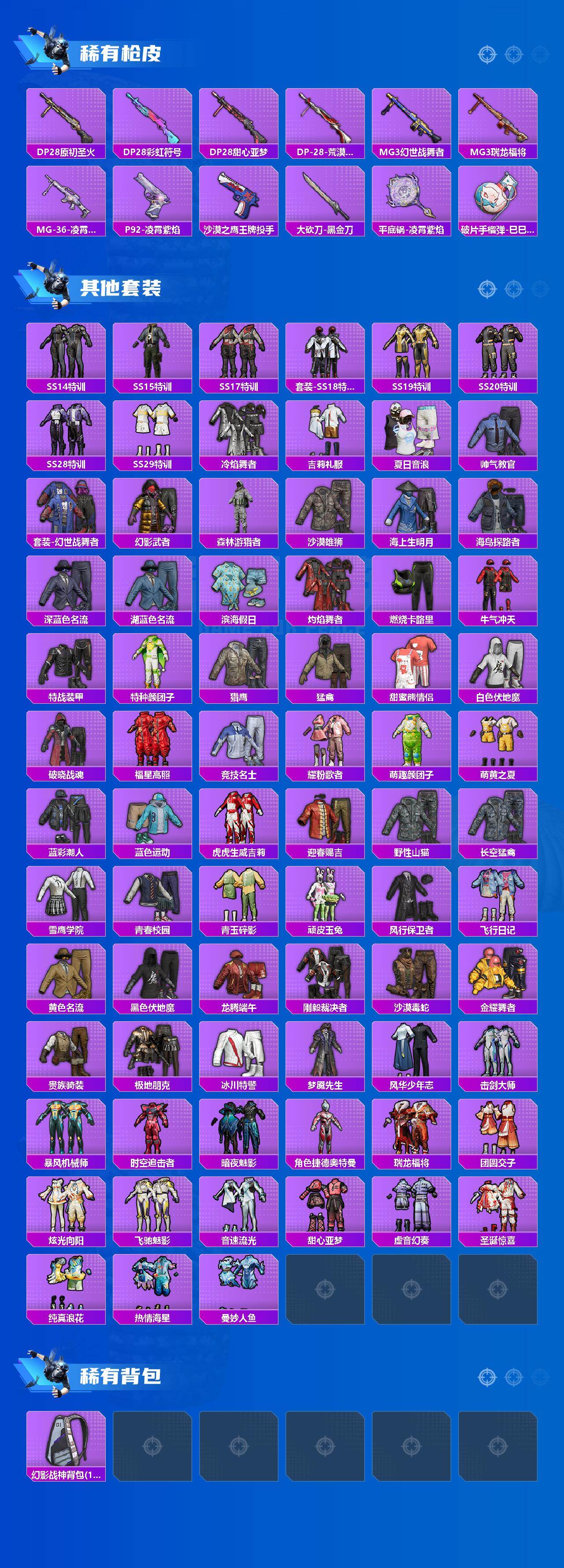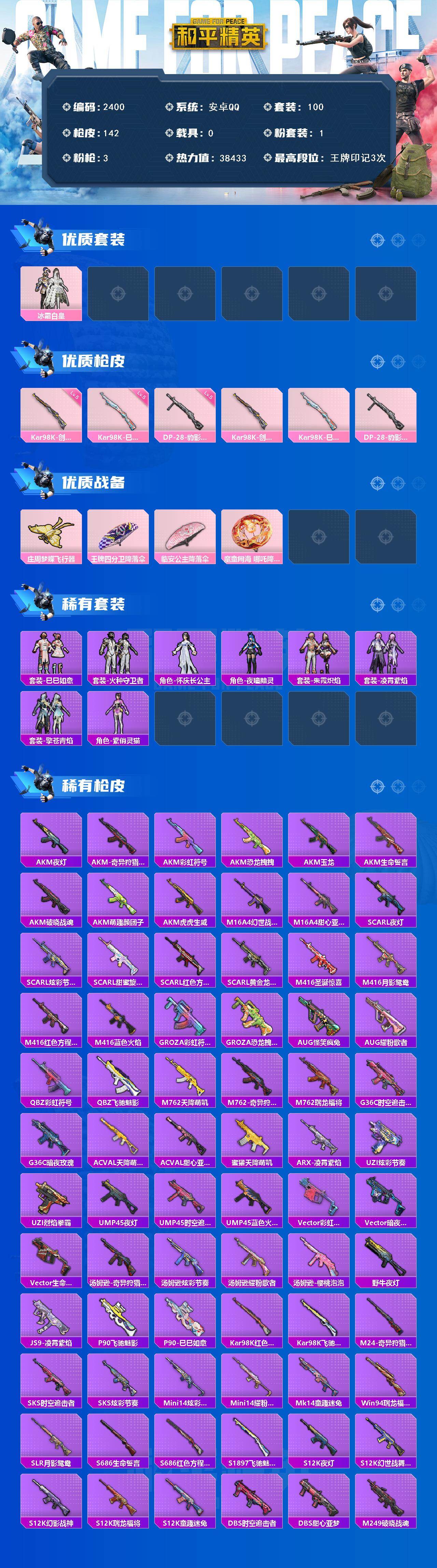 安卓 手q-1粉装-3特效呛-0载具-1粉色飞行器-38433热力值-3王牌印记-100套装-142呛皮 【粉色套装】:粉装-冰霜白皇 【粉色呛皮等级】:kar98k-创世·救赎五级,kar98k-巳巳如意五级,dp-28-豹影疾电五级 【粉色呛皮】:kar98k-创世·救赎,kar98k-巳巳如意,dp-28-豹影疾电 【粉色飞行器】:庄周梦蝶飞行器 【粉色降落伞】:王牌四分卫降落伞,临安公主降落伞,魔童闹海 哪吒降落伞 【稀有套装】:套装-巳巳如意,套装-火种守卫者,角色-怀庆长公主,角色-夜瞳黯灵,套装-朱霞炽焰,套装-凌霄紫焰,套装-擎苍青焰,角色-紫俏灵猫 【稀有呛皮】:akm-夜灯,akm-奇异狩猎者,akm-彩虹符号,akm-恐龙拽拽,akm-玉龙,akm-生命誓言,akm-破晓战魂,akm-萌趣颜团子,akm-虎虎生威,m16a4-幻世战舞者,m16a4-甜心亚梦,scar-l-夜灯,scar-l-炫彩节奏,scar-l-甜蜜旋律,scar-l-红色方程式,scar-l-黄金龙骨,m416-圣诞惊喜,m416-月影鸳鸯,m416-红色方程式,m416-蓝色火焰,groza-彩虹符号,groza-恐龙拽拽,aug-怪笑疯兔,aug-耀粉歌者,q-彩虹符号,q-飞驰魅影,m762-天降萌叽,m762-奇异狩猎者,m762-瑞龙福将,g36c-时空追击者,g36c-暗夜玫瑰,ac-val-天降萌叽,ac-val-甜心亚梦,蜜獾-天降萌叽,arx-凌霄紫焰,uzi-炫彩节奏,uzi-烈焰拳霸,ump45-夜灯,ump45-时空追击者,ump45-蓝色火焰,vect-彩虹符号,vect-暗夜玫瑰,vect-生命誓言,汤姆逊-奇异狩猎者,汤姆逊-炫彩节奏,汤姆逊-耀粉歌者,汤姆逊-樱桃泡泡,野牛-夜灯,js9-凌霄紫焰,p90-飞驰魅影,p90-巳巳如意,kar98k-红色方程式,kar98k-飞驰魅影,m24-奇异狩猎者,sks-时空追击者,sks-炫彩节奏,mini14-炫彩节奏,mini14-耀粉歌者,mk14-童趣迷兔,win94-瑞龙福将,slr-月影鸳鸯,s686-生命誓言,s686-红色方程式,s1897-飞驰魅影,s12k-瑞龙福将,s12k-童趣迷兔,s12k-夜灯,s12k-幻世战舞者,s12k-幻影战神,dbs-时空追击者,dbs-甜心亚梦,m249-破晓战魂,dp-28-原初圣火,dp-28-彩虹符号,dp-28-甜心亚梦,dp-28-荒漠赏金,mg3-幻世战舞者,mg3-瑞龙福将,mg-36-凌霄紫焰,p92-凌霄紫焰,沙墨之鹦-王牌投手,大砍刀-黑金刀,平底锅-凌霄紫焰,破片手留单-巳巳如意 【其他套装】:套装-ss14特训,套装-ss15特训,套装-ss17特训,套装-ss18特训,套装-ss19特训,套装-ss20特训,套装-ss28特训,套装-ss29特训,套装-冷焰舞者,套装-吉莉礼服,套装-夏日音浪,套装-帅气教官,套装-幻世战舞者,套装-幻影武者,套装-森林游猎者,套装-沙漠雄狮,套装-海上生明月,套装-海岛探路者,套装-深蓝色名流,套装-湖蓝色名流,套装-滨海假日,套装-灼焰舞者,套装-燃烧卡路里,套装-牛气冲天,套装-特战装甲,套装-特种颜团子,套装-猎鹰,套装-猛禽,套装-甜蜜熊情侣,套装-白色伏地魔,套装-破晓战魂,套装-福星高照,套装-竞技名士,套装-耀粉歌者,套装-萌趣颜团子,套装-萌黄之夏,套装-蓝彩潮人,套装-蓝色运动,套装-虎虎生威吉莉,套装-迎春赐吉,套装-野性山猫,套装-长空猛禽,套装-雪鹰学院,套装-青春校园,套装-青玉碎影,套装-顽皮玉兔,套装-风行保卫者,套装-飞行日记,套装-黄色名流,套装-黑色伏地魔,套装-龙腾端午,套装-刚毅裁决者,套装-沙漠毒蛇,套装-金耀舞者,套装-贵族骑装,套装-极地朋克,套装-冰川特警,套装-梦魇先生,套装-风华少年志,套装-击剑大师,套装-暴风机械师,套装-时空追击者,套装-暗夜魅影,角色-捷德奥特曼,套装-瑞龙福将,套装-团圆交子,套装-炫光向阳,套装-飞驰魅影,套装-音速流光,套装-甜心亚梦,套装-虚音幻奏,套装-圣诞惊喜,套装-纯真浪花,套装-热情海星,套装-曼妙人鱼 【稀有背包】:幻影战神背包1级 【