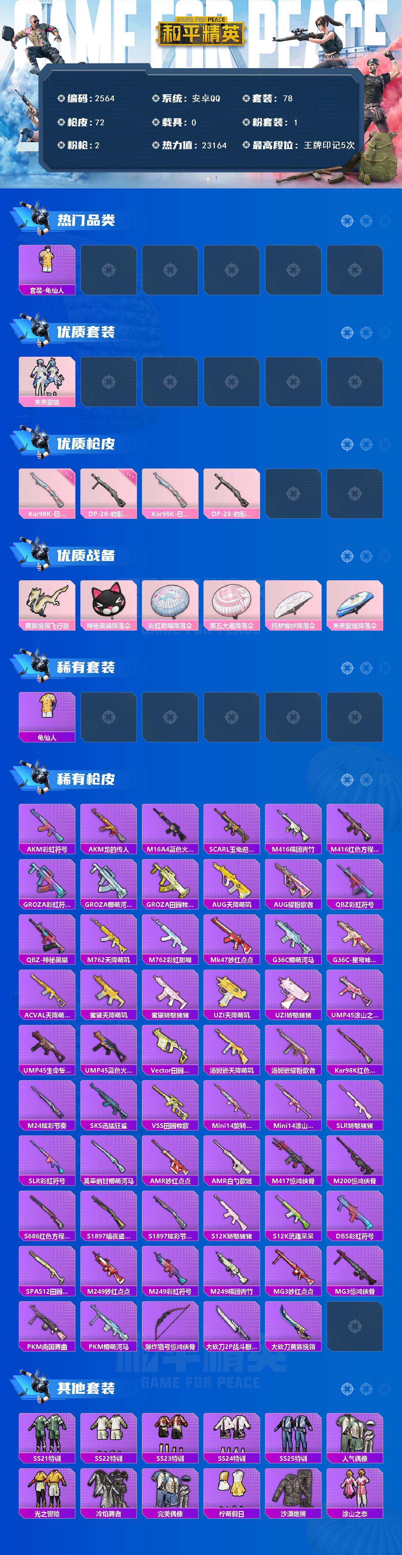 安卓 手q-1粉装-2特效呛-0载具-1粉色飞行器-23164热力值-5王牌印记-78套装-72呛皮 【热门品类】:套装-龟仙人 【粉色套装】:粉装-未来歌姬 【粉色呛皮等级】:kar98k-巳巳如意一级,dp-28-豹影疾电一级 【粉色呛皮】:kar98k-巳巳如意,dp-28-豹影疾电 【粉色飞行器】:黄族统领飞行器 【粉色降落伞】:神秘黑猫降落伞,彩虹甜喵降落伞,第五大道降落伞,纯梦嫁纱降落伞,未来歌姬降落伞 【稀有套装】:套装-龟仙人 【稀有呛皮】:akm-彩虹符号,akm-龙的传人,m16a4-蓝色火焰,scar-l-玉兔迎春,m416-糯团青竹,m416-红色方程式,groza-彩虹符号,groza-懵萌河马,groza-田园牧歌,aug-天降萌叽,aug-耀粉歌者,q-彩虹符号,q-神秘黑猫,m762-天降萌叽,m762-彩虹甜喵,mk47-妙红点点,g36c-懵萌河马,g36c-星穹咏叹调,ac-val-天降萌叽,蜜獾-天降萌叽,蜜獾-娇憨猪猪,uzi-天降萌叽,uzi-娇憨猪猪,ump45-涂山之恋,ump45-生命誓言,ump45-蓝色火焰,vect-田园牧歌,汤姆逊-天降萌叽,汤姆逊-耀粉歌者,kar98k-红色方程式,m24-炫彩节奏,sks-迅猛狂鲨,vss-田园牧歌,mini14-旋转彩虹,mini14-涂山之恋,slr-娇憨猪猪,slr-彩虹符号,莫辛纳甘-懵萌河马,amr-妙红点点,amr-白勺歌姬,m417-惊鸿侠骨,m200-惊鸿侠骨,s686-红色方程式,s1897-暗夜鎏金,s1897-炫彩节奏,s12k-玩趣呆呆,s12k-娇憨猪猪,dbs-彩虹符号,spas-12-田园牧歌,m249-妙红点点,m249-彩虹符号,m249-糯团青竹,mg3-妙红点点,mg3-惊鸿侠骨,pkm-南国舞曲,pkm-懵萌河马,爆炸猎弓-惊鸿侠骨,大砍刀-2p战斗服款,大砍刀-黄族统领 【其他套装】:套装-ss21特训,套装-ss22特训,套装-ss23特训,套装-ss24特训,套装-ss25特训,套装-人气偶像,套装-光之冒险,套装-冷焰舞者,套装-完美偶像,套装-柠萌假日,套装-沙漠雄狮,套装-涂山之恋,套装-湖蓝色名流,套装-灼焰舞者,套装-牛气冲天,套装-牛气满满,套装-特训学院,套装-猛禽,套装-玉兔迎春,套装-王牌教练,套装-甜心信使,套装-甜蜜熊情侣,套装-白熊同盟,套装-白色伏地魔,套装-破蛋小黄鸡,套装-竞技名士,套装-竞技达人朋克,套装-红色运动,套装-绮丽涂鸦,套装-绯格组合,套装-耀粉歌者,套装-荣耀,套装-萌黄之夏,套装-蓝彩潮人,套装-蓝色运动,套装-街头潮人,套装-都市魅力,套装-酒红色名流,套装-野性战心,套装-长空猛禽,套装-青年教官,套装-青涩时光,套装-青玉碎影,套装-飞行日记,套装-魅力单车,套装-鹤鸣,套装-麻辣教官,套装-黄色伏地魔,套装-黄色运动,套装-黑色伏地魔,套装-龙的传人,套装-龟仙人,套装-坚韧舞者,套装-智慧之神,套装-风华少年志,套装-纯白誓言,套装-团圆交子,套装-娇憨猪猪,套装-萌趣咩咩,套装-俏皮奶喵,套装-酸甜橘柚,套装-田园牧歌,套装-轻风白浪,套装-和煦暖阳,套装-极光玫瑰,套装-妙红点点,套装-灵蜜圈圈,套装-幻彩翩翩,套装-白兰地假日,套装-懵萌河马,套装-神气柴柴,套装-甜梦熊熊,套装-元气发射,套装-惊鸿侠骨,套装-锦衣飞扬,套装-春野茶蘼 【