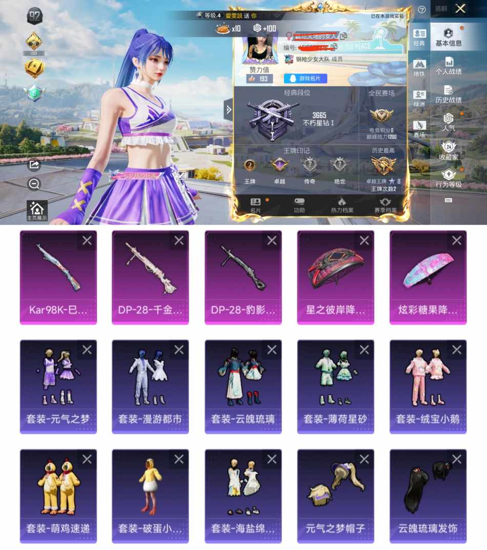 qy367 极品女号 3特效呛2满级 2太阳 dp-28-千金淑猫 (5级)【有安全提醒】 安卓q区-3特效呛-16240热力值-2王牌印记-55套装-54呛皮【地铁3天赋2满天赋】 1淘汰特效: scar-l淘汰效果-海盐假日 【特效呛等级】:dp-28-千金淑猫五级dp-28-千金淑猫 dp-28-豹影疾电 (满级) kar98k-巳巳如意五级kar98k-巳巳如意【优质武器皮