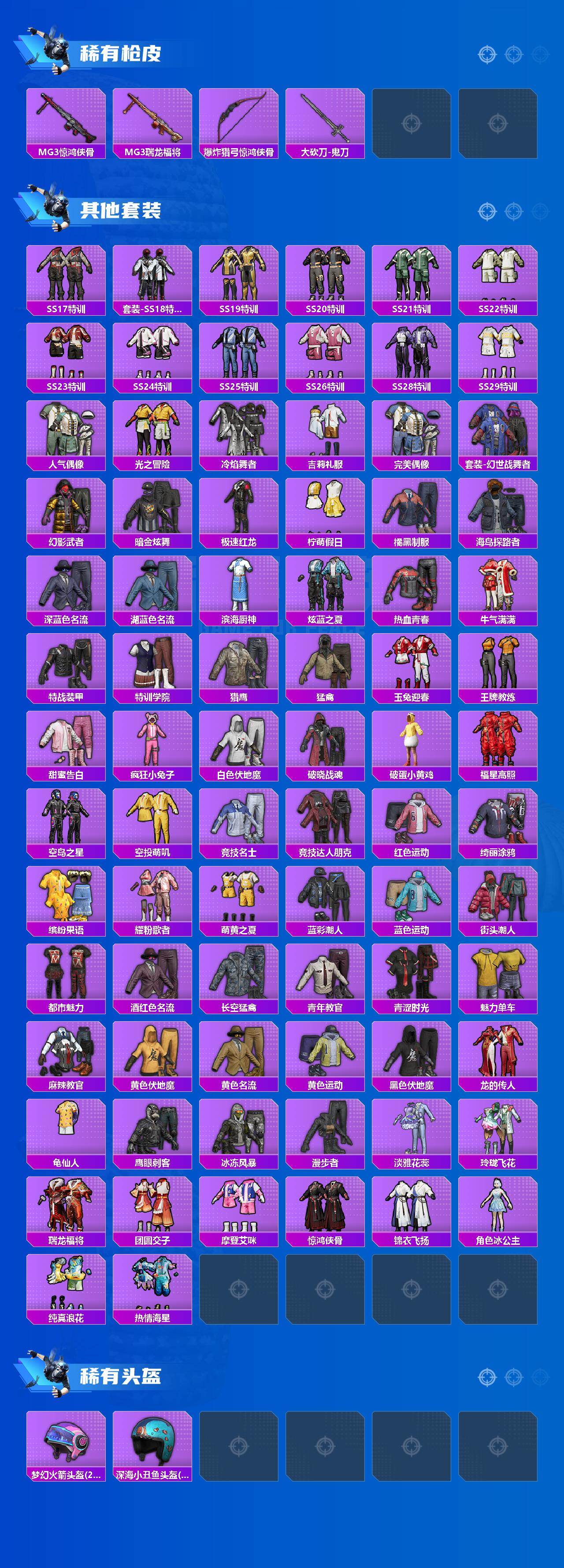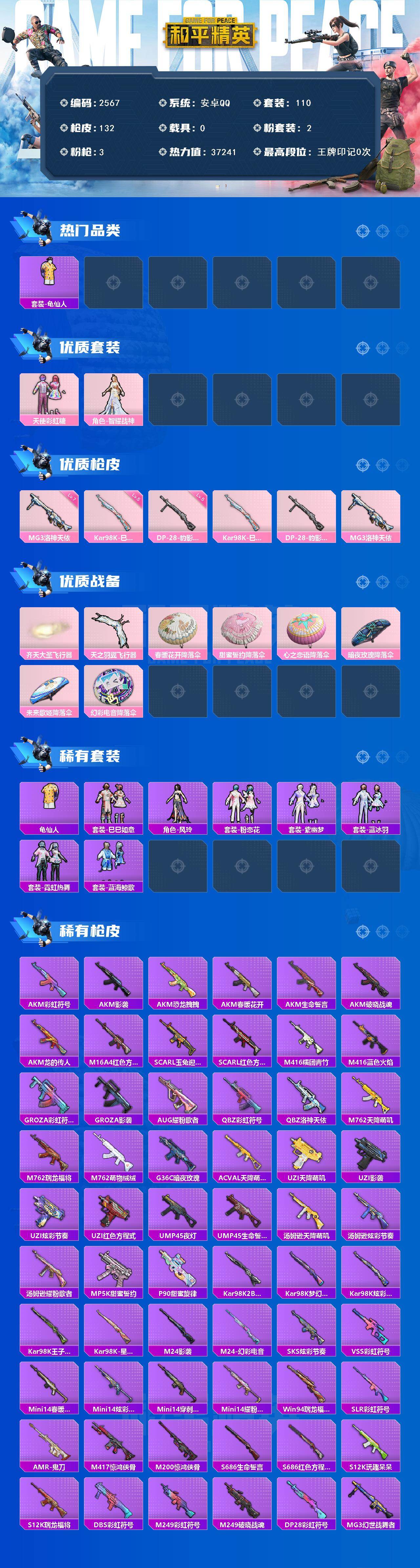 安卓 手q-2粉装-3特效呛-0载具-3粉色飞行器-37241热力值-1王牌印记-110套装-132呛皮 【热门品类】:套装-龟仙人 【粉色套装】:粉装-天使彩虹糖,角色-智耀战神 【粉色呛皮等级】:kar98k-巳巳如意五级,dp-28-豹影疾电五级,mg3-洛神天依七级 【粉色呛皮】:kar98k-巳巳如意,dp-28-豹影疾电,mg3-洛神天依 【粉色飞行器】:齐天大圣飞行器,天之羽翼飞行器 【粉色降落伞】:春暖花开降落伞,甜蜜誓约降落伞,心之恋语降落伞,暗夜玫瑰降落伞,未来歌姬降落伞,幻彩电音降落伞 【稀有套装】:套装-龟仙人,套装-巳巳如意,角色-风玲,套装-粉恋花,套装-紫幽梦,套装-蓝冰羽,套装-霓虹热舞,套装-蓝海鲸歌 【稀有呛皮】:akm-彩虹符号,akm-影袭,akm-恐龙拽拽,akm-春暖花开,akm-生命誓言,akm-破晓战魂,akm-龙的传人,m16a4-红色方程式,scar-l-玉兔迎春,scar-l-红色方程式,m416-糯团青竹,m416-蓝色火焰,groza-彩虹符号,groza-影袭,aug-耀粉歌者,q-彩虹符号,q-洛神天依,m762-天降萌叽,m762-瑞龙福将,m762-萌物绒绒,g36c-暗夜玫瑰,ac-val-天降萌叽,uzi-天降萌叽,uzi-影袭,uzi-炫彩节奏,uzi-红色方程式,ump45-夜灯,ump45-生命誓言,汤姆逊-天降萌叽,汤姆逊-炫彩节奏,汤姆逊-耀粉歌者,mp5k-甜蜜誓约,p90-甜蜜旋律,kar98k-2b战斗服款,kar98k-梦幻火箭,kar98k-炫彩节奏,kar98k-王子的夏天,kar98k-星穹咏叹调,m24-影袭,m24-幻彩电音,sks-炫彩节奏,vss-彩虹符号,mini14-春暖花开,mini14-炫彩节奏,mini14-穿刺龙虾,mini14-耀粉歌者,win94-瑞龙福将,slr-彩虹符号,amr-鬼刀,m417-惊鸿侠骨,m200-惊鸿侠骨,s686-生命誓言,s686-红色方程式,s12k-玩趣呆呆,s12k-瑞龙福将,dbs-彩虹符号,m249-彩虹符号,m249-破晓战魂,dp-28-彩虹符号,mg3-幻世战舞者,mg3-惊鸿侠骨,mg3-瑞龙福将,爆炸猎弓-惊鸿侠骨,大砍刀-鬼刀 【其他套装】:套装-ss17特训,套装-ss18特训,套装-ss19特训,套装-ss20特训,套装-ss21特训,套装-ss22特训,套装-ss23特训,套装-ss24特训,套装-ss25特训,套装-ss26特训,套装-ss28特训,套装-ss29特训,套装-人气偶像,套装-光之冒险,套装-冷焰舞者,套装-吉莉礼服,套装-完美偶像,套装-幻世战舞者,套装-幻影武者,套装-暗金炫舞,套装-极速红龙,套装-柠萌假日,套装-橘黑制服,套装-海岛探路者,套装-深蓝色名流,套装-湖蓝色名流,套装-滨海厨神,套装-炫蓝之夏,套装-热血青春,套装-牛气满满,套装-特战装甲,套装-特训学院,套装-猎鹰,套装-猛禽,套装-玉兔迎春,套装-王牌教练,套装-甜蜜告白,套装-疯狂小兔子,套装-白色伏地魔,套装-破晓战魂,套装-破蛋小黄鸡,套装-福星高照,套装-空岛之星,套装-空投萌叽,套装-竞技名士,套装-竞技达人朋克,套装-红色运动,套装-绮丽涂鸦,套装-缤纷果语,套装-耀粉歌者,套装-萌黄之夏,套装-蓝彩潮人,套装-蓝色运动,套装-街头潮人,套装-都市魅力,套装-酒红色名流,套装-长空猛禽,套装-青年教官,套装-青涩时光,套装-魅力单车,套装-麻辣教官,套装-黄色伏地魔,套装-黄色名流,套装-黄色运动,套装-黑色伏地魔,套装-龙的传人,套装-龟仙人,套装-鹰眼刺客,套装-冰冻风暴,套装-漫步者,套装-淡雅花蕊,套装-玲珑飞花,套装-瑞龙福将,套装-团圆交子,套装-摩登艾咪,套装-惊鸿侠骨,套装-锦衣飞扬,角色-冰公主,套装-纯真浪花,套装-热情海星 【稀有头盔】:梦幻火箭头盔2级,深海小丑鱼头盔1级 【