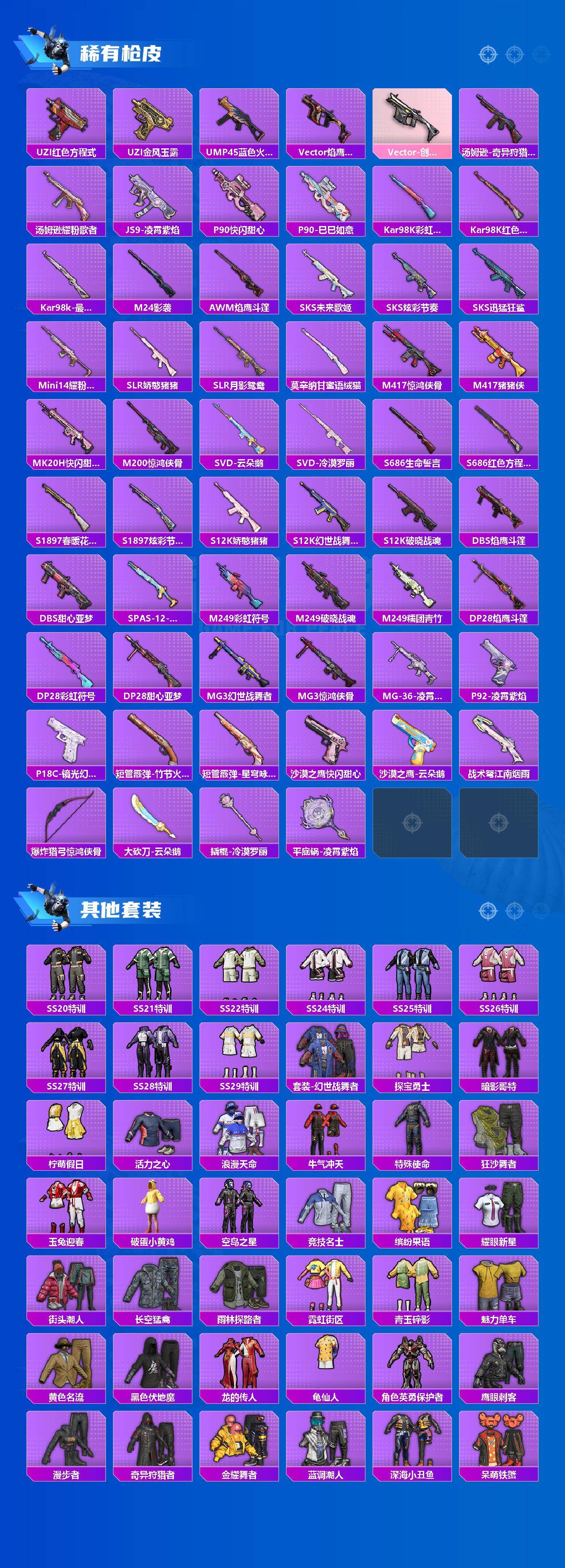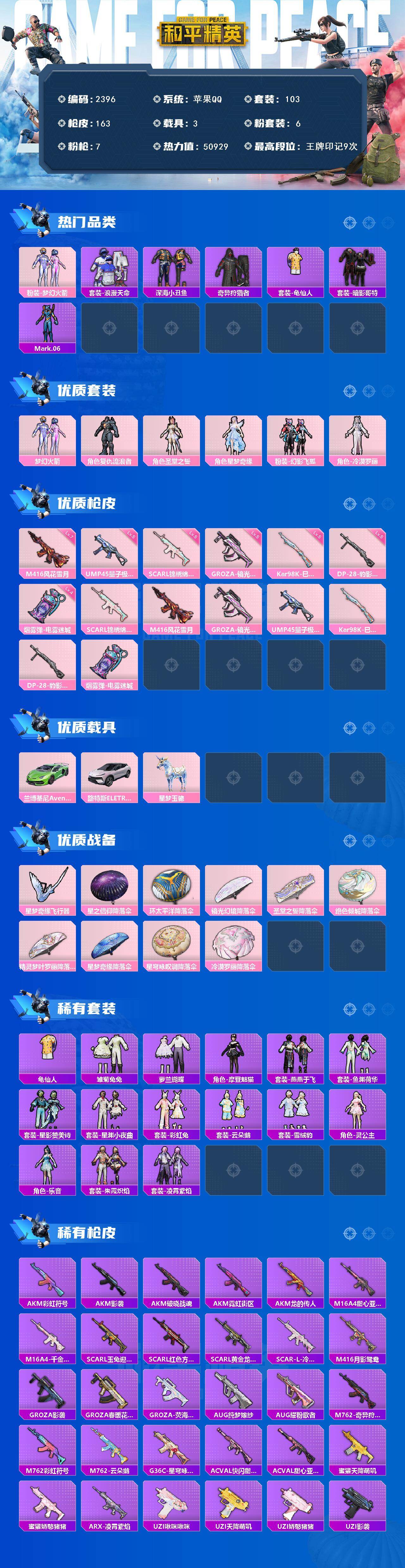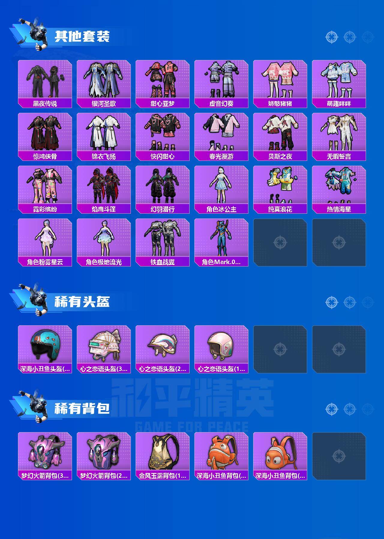 苹果 手q-6粉装-7特效呛-3载具-1粉色飞行器-50929热力值-9王牌印记-103套装-163呛皮 【热门品类】:粉装-梦幻火箭,套装-浪漫天命,套装-深海小丑鱼,套装-奇异狩猎者,套装-龟仙人,套装-暗影哥特,角色-mark.06 【粉色套装】:粉装-梦幻火箭,角色-复仇流浪者,角色-圣堂之誓,角色-星梦奇缘,粉装-幻影飞狐,角色-冷漠罗丽 【粉色呛皮等级】:scar-l-锦绣绵绵五级,m416-风花雪月七级,groza-镜光银凌五级,ump45-量子极限五级,kar98k-巳巳如意五级,dp-28-豹影疾电五级,盐雾蛋-电雾迷城四级 【粉色载具】:兰博基尼aventad svj(翡翠绿),路特斯eletre(花绽灰),星梦玉骢 【粉色呛皮】:scar-l-锦绣绵绵,m416-风花雪月,groza-镜光银凌,ump45-量子极限,kar98k-巳巳如意,dp-28-豹影疾电,盐雾蛋-电雾迷城 【粉色飞行器】:星梦奇缘飞行器 【粉色降落伞】:星之信仰降落伞,环太平洋降落伞,镜光幻境降落伞,圣堂之誓降落伞,绝色倾城降落伞,精灵梦叶罗丽降落伞,星梦奇缘降落伞,星穹咏叹调降落伞,冷漠罗丽降落伞 【稀有套装】:套装-龟仙人,套装-雏菊兔兔,套装-萝兰蝴蝶,角色-摩登魅猫,套装-燕燕于飞,套装-鱼渊荷华,套装-星影赞美诗,套装-星渊小夜曲,套装-彩虹兔,套装-云朵鹅,套装-雪绒豹,角色-灵公主,角色-乐音,套装-朱霞炽焰,套装-凌霄紫焰 【稀有呛皮】:akm-彩虹符号,akm-影袭,akm-破晓战魂,akm-霓虹街区,akm-龙的传人,m16a4-甜心亚梦,m16a4-千金淑猫,scar-l-玉兔迎春,scar-l-红色方程式,scar-l-黄金龙骨,scar-l-冷漠罗丽,m416-月影鸳鸯,groza-影袭,groza-春暖花开,groza-荧海星豚,aug-纯梦嫁纱,aug-耀粉歌者,m762-奇异狩猎者,m762-彩虹符号,m762-云朵鹅,g36c-星穹咏叹调,ac-val-快闪甜心,ac-val-甜心亚梦,蜜獾-天降萌叽,蜜獾-娇憨猪猪,arx-凌霄紫焰,uzi-啾咪啾咪,uzi-天降萌叽,uzi-娇憨猪猪,uzi-影袭,uzi-红色方程式,uzi-金风玉露,ump45-蓝色火焰,vect-焰鹰斗篷,vect-创世·救赎,汤姆逊-奇异狩猎者,汤姆逊-耀粉歌者,js9-凌霄紫焰,p90-快闪甜心,p90-巳巳如意,kar98k-彩虹符号,kar98k-红色方程式,kar98k-最终圣卫者,m24-影袭,awm-焰鹰斗篷,sks-未来歌姬,sks-炫彩节奏,sks-迅猛狂鲨,mini14-耀粉歌者,slr-娇憨猪猪,slr-月影鸳鸯,莫辛纳甘-蜜语绒猫,m417-惊鸿侠骨,m417-猪猪侠,mk20-h-快闪甜心,m200-惊鸿侠骨,svd-云朵鹅,svd-冷漠罗丽,s686-生命誓言,s686-红色方程式,s1897-春暖花开,s1897-炫彩节奏,s12k-破晓战魂,s12k-娇憨猪猪,s12k-幻世战舞者,dbs-焰鹰斗篷,dbs-甜心亚梦,spas-12-云朵鹅,m249-彩虹符号,m249-破晓战魂,m249-糯团青竹,dp-28-焰鹰斗篷,dp-28-彩虹符号,dp-28-甜心亚梦,mg3-幻世战舞者,mg3-惊鸿侠骨,mg-36-凌霄紫焰,p92-凌霄紫焰,p18c-镜光幻境,短管霰弹-竹节火铳,短管霰弹-星穹咏叹调,沙墨之鹦-快闪甜心,沙墨之鹦-云朵鹅,战术弩-江南烟雨,爆炸猎弓-惊鸿侠骨,大砍刀-云朵鹅,撬棍-冷漠罗丽,平底锅-凌霄紫焰 【其他套装】:套装-ss20特训,套装-ss21特训,套装-ss22特训,套装-ss24特训,套装-ss25特训,套装-ss26特训,套装-ss27特训,套装-ss28特训,套装-ss29特训,套装-幻世战舞者,套装-探宝勇士,套装-暗影哥特,套装-柠萌假日,套装-活力之心,套装-浪漫天命,套装-牛气冲天,套装-特殊使命,套装-狂沙舞者,套装-玉兔迎春,套装-破蛋小黄鸡,套装-空岛之星,套装-竞技名士,套装-缤纷果语,套装-耀眼新星,套装-街头潮人,套装-长空猛禽,套装-雨林探路者,套装-霓虹街区,套装-青玉碎影,套装-魅力单车,套装-黄色名流,套装-黑色伏地魔,套装-龙的传人,套装-龟仙人,角色-英勇保护者,套装-鹰眼刺客,套装-漫步者,套装-奇异狩猎者,套装-金耀舞者,套装-蓝调潮人,套装-深海小丑鱼,套装-呆萌铁蟹,套装-黑夜传说,套装-银河圣歌,套装-甜心亚梦,套装-虚音幻奏,套装-娇憨猪猪,套装-萌趣咩咩,套装-惊鸿侠骨,套装-锦衣飞扬,套装-快闪甜心,套装-春光漫游,套装-贝斯之夜,套装-无暇誓言,套装-霓彩缤纷,套装-焰鹰斗篷,套装-幻羽潜行,角色-冰公主,套装-纯真浪花,套装-热情海星,角色-粉雾星云,角色-极地流光,套装-铁血战翼,角色-mark.06 【稀有头盔】:深海小丑鱼头盔1级,心之恋语头盔3级,心之恋语头盔2级,心之恋语头盔1级 【稀有背包】:梦幻火箭背包3级,梦幻火箭背包2级,金风玉露背包1级,深海小丑鱼背包3级,深海小丑鱼背包1级 【