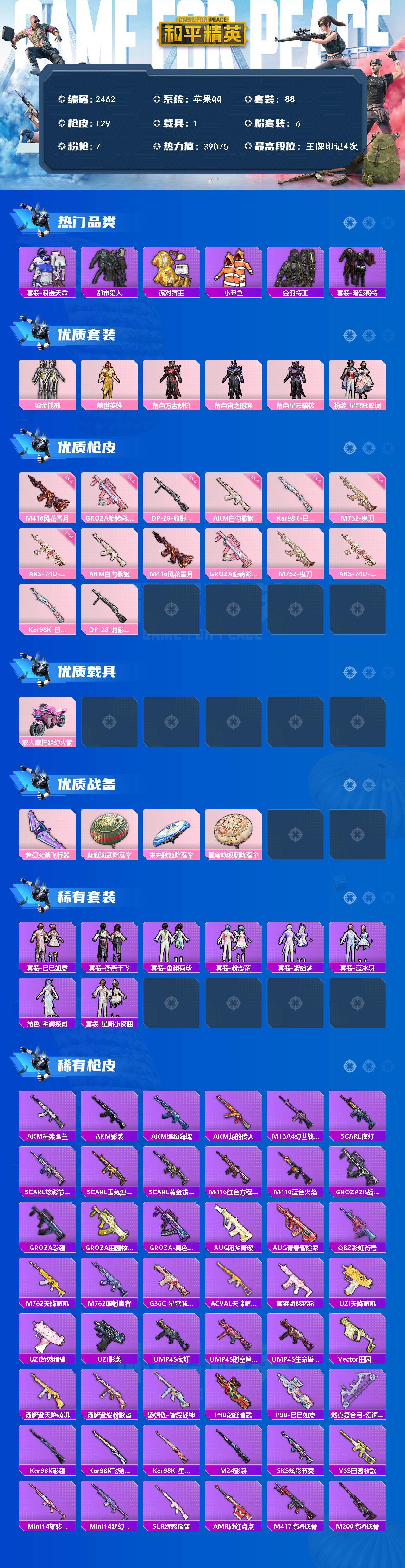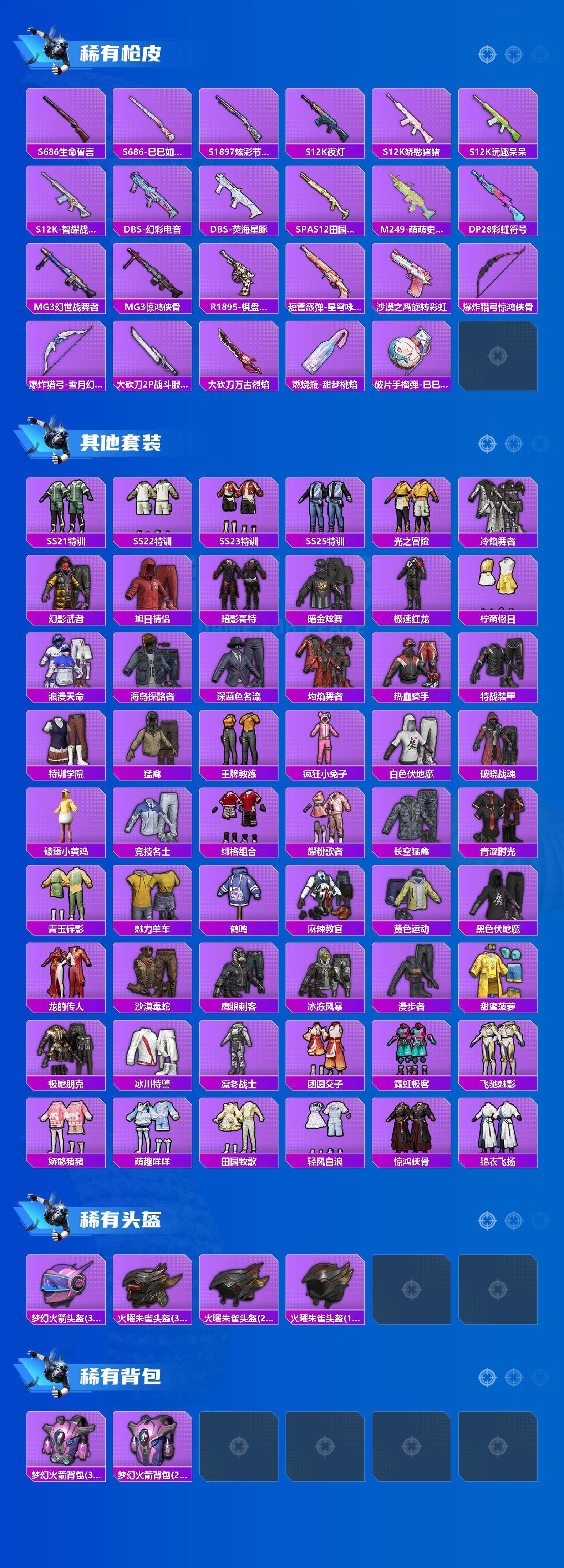 苹果 手q-6粉装-7特效呛-1载具-2粉色飞行器-39075热力值-4王牌印记-88套装-129呛皮 【热门品类】:套装-浪漫天命,套装-都市猎人,套装-派对舞王,套装-小丑鱼,套装-金羽特工,套装-暗影哥特 【粉色套装】:粉装-绚金战神,粉装-盖世英雄,角色-万古烈焰,角色-宙之时溯,角色-星云暗核,粉装-星穹咏叹调 【粉色呛皮等级】:akm-白勺歌姬四级,m416-风花雪月五级,groza-旋转彩虹五级,m762-鬼刀四级,aks-74u-星穹咏叹调四级,kar98k-巳巳如意四级,dp-28-豹影疾电五级 【粉色载具】:双人摩托-梦幻火箭 【粉色呛皮】:akm-白勺歌姬,m416-风花雪月,groza-旋转彩虹,m762-鬼刀,aks-74u-星穹咏叹调,kar98k-巳巳如意,dp-28-豹影疾电 【粉色飞行器】:梦幻火箭飞行器 【粉色降落伞】:翩跹演武降落伞,未来歌姬降落伞,星穹咏叹调降落伞,炫彩糖果降落伞 【稀有套装】:套装-巳巳如意,套装-雪国风尚,套装-燕燕于飞,套装-鱼渊荷华,套装-粉恋花,套装-紫幽梦,套装-蓝冰羽,角色-幽澜祭司,套装-星渊小夜曲,套装-炫彩糖果 【稀有呛皮】:aug-冰晶雪宝,akm-墨染幽兰,akm-影袭,akm-缤纷海域,akm-龙的传人,m16a4-幻世战舞者,scar-l-夜灯,scar-l-炫彩节奏,scar-l-玉兔迎春,scar-l-黄金龙骨,m416-红色方程式,m416-蓝色火焰,groza-2b战斗服款,groza-影袭,groza-田园牧歌,groza-黑色刀锋,aug-闲梦青缨,aug-青春冒险家,q-彩虹符号,m762-天降萌叽,m762-镭射皇者,g36c-星穹咏叹调,ac-val-天降萌叽,蜜獾-娇憨猪猪,uzi-天降萌叽,uzi-娇憨猪猪,uzi-影袭,ump45-夜灯,ump45-时空追击者,ump45-生命誓言,vect-田园牧歌,汤姆逊-天降萌叽,汤姆逊-耀粉歌者,汤姆逊-智耀战神,p90-翩跹演武,燃点复合弓-幻海仙踪,p90-巳巳如意,kar98k-影袭,kar98k-飞驰魅影,kar98k-星穹咏叹调,m24-影袭,sks-炫彩节奏,vss-田园牧歌,mini14-旋转彩虹,mini14-梦幻火箭,slr-娇憨猪猪,amr-妙红点点,m417-惊鸿侠骨,m200-惊鸿侠骨,s686-生命誓言,s686-巳巳如意,s1897-炫彩节奏,s12k-玩趣呆呆,s12k-夜灯,s12k-娇憨猪猪,s12k-智耀战神,dbs-荧海星豚,dbs-幻彩电音,spas-12-田园牧歌,m249-萌萌史莱姆,dp-28-彩虹符号,mg3-幻世战舞者,mg3-惊鸿侠骨,r1895-棋盘冕主,短管霰弹-星穹咏叹调,沙墨之鹦-旋转彩虹,爆炸猎弓-惊鸿侠骨,爆炸猎弓-雪月幻音,大砍刀-2p战斗服款,大砍刀-万古烈焰,燃烧瓶-甜梦桃焰,破片手留单-巳巳如意 【其他套装】:套装-ss21特训,套装-ss22特训,套装-ss23特训,套装-ss25特训,套装-光之冒险,套装-冷焰舞者,套装-幻影武者,套装-旭日情侣,套装-暗影哥特,套装-暗金炫舞,套装-极速红龙,套装-柠萌假日,套装-浪漫天命,套装-海岛探路者,套装-深蓝色名流,套装-灼焰舞者,套装-热血骑手,套装-特战装甲,套装-特训学院,套装-猛禽,套装-王牌教练,套装-疯狂小兔子,套装-白色伏地魔,套装-破晓战魂,套装-破蛋小黄鸡,套装-竞技名士,套装-绯格组合,套装-耀粉歌者,套装-长空猛禽,套装-青涩时光,套装-青玉碎影,套装-魅力单车,套装-鹤鸣,套装-麻辣教官,套装-黄色运动,套装-黑色伏地魔,套装-龙的传人,套装-沙漠毒蛇,套装-鹰眼刺客,套装-冰冻风暴,套装-漫步者,套装-甜蜜菠萝,套装-极地朋克,套装-冰川特警,套装-凛冬战士,套装-团圆交子,套装-霓虹极客,套装-飞驰魅影,套装-娇憨猪猪,套装-萌趣咩咩,套装-田园牧歌,套装-轻风白浪,套装-惊鸿侠骨,套装-锦衣飞扬 【稀有头盔】:梦幻火箭头盔3级,火曜朱雀头盔3级,火曜朱雀头盔2级,火曜朱雀头盔1级 【稀有背包】:梦幻火箭背包3级,梦幻火箭背包2级 【