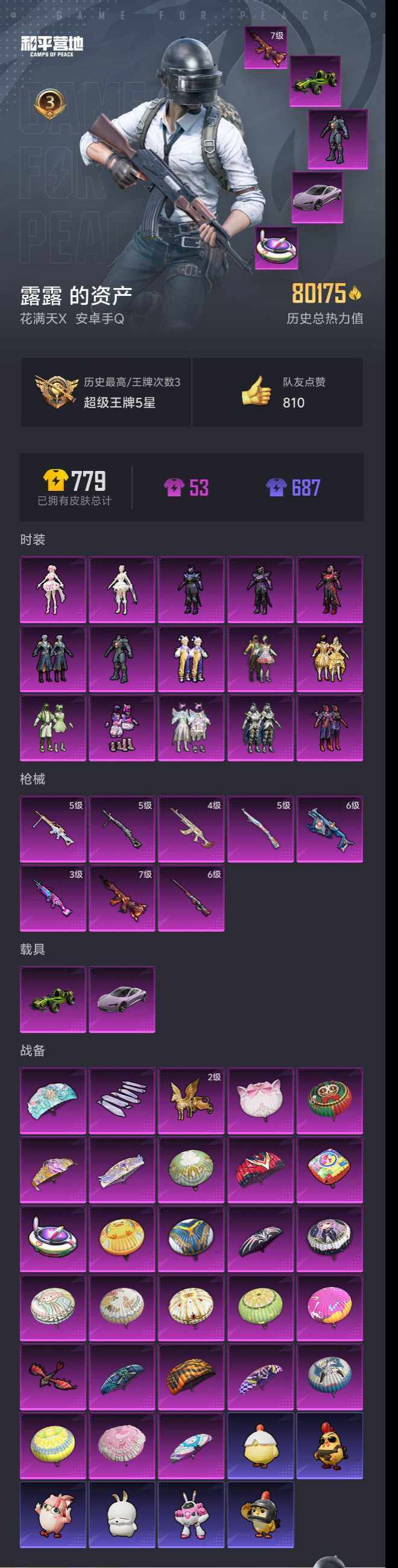 可二次,安卓q,80175热力值【详细看图,王者连体v9,349皮3典藏33传说115史诗1省标5市标7县标游走33段,猴子差1全皮,】【热门品类】:套装-深海小丑鱼,套装-小丑鱼,角色-军刀雅典娜,套装-胖达圆圆,套装-浪漫波比【粉色载具】:特斯拉roadster(沁心粉),合金龙骨(绿)【粉色套装】:粉装-蝶舞迷情,粉装-星之彼岸,粉装-银龙傲海,粉装-山涧鹿灵,粉装-蓝莓炮弹,粉装-青葱仙萝,粉装-绚金瑰梦,粉装-精灵娃娃,角色-复仇流浪者,粉装-青空秋雨,角色-万古烈焰,角色-宙之时溯,角色-星云暗核,角色-千金淑猫,角色-奇迹舞步 美雪【粉色呛皮等级】:m416-风花雪月七级,m762-鬼刀四级,vect-环太平洋六级,kar98k-巳巳如意五级,awm-焰龙焚天六级,m249-蓝莓炮弹三级,dp-28-豹影疾电五级,mg-36-沧焰双生五级【粉色呛皮】:m416-风花雪月,m762-鬼刀,vect-环太平洋,kar98k-巳巳如意,awm-焰龙焚天,m249-蓝莓炮弹,dp-28-豹影疾电,mg-36-沧焰双生【粉色飞行器】:焰龙焚天飞行器,太空嘟嘟飞行器,沙丘之主天马,镜域双华-灵镜之阶【粉色降落伞】:春暖花开降落伞,甜蜜誓约降落伞,四圣焕新降落伞,银刃赛罗降落伞,香水柠檬降落伞,王牌四分卫降落伞,怪笑疯兔降落伞,烈焰拳霸降落伞,暗夜玫瑰降落伞,蓝莓炮弹降落伞,绿意幻情降落伞,绚金瑰梦降落伞,筑梦精灵降落伞,星夜魔法师降落伞,闪光银龙降落伞,环太平洋降落伞,垂柳戏鸭降落伞,闲梦青缨降落伞,炫光之旅降落伞,万古烈焰降落伞,圣堂之誓降落伞,沙丘之主降落伞,千金淑猫降落伞,奇迹舞步降落伞【稀有套装】:套装-巳巳如意,角色-摩登魅猫,套装-净心行者,套装-燕燕于飞,套装-鱼渊荷华,套装-朱霞炽焰,套装-凌霄紫焰,套装-擎苍青焰【稀有呛皮】:akm-夜灯,akm-山经魅狐,akm-彩虹符号,akm-春暖花开,akm-灼热熔岩,akm-环太平洋,akm-破晓战魂,akm-萌趣颜团子,akm-虎虎生威,akm-霓虹街区,akm-龙的传人,m16a4-幻世战舞者,m16a4-甜心亚梦,scar-l-暗夜玫瑰,scar-l-炫彩节奏,scar-l-玉兔迎春,scar-l-甜蜜誓约,scar-l-净心行者,m416-暗夜行者,m416-滑板小狐,m416-绯红前夜,m416-蓝色火焰,groza-异彩先驱,groza-彩虹符号,groza-影袭,groza-春暖花开,groza-治愈之星,groza-田园牧歌,groza-紫翼圣骑,groza-蓝莓炮弹,aug-闲梦青缨,aug-青春冒险家,q-彩虹符号,q-绚金瑰梦,q-赛罗,q-飞驰魅影,m762-彩虹甜喵,m762-牛气冲天,m762-瑞龙福将,mk47-天之羽翼,mk47-林间仙鹿,mk47-炫光之旅,mk47-青春冒险家,g36c-时空追击者,ac-val-天降萌叽,ac-val-快闪甜心,ac-val-甜心亚梦,ac-val-闲梦青缨,蜜獾-垂柳戏鸭,蜜獾-天降萌叽,蜜獾-娇憨猪猪,famas-墨龙九天,arx-凌霄紫焰,uzi-啾咪啾咪,uzi-娇憨猪猪,uzi-炫彩节奏,ump45-时空追击者,ump45-春暖花开,ump45-海渊国主,vect-暗夜玫瑰,vect-治愈之星,vect-生命誓言,vect-田园牧歌,vect-香水柠檬,汤姆逊-异彩先驱,汤姆逊-林间仙鹿,汤姆逊-环太平洋,汤姆逊-银刃赛罗,野牛-王牌四分卫,野牛-青春冒险家,mp5k-异彩先驱,mp5k-焰龙焚天,mp5k-甜蜜誓约,mp5k-繁花小夜曲,mp5k-蓝莓炮弹,aks-74u-鬼刀,js9-凌霄紫焰,p90-快闪甜心,p90-飞驰魅影,p90-巳巳如意,kar98k-彩虹符号,kar98k-梦幻火箭,kar98k-欢乐麻酱,kar98k-灵符少年,kar98k-红色方程式,kar98k-蓝莓炮弹,kar98k-飞驰魅影,m24-治愈之星,awm-垂柳戏鸭,awm-王牌四分卫,awm-奇迹舞步,sks-夜灯,sks-时空追击者,sks-迅猛狂鲨,vss-星之彼岸,vss-田园牧歌,mini14-异彩先驱,mini14-春暖花开,mini14-林间仙鹿,mini14-梦幻火箭,mini14-炫彩节奏,mini14-穿刺龙虾,mini14-龙宫之主,mk14-治愈之星,mk14-海螺星光,mk14-绚金瑰梦,win94-瑞龙福将,slr-娇憨猪猪,qbu-青春冒险家,莫辛纳甘-懵萌河马,amr-妙红点点,m417-惊鸿侠骨,mk20-h-快闪甜心,mk20-h-净心行者,m200-惊鸿侠骨,s686-未来战士,s686-生命誓言,s686-巳巳如意,s686-千金淑猫,s1897-星夜魔法师,s1897-春暖花开,s1897-炫彩节奏,s1897-飞驰魅影,s12k-瑞龙福将,s12k-香水柠檬,s12k-龙宫之主,s12k-垂柳戏鸭,s12k-娇憨猪猪,s12k-幻世战舞者,dbs-圣堂之誓,dbs-时空追击者,dbs-甜心亚梦,dbs-净心行者,spas-12-田园牧歌,m249-四圣焕新,m249-星之彼岸,m249-沙丘之主,m249-糯团青竹,dp-28-橘柚倾心,dp-28-甜心亚梦,dp-28-齐天大圣,mg3-幻世战舞者,mg3-惊鸿侠骨,mg3-瑞龙福将,mg-36-凌霄紫焰,p92-流星咚咚,p92-凌霄紫焰,p18c-镜光幻境,沙墨之鹦-快闪甜心,爆炸猎弓-惊鸿侠骨,大砍刀-万古烈焰,平底锅-凌霄紫焰,破片手留单-巳巳如意【其他套装】:套装-ss12特训,套装-ss13特训,套装-ss14特训,套装-ss15特训,套装-ss16特训,套装-ss17特训,套装-ss18特训,套装-ss19特训,套装-ss20特训,套装-ss21特训,套装-ss22特训,套装-ss25特训,套装-ss26特训,套装-ss27特训,套装-冷焰舞者,套装-千禧之恋,套装-吉莉礼服,套装-好奇恐龙,套装-幻世战舞者,套装-探宝勇士,套装-极速红龙,套装-柠萌假日,套装-格斗先锋,套装-滨海假日,套装-灰色格斗者,套装-炫蓝之夏,套装-牛气冲天,套装-牛气满满,套装-特战装甲,套装-猎鹰,套装-玉兔迎春,套装-甜蜜熊情侣,套装-登山爱好者,套装-白色伏地魔,套装-破蛋小黄鸡,套装-福星高照,套装-空岛之星,套装-空投萌叽,套装-竞技名士,套装-绮丽涂鸦,套装-缤纷果语,套装-虎虎生威吉莉,套装-酷萌兔限定,套装-长空猛禽,套装-霓虹街区,套装-魅力单车,套装-麻辣教官,套装-黑色伏地魔,角色-英勇保护者,套装-沙漠毒蛇,套装-极地朋克,套装-深海小丑鱼,套装-呆萌铁蟹,套装-迅捷狂鲨,套装-弄潮海豚,套装-风暴特警,套装-冰川特警,套装-旷野奇兵,套装-浪漫波比,套装-淡雅花蕊,套装-玲