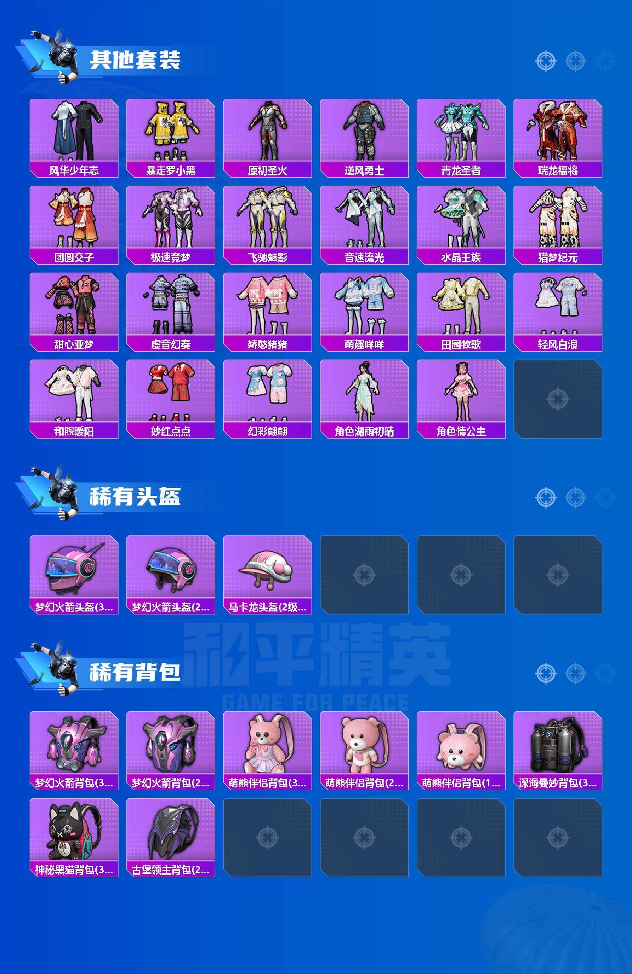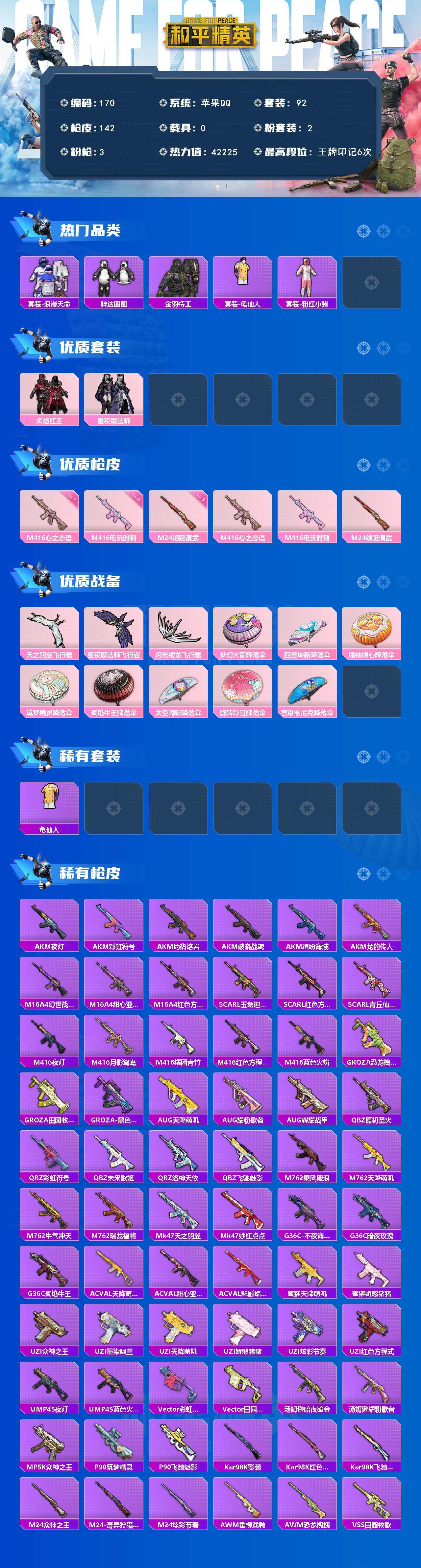 【特价出售】苹果手q-2粉装-3特效呛-92套装-142呛皮-6王牌印记-英勇黄金ⅲ-42225热力值【2粉装】炙焰红王星夜魔法师【3特效呛】m416-心之恋语[7级]m24-翩跹演武[3级]m416-电玩时刻[5级]【5稀有】暴走罗小黑浪漫天命胖达圆圆akm-缤纷海域m24-奇异狩猎者【4飞行器】粉色滑翔尾迹天之羽翼飞行器闪光银龙飞行器星夜魔法师飞行翼【1