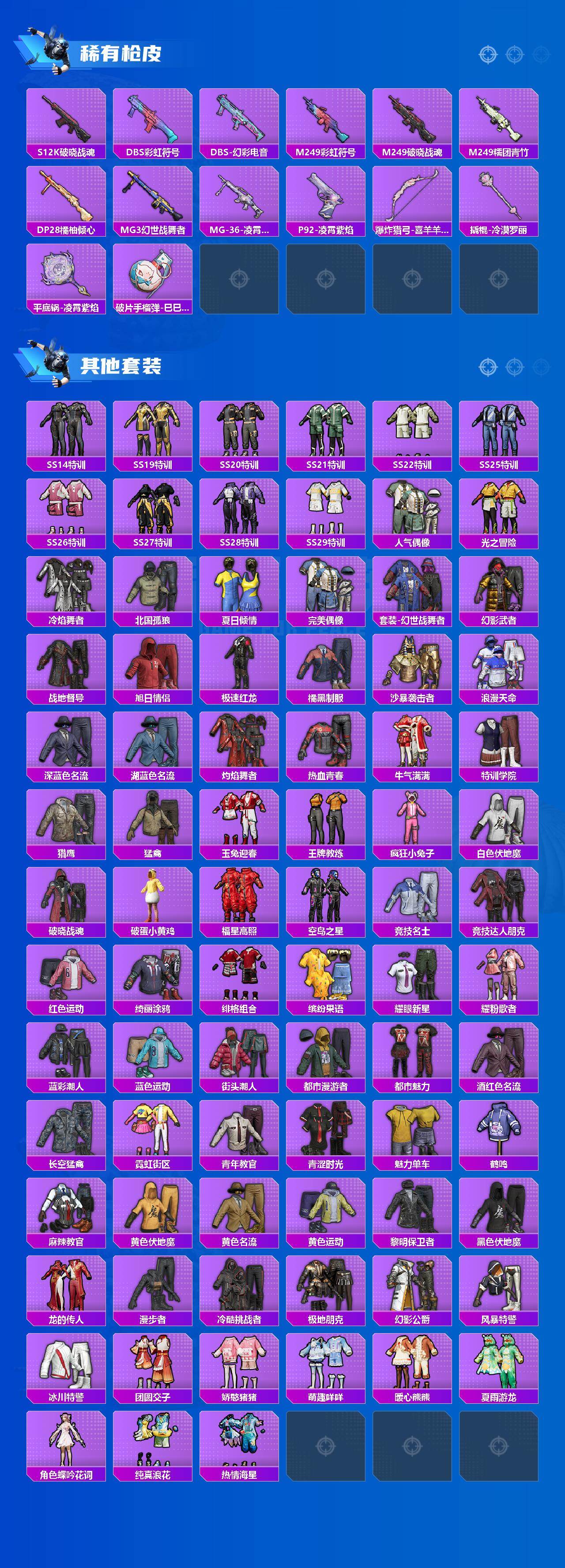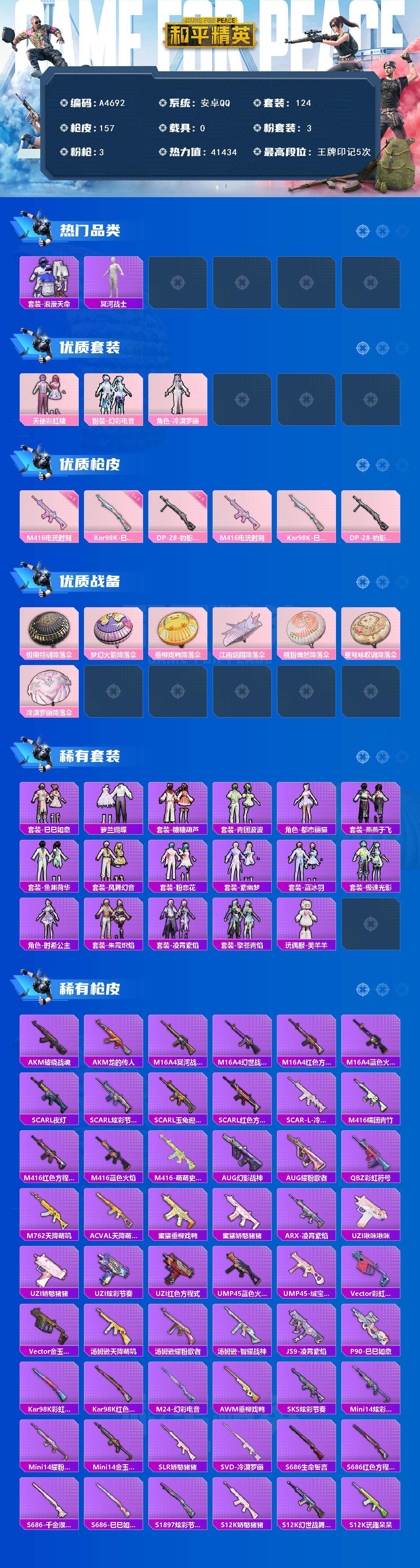[15987916]安卓 【小号 浪漫天命 冥河战士】手q-3粉装-3特效呛-0载具-2粉色飞行器-41434热力值-5王牌印记-124套装-157呛皮 【热门品类】:套装-浪漫天命,套装-冥河战士 【粉色套装】:粉装-天使彩虹糖,粉装-幻彩电音,角色-冷漠罗丽 【粉色呛皮等级】:m416-电玩时刻五级,kar98k-巳巳如意五级,dp-28-豹影疾电五级 【粉色呛皮】:m416-电玩时刻,kar98k-巳巳如意,dp-28-豹影疾电 【粉色降落伞】:极限特训降落伞,梦幻火箭降落伞,垂柳戏鸭降落伞,江南烟雨降落伞,桃粉嫣然降落伞,星穹咏叹调降落伞,冷漠罗丽降落伞,炫彩糖果降落伞 【稀有套装】:套装-巳巳如意,套装-雪国风尚,套装-炫彩糖果,套装-萝兰蝴蝶,套装-糖糖葫芦,套装-青团波波,角色-都市丽猫,套装-燕燕于飞,套装-鱼渊荷华,套装-风舞幻音,套装-粉恋花,套装-紫幽梦,套装-蓝冰羽,套装-极速光影,角色-时希公主,套装-朱霞炽焰,套装-凌霄紫焰,套装-擎苍青焰,玩偶服-美羊羊 【稀有呛皮】:akm-破晓战魂,akm-龙的传人,m16a4-冥河战士,m16a4-幻世战舞者,m16a4-红色方程式,m16a4-蓝色火焰,scar-l-夜灯,scar-l-炫彩节奏,scar-l-玉兔迎春,scar-l-红色方程式,scar-l-冷漠罗丽,m416-糯团青竹,m416-红色方程式,m416-蓝色火焰,m416-萌萌史莱姆,aug-幻影战神,aug-耀粉歌者,q-彩虹符号,m762-天降萌叽,ac-val-天降萌叽,蜜獾-垂柳戏鸭,蜜獾-娇憨猪猪,arx-凌霄紫焰,uzi-啾咪啾咪,uzi-娇憨猪猪,uzi-炫彩节奏,uzi-红色方程式,ump45-蓝色火焰,ump45-绒宝小鹅,vect-彩虹符号,vect-金玉无双,汤姆逊-天降萌叽,汤姆逊-耀粉歌者,汤姆逊-智耀战神,js9-凌霄紫焰,p90-巳巳如意,kar98k-彩虹符号,kar98k-红色方程式,m24-幻彩电音,awm-垂柳戏鸭,sks-炫彩节奏,mini14-炫彩节奏,mini14-耀粉歌者,mini14-金玉无双,slr-娇憨猪猪,svd-冷漠罗丽,s686-生命誓言,s686-红色方程式,s686-巳巳如意,s686-千金淑猫,s1897-炫彩节奏,s12k-玩趣呆呆,s12k-破晓战魂,s1