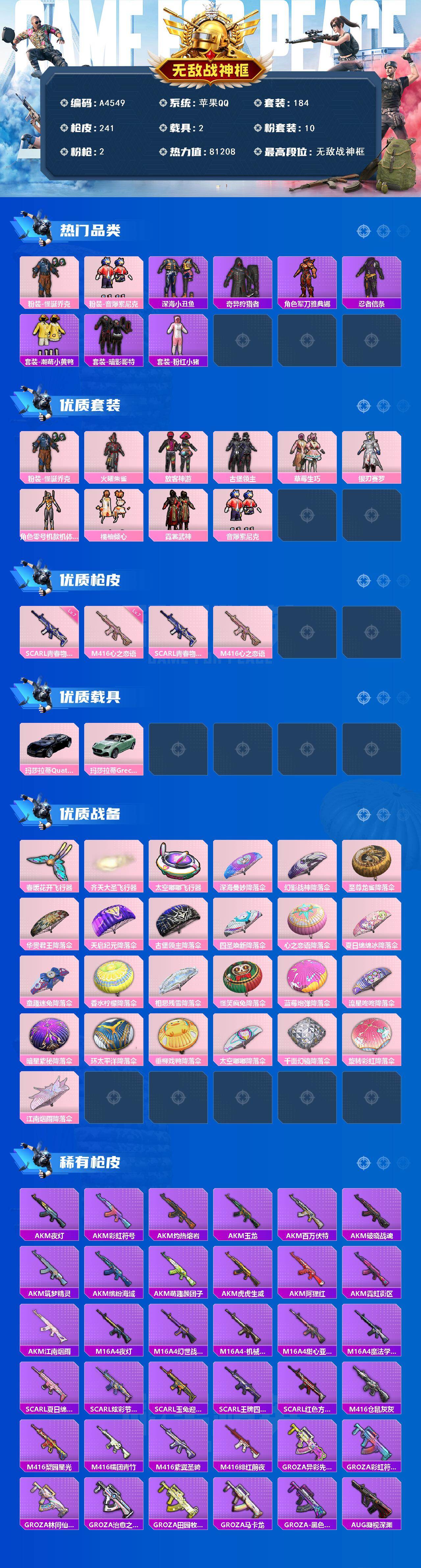 [15988006]苹果 【战神号 怪诞乔克 深海小丑鱼 奇异狩猎者 暗影哥特 零号机款机体服 m416-心之恋语七级 玛莎拉蒂quattropte(夜幕蓝)】手q-无敌战神框-10粉装-2特效呛-2载具-3粉色飞行器-81208热力值-18王牌印记-184套装-241呛皮 【热门品类】:粉装-怪诞乔克,粉装-音爆索尼克,套装-深海小丑鱼,套装-奇异狩猎者,角色-军刀雅典娜,套装-忍者信条,套装-潮萌小黄鸭,套装-暗影哥特,套装-粉红小猪 【粉色套装】:粉装-怪诞乔克,粉装-火曜朱雀,粉装-放客神游,粉装-古堡领主,粉装-草莓生巧,粉装-银刃赛罗,角色-零号机款机体服,粉装-橘柚倾心,粉装-霓裳武神,粉装-音爆索尼克m416-心之恋语七级 【粉色载具】:玛莎拉蒂quattropte(夜幕蓝),玛莎拉 【粉色呛皮等级】:scar-l-青春物语七级,蒂grecale(薄荷绿) 【粉色呛皮】:scar-l-青春物语,m416-心之恋语 【粉色飞行器】:春暖花开飞行器,齐天大圣飞行器,太空嘟嘟飞行器 【粉色降落伞】:深海曼妙降落伞,幻影战神降落伞,至尊龙雀降落伞,华贵君王降落伞,天启纪元降落伞,古堡领主降落伞,四圣焕新降落伞,心之恋语降落伞,夏日绵绵冰降落伞,童趣迷兔降落伞,香水柠檬降落伞,相思残雪降落伞,怪笑疯兔降落伞,蓝莓炮弹降落伞,流星咚咚降落伞,暗星紫秘降落伞,环太平洋降落伞,垂柳戏鸭降落伞,太空嘟嘟降落伞,千面幻镜降落伞,旋转彩虹降落伞,江南烟雨降落伞 【稀有呛皮】:akm-夜灯,akm-彩虹符号,akm-江南烟雨,akm-灼热熔岩,akm-玉龙,akm-百万伏特,akm-破晓战魂,akm-筑梦精灵,akm-缤纷海域,akm-萌趣颜团子,akm-虎虎生威,akm-阿狸红,akm-霓虹街区,m16a4-夜灯,m16a4-幻世战舞者,m16a4-机械英豪,m16a4-甜心亚梦,m16a4-魔法学院,scar-l-夏日绵绵冰,scar-l-炫彩节奏,scar-l-玉兔迎春,scar-l-王牌四分卫,scar-l-红色方程式,m416-仓鼠灰灰,m416-梨园星光,m416-糯团青竹,m416-紫翼圣骑,m416-绯红前夜,groza-异彩先驱,groza-彩虹符号,groza-林间仙鹿,groza-治愈之星,groza-田园牧歌,groza-马卡龙,groza-黑色刀