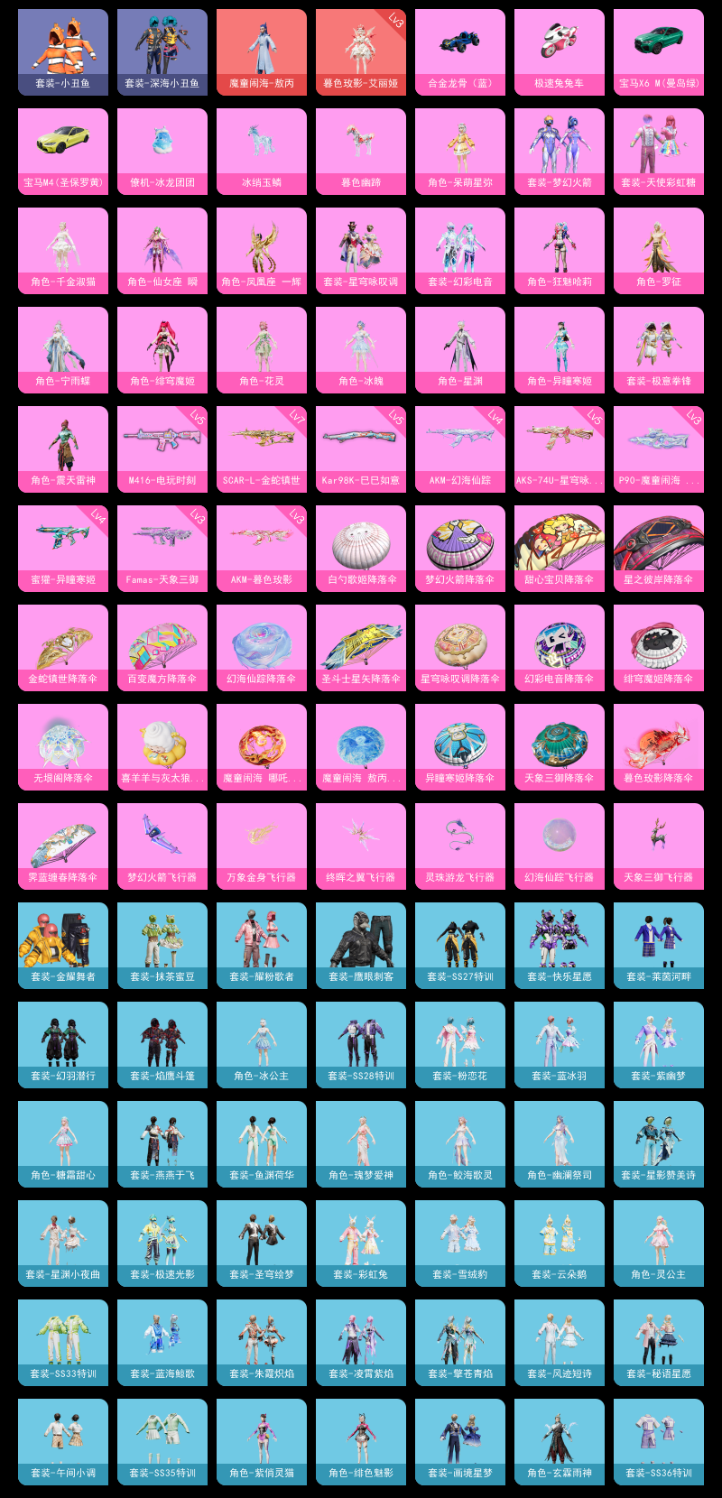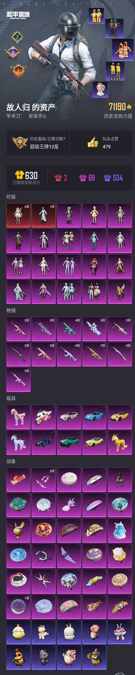 【和平精英】【lyhp20691】18粉装,11特效呛,10载具,历史最高段位:超级王牌12星 王牌印记7次 热力值:71190,111套装,151呛械,244装备,98战备;套装:魔童闹海-敖丙,暮色玫影-艾丽娅,套装-天使彩虹糖,套装-梦幻火箭,角色-呆萌星弥,角色-异瞳寒姬,角色-千金淑猫,角色-绯穹魔姬,角色-凤凰座 一辉,角色-仙女座 瞬,角色-罗征,角色-狂魅哈莉,角色-宁雨蝶,套装-幻彩电音,套装-星穹咏叹调,角色-星渊,角色-花灵,角色-冰魄,角色-震天雷神,套装-极意拳锋,套装-黑色伏地魔,套装-骑行爱好者,套装-登山爱好者,套装-竞技名士,套装-长空猛禽,套装-海岛探路者,套装-旭日情侣,套装-特战装甲,套装-战地督导,套装-沙漠毒蛇,套装-鹰眼刺客,套装-街头潮人,套装-暗金炫舞,套装-魅力单车,套装-金耀舞者,套装-深海小丑鱼,套装-青涩时光,套装-缤纷果语,套装-滨海厨神,套装-龙魂突击队,套装-冰川特警,套装-小丑鱼,套装-梦魇先生,套装-破蛋小黄鸡,套装-抹茶蜜豆,套装-牛气满满,套装-战术大师,套装-耀粉歌者,套装-快乐星愿,套装-光之冒险,套装-绯格组合,套装-莱茵河畔,套装-龟仙人,套装-焰鹰斗篷,套装-幻羽潜行,套装-ss27特训,套装-恋语绒绒,套装-ss28特训,角色-冰公主,套装-海盐绵绵冰,角色-绯色魅影,角色-紫俏灵猫,套装-异域银装,角色-糖霜甜心,套装-ss31特训,套装-鱼渊荷华,套装-燕燕于飞,角色-瑰梦爱神,套装-紫幽梦,套装-粉恋花,套装-ss33特训,套装-云朵鹅,套装-ss32特训,套装-彩虹兔,套装-青翼流星,套装-蓝冰羽,套装-顶瓜瓜,套装-雪绒豹,套装-狂鲨锋刃,套装-大橘大利,套装-圣穹绘梦,角色-幽澜祭司,套装-极速光影,角色-灵公主,角色-鲛海歌灵,套装-星渊小夜曲,套装-炫彩糖果,套装-星影赞美诗,套装-蓝海鲸歌,套装-元气之梦,套装-ss34特训,套装-擎苍青焰,套装-朱霞炽焰,套装-凌霄紫焰,套装-薄荷星砂,套装-ss35特训,套装-午间小调,套装-秘语星愿,套装-风迹短诗,套装-琴音绮想,套装-粉黛兰香,套装-画境星梦,套装-书海巡游,角色-玄霖雨神,套装-阳光菠萝,套装-ss36特训,角色-云端星象师,角色-紫霄电母,角色-霜刃之御,套装-雪国风尚,套装-萌鸡速递;呛皮:4级蜜獾-异瞳寒姬,蜜獾-天降萌叽,蜜獾-风迹短诗,蜜獾-冰澜龙吟,蜜獾-乌木金纹,4级akm-幻海仙踪,3级akm-暮色玫影,akm-涂鸦街区,akm-星之彼岸,akm-江南烟雨,akm-霓彩脉冲,3级famas-天象三御,famas-霓彩脉冲,famas-乌木金纹,ace32-画境星梦,ace32-冰晶雪宝,5级m416-电玩时刻,m416-蓝色火焰,m416-糯团青竹,groza-影袭,groza-守护天翼,groza-暮色玫影,mk47-幻海仙踪,mk47-风迹短诗,g36c-星穹咏叹调,ac-val-天降萌叽,ac-val-霁蓝缠春,aug-异域银装,aug-金蛇镇世,aug-绝对恒星,m762-甜心宝贝,m762-第五大道,m762-云朵鹅,7级scar-l-金蛇镇世,scar-l-彩虹符号,scar-l-海盐豹豹,scar-l-天象三御,q-彩虹符号,arx-凌霄紫焰,svd-云朵鹅,amr-白勺歌姬,amr-喜羊羊与灰太狼,amr-乌木金纹,awm-焰鹰斗篷,awm-暮色玫影,莫辛纳甘-风迹短诗,5级kar98k-巳巳如意,kar98k-2b战斗服款,kar98k-星穹咏叹调,m24-幻彩电音,m200-乌木金纹,win94-乌木金纹,mk12-金蛇镇世,mk12-风迹短诗,mk12-乌木金纹,slr-圣穹绘梦,slr-天象三御,slr-霓彩脉冲,m1加兰德-画境星梦,mk14-冰河战士,mk14-紫幽梦,mk14-薄荷星砂,mini14-穿刺龙虾,mini14-炫彩节奏,mk20-h-狂鲨锋刃,vss-彩虹符号,uzi-影袭,uzi-天降萌叽,uzi-冰河战士,uzi-炫彩糖果,ump45-炫光之旅,ump45-海盐豹豹,ump45-绒宝小鹅,ump45-圣穹绘梦,5级aks-74u-星穹咏叹调,aks-74u-辉羽雀灵,aks-74u-鸡智如我,aks-74u-乌木金纹,js9-凌霄紫焰,vect-焰鹰斗篷,vect-燕燕于飞,3级p90-魔童闹海 敖丙,p90-玩趣呆呆,p90-金蛇镇世,野牛-燕燕于飞,汤姆逊-炫彩节奏,mp5k-画境星梦,mp5k-乌木金纹,s12k-霓彩脉冲,s1897-炫彩节奏,s1897-紫幽梦,s1897-糯团青竹,spas-12-燕燕于飞,spas-12-狂鲨锋刃,spas-12-云朵鹅,dbs-焰鹰斗篷,dbs-幻彩电音,dbs-风迹短诗,dbs-乌木金纹,s686-生命誓言,aa12-g-画境星梦,mg3-幻世战舞者,mg3-智耀战神,mg3-霓彩脉冲,m249-羲和光序,m249-冰晶雪宝,pkm-啾咪啾咪,pkm-紫幽梦,5级dp-28-豹影疾电,dp-28-甜心宝贝,dp-28-焰鹰斗篷,5级mg-36-沧焰双生,mg-36-凌霄紫焰,mg-36-薄荷星砂,p92-紫幽梦,p92-凌霄紫焰,沙墨之鹦-圣穹绘梦,沙墨之鹦-云朵鹅,信号呛-异瞳寒姬,r45-幻彩电音,蝎式手呛-燕燕于飞,短管霰弹-星穹咏叹调,tmp-9-江南烟雨,大砍刀-云朵鹅,大砍刀-冰澜龙吟,平底锅-焰鹰斗篷,平底锅-紫幽梦,平底锅-属我最6,平底锅-无垠阁,平底锅-凌霄紫焰,平底锅-画境星梦,撬棍-甜心宝贝,撬棍-冷漠罗丽,撬棍-暮色玫影,撬棍-火尖呛,撬棍-冰晶雪宝,铝热弹-炫彩糖果,破片手留单-海盐豹豹,破片手留单-拽到爆炸,破片手留单-爆破雪人,燃点复合弓-火尖莲影,燃点复合弓-罪夜之冕,爆炸猎弓-喜羊羊与灰太狼,十子怒-异瞳寒姬,十子怒-燕燕于飞,十子怒-异域银装,盐雾蛋-冰氧夏日,盐雾蛋-冰澜龙吟,轻型迫击炮-无垠阁,战术弩-江南烟雨,燃烧瓶-甜梦桃焰;载具:保时捷911 敞篷版极速黄,宝马m4圣保罗黄,合金龙骨(蓝),护世瑞兽,冰绡玉鳞,暮色幽蹄,保时捷918 sper沉静蓝,宝马x6 m曼岛绿,极速兔兔车,保时捷taycan 旅行版冰莓粉;降落伞:梦幻火箭飞行器,万象金身飞行器,终晖之翼飞行器,提桶跑路飞行器,炫彩糖果飞行器,天象三御飞行器,灵珠游龙飞行器,幻海仙踪飞行器,暮色之舞飞行器,异域银装飞行器,狂鲨锋刃飞行器,破刃行动尾迹,鸡智如我飞行器,登顶巅峰飞行器;滑翔尾迹:僚机-冰龙团团; 详情看图2红18粉11特效呛10载 3级暮色 