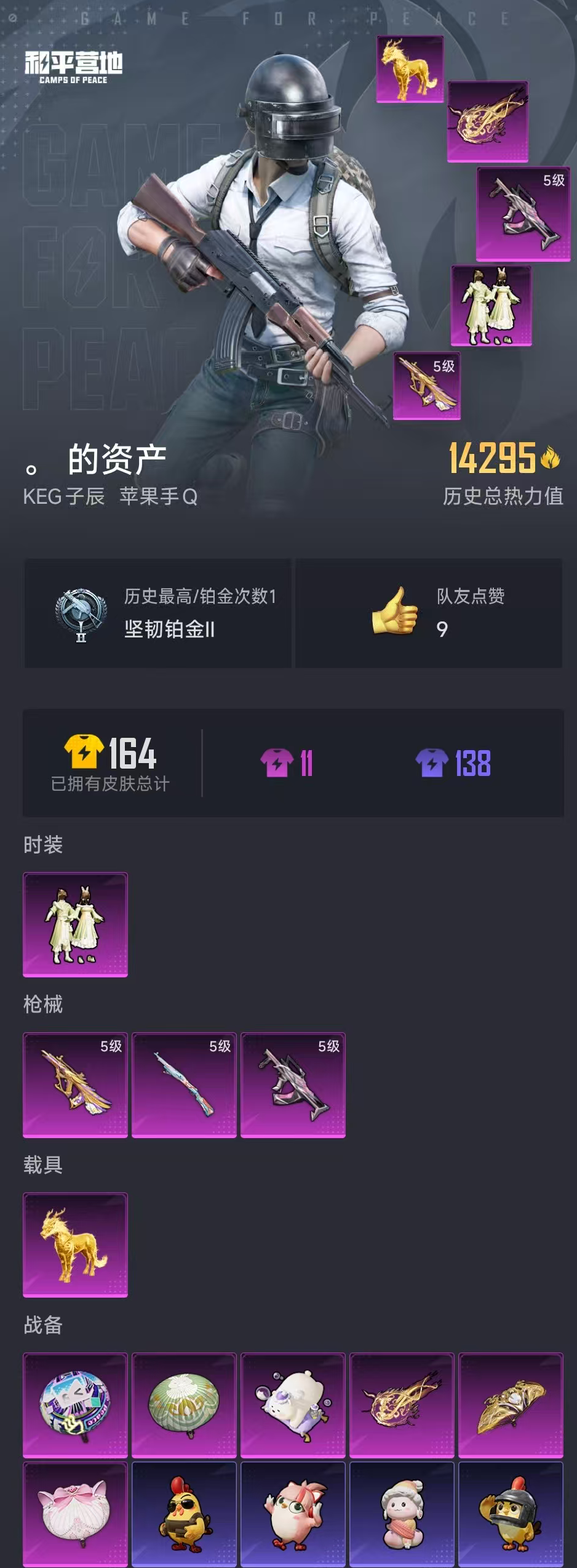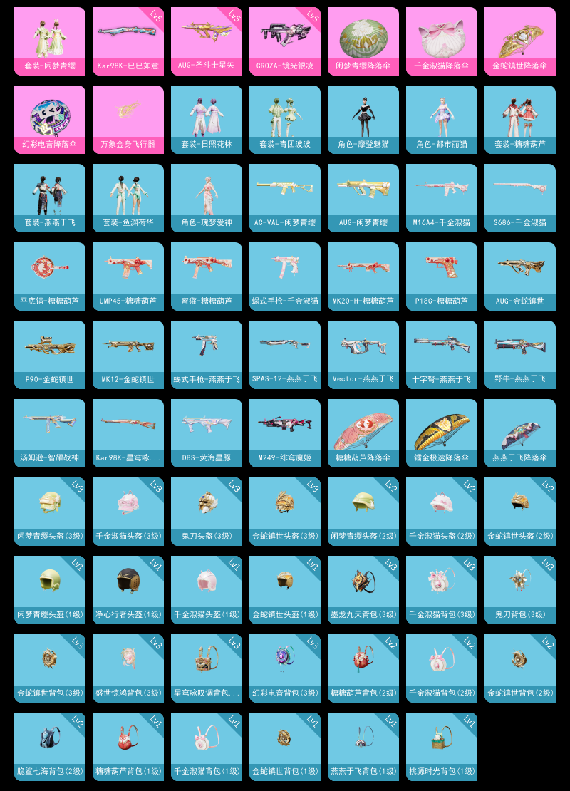 【和平精英】【lyhp20708】1粉装,3特效呛,1载具,历史最高段位:坚韧铂金ⅱ 热力值:14335,21套装,49呛械,52装备,31战备;套装:套装-闲梦青缨,套装-特训学院,套装-黄色运动,套装-黑色伏地魔,套装-森林游猎者,套装-血色贵族,套装-战术大师,套装-日照花林,套装-恋语绒绒,套装-街头风暴,角色-摩登魅猫,角色-都市丽猫,角色-怀庆长公主,套装-青团波波,套装-糖糖葫芦,套装-鱼渊荷华,套装-燕燕于飞,角色-瑰梦爱神,套装-巳巳如意,套装-顶瓜瓜,套装-大橘大利;呛皮:ace32-蓝晶绮麟,5级aug-圣斗士星矢,aug-甜蜜菠萝,aug-闲梦青缨,aug-金蛇镇世,scar-l-玉兔迎春,蜜獾-糖糖葫芦,蜜獾-乌木金纹,famas-乌木金纹,5级groza-镜光银凌,m16a4-千金淑猫,ac-val-闲梦青缨,5级kar98k-巳巳如意,kar98k-星穹咏叹调,m200-乌木金纹,mk12-金蛇镇世,mk12-乌木金纹,sks-炫彩节奏,m417-蓝晶绮麟,mk20-h-糖糖葫芦,aks-74u-鸡智如我,汤姆逊-智耀战神,p90-巳巳如意,p90-金蛇镇世,ump45-海盐豹豹,ump45-糖糖葫芦,ump45-绒宝小鹅,vect-燕燕于飞,野牛-燕燕于飞,s686-千金淑猫,s686-巳巳如意,dbs-彩虹符号,dbs-荧海星豚,spas-12-燕燕于飞,spas-12-乌木金纹,s1897-糯团青竹,s12k-玩趣呆呆,dp-28-彩虹符号,m249-绯穹魔姬,蝎式手呛-千金淑猫,蝎式手呛-燕燕于飞,p18c-糖糖葫芦,平底锅-糖糖葫芦,盐雾蛋-炽纹蛇影,盐雾蛋-冰氧夏日,破片手留单-海盐豹豹,破片手留单-巳巳如意,十子怒-燕燕于飞,十子怒-异域银装;载具:护世瑞兽;降落伞:酣梦熊熊飞行器,万象金身飞行器,冰柠泡泡飞行器,招财竹蜻蜓飞行器; 详情看图1粉装3特效呛1载具 5级圣斗士aug 金麒麟