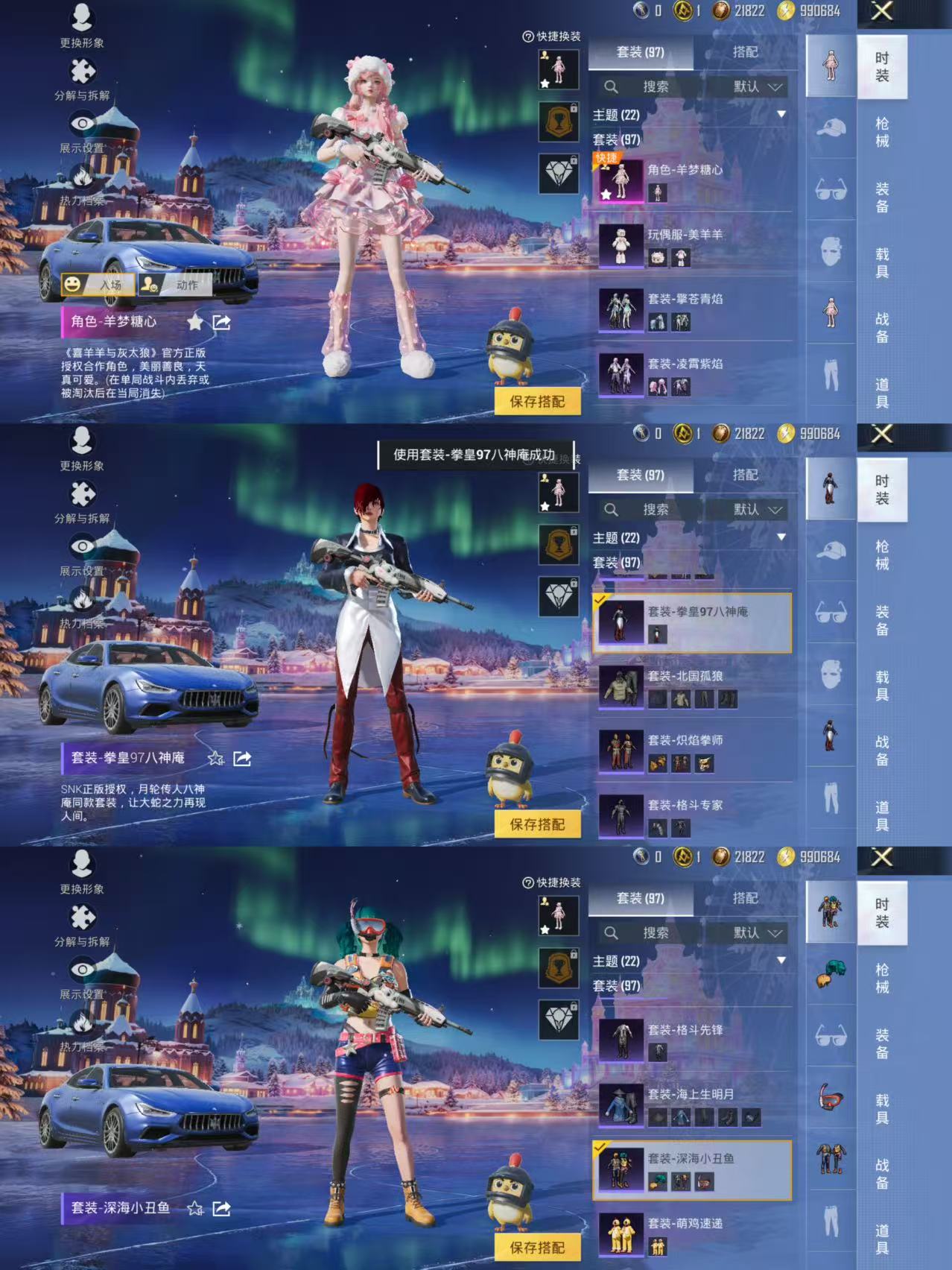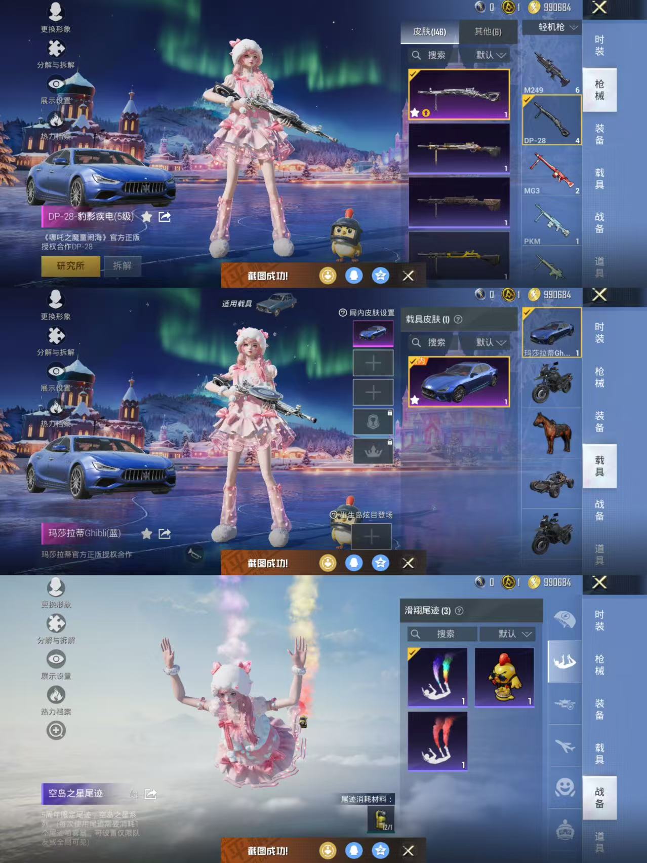 1载具-97套装-146呛皮-苹果q-7王牌印记-1粉装-1特效呛-146呛皮-97套装-1载具 【1载具】 玛莎拉蒂蓝色 【1粉装】 羊梦糖心 【1特效呛】 dp-28-豹影疾电 【3飞行器】 鸡智如我飞行器 粉色滑翔尾迹 空岛之星尾迹 【16头盔】 萌鸡速递头盔3级 拳皇97头盔3级 炫彩糖果头盔3级 凌霄紫焰头盔3级 香水柠檬头盔3级 四圣焕新头盔3级 黑色刀锋头盔3级