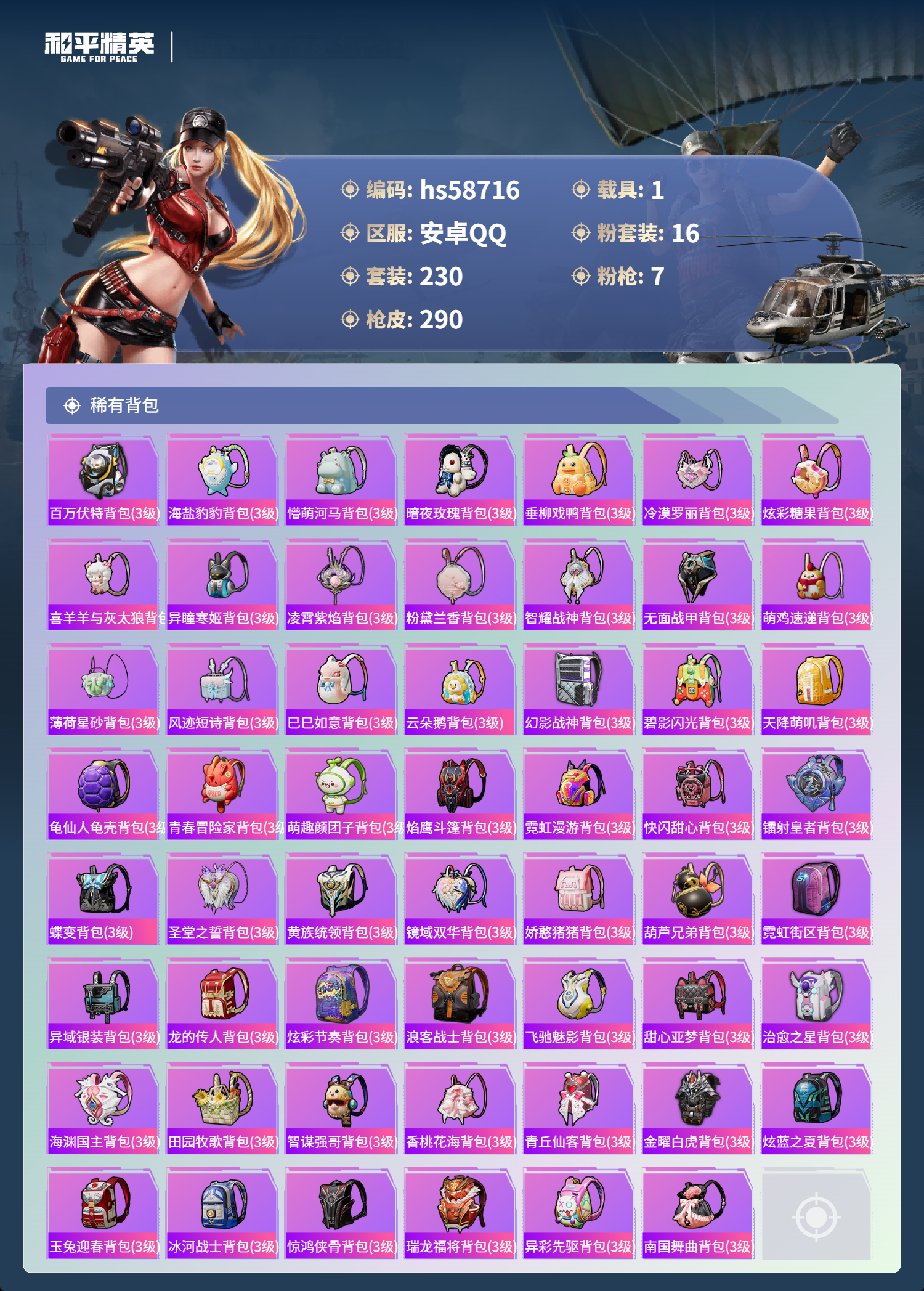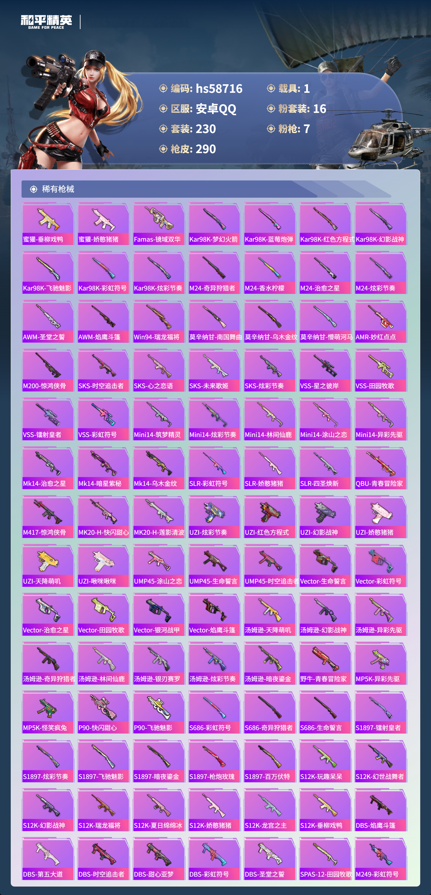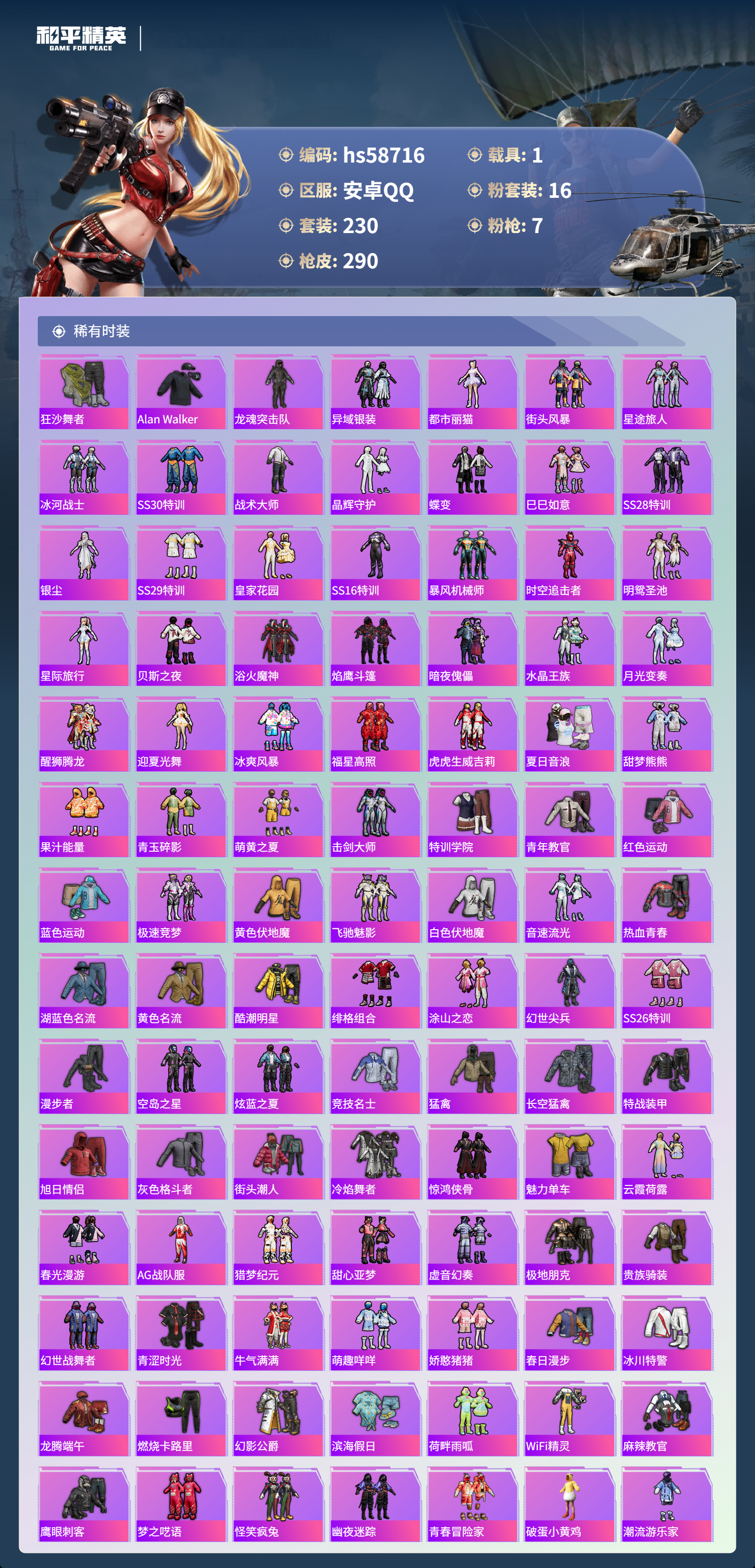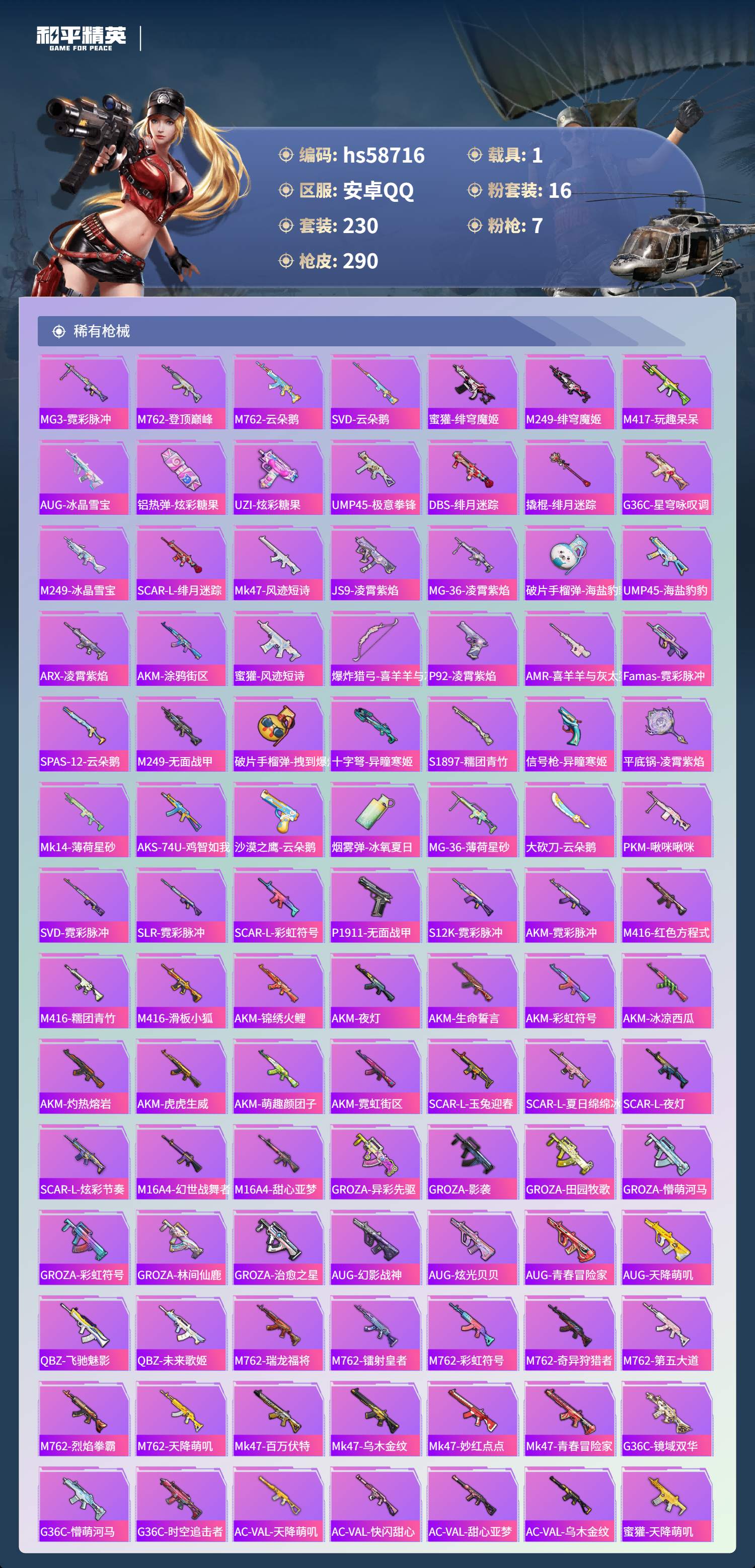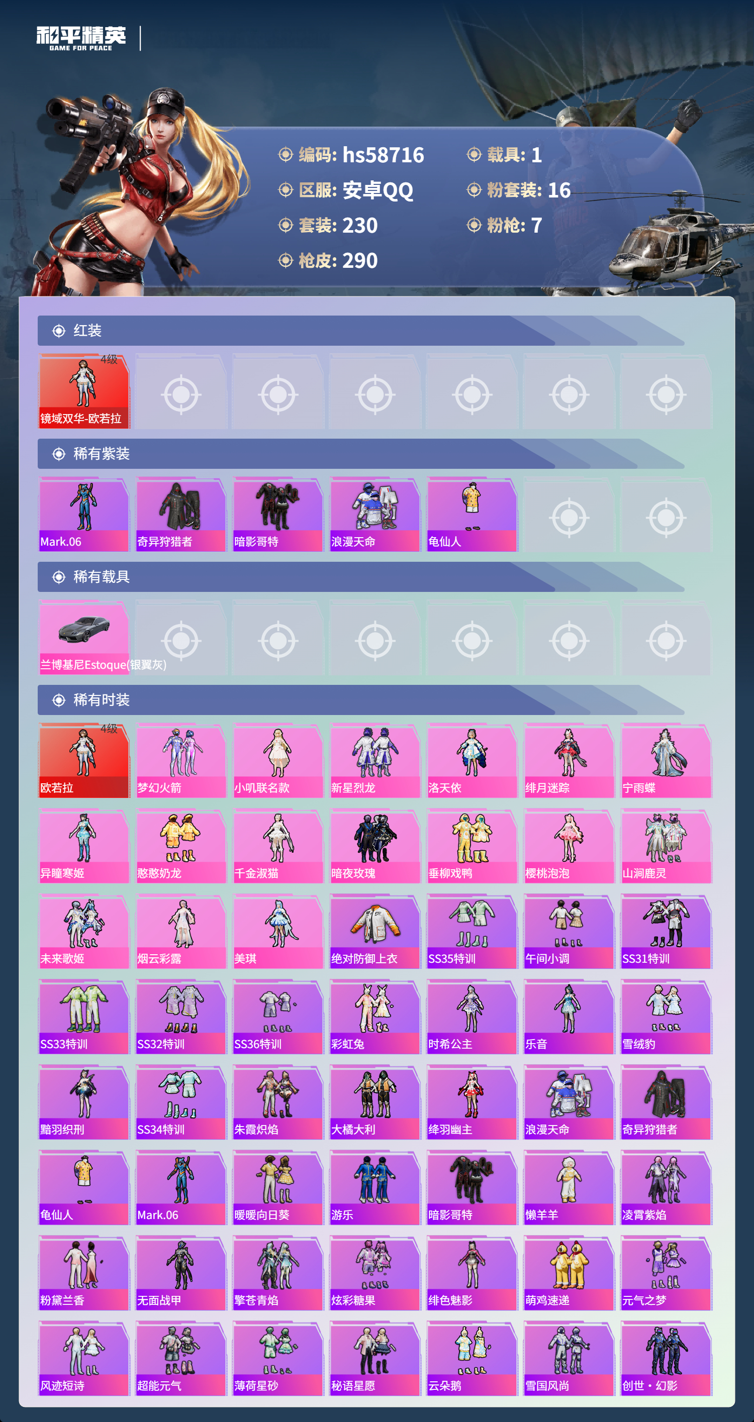 2409012安卓手q-17王牌印记-1红装-16粉装-7特效呛-1载具-热力值-230套装-290呛皮 【1红装】镜域双华-欧若拉/4级 【16粉装】套装-梦幻火箭角色-小叽联名款角色-宁雨蝶套装-暗夜玫瑰套装-未来歌姬角色-异瞳寒姬套装-憨憨奶龙角色-美琪角色-烟云彩露角色-绯月迷踪套装-山涧鹿灵套装-新星烈龙角色-千金淑猫角色-洛天依套装-垂柳戏鸭角色