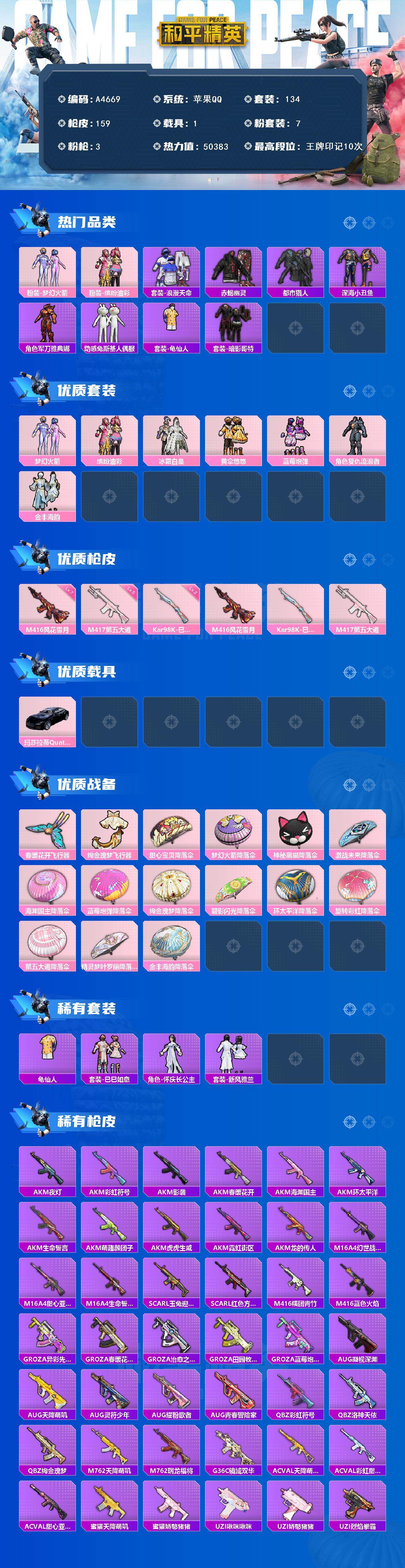 [15997709]苹果【男神号 粉装-梦幻火箭/套装-赤蝎幽灵/套装-都市猎人/套装-暗影哥特/粉装-缤纷油彩/m416-风花雪月七级/m417-第五大道五级/玛莎拉蒂quattropte(夜幕蓝)】 手q-7粉装-3特效呛-1载具-2粉色飞行器-50383热力值-10王牌印记-134套装-159呛皮 【热门品类】:粉装-梦幻火箭,粉装-缤纷油彩,套装-浪漫天命,套装-赤蝎幽灵,套装-都市猎人,套装-深海小丑鱼,角色-军刀雅典娜,套装-动感兔斯基人偶服,套装-龟仙人,套装-暗影哥特 【粉色套装】:粉装-梦幻火箭,粉装-缤纷油彩,粉装-冰霜白皇,粉装-黄伞悠悠,粉装-蓝莓炮弹,角色-复仇流浪者,粉装-金丰海韵 【粉色呛皮等级】:m416-风花雪月七级,kar98k-巳巳如意二级,m417-第五大道五级 【粉色载具】:玛莎拉蒂quattropte(夜幕蓝) 【粉色呛皮】:m416-风花雪月,kar98k-巳巳如意,m417-第五大道 【粉色飞行器】:春暖花开飞行器,绚金瑰梦飞行器 【粉色降落伞】:甜心宝贝降落伞,梦幻火箭降落伞,神秘黑猫降落伞,激战未来降落伞,海渊国主降落伞,蓝莓炮弹降落伞,绚金瑰梦降落伞,碧影闪光降落伞,环太平洋降落伞,旋转彩虹降落伞,第五大道降落伞,精灵梦叶罗丽降落伞,金丰海韵降落伞 【稀有套装】:套装-龟仙人,套装-巳巳如意,角色-怀庆长公主,套装-新风雅兰 【稀有呛皮】:akm-夜灯,akm-彩虹符号,akm-影袭,akm-春暖花开,akm-海渊国主,akm-环太平洋,akm-生命誓言,akm-萌趣颜团子,akm-虎虎生威,akm-霓虹街区,akm-龙的传人,m16a4-幻世战舞者,m16a4-甜心亚梦,m16a4-生命誓言,scar-l-玉兔迎春,scar-l-红色方程式,m416-糯团青竹,m416-蓝色火焰,groza-异彩先驱,groza-春暖花开,groza-治愈之星,groza-田园牧歌,groza-蓝莓炮弹,aug-凝视深渊,aug-天降萌叽,aug-灵符少年,aug-耀粉歌者,aug-青春冒险家,q-彩虹符号,q-洛神天依,q-绚金瑰梦,m762-天降萌叽,m762-瑞龙福将,g36c-镜域双华,ac-val-天降萌叽,ac-val-彩虹甜喵,ac-val-甜心亚梦,蜜獾-天降萌叽,蜜獾-娇憨猪猪,uzi-