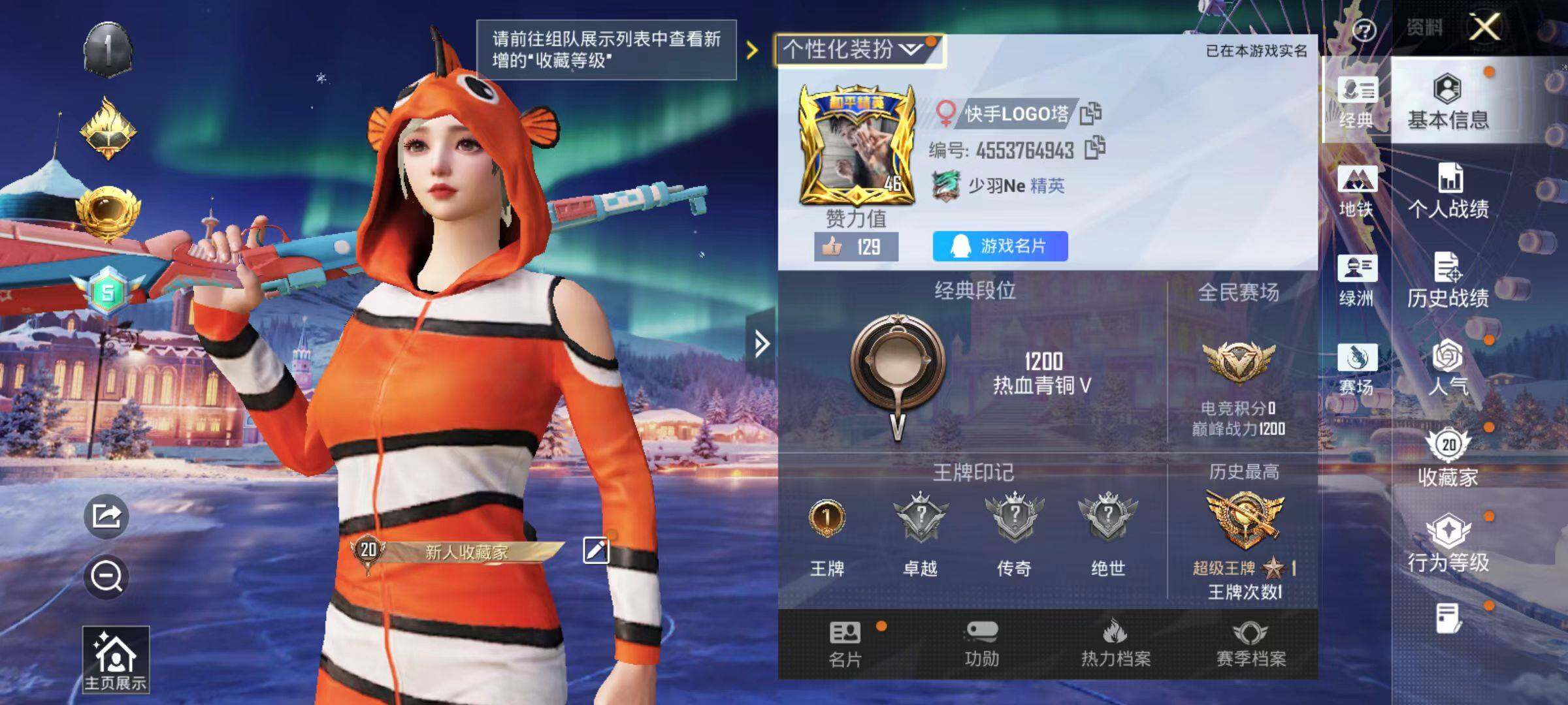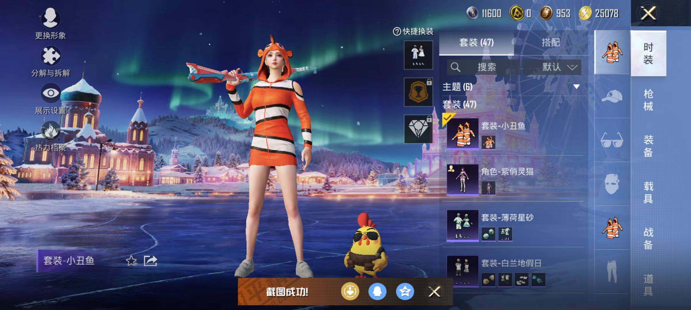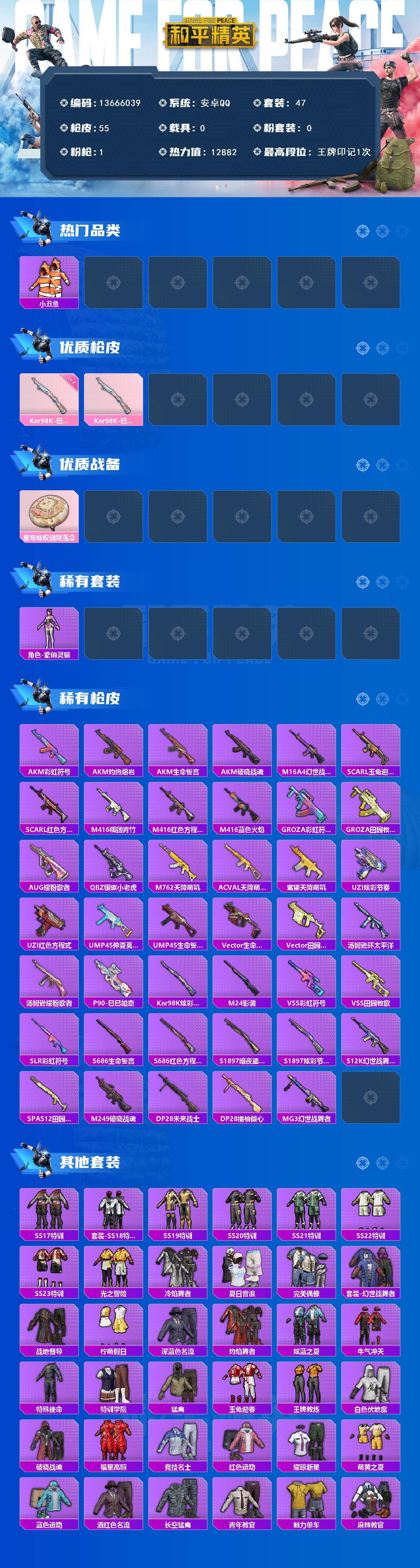 6449【小丑鱼1特效呛12882热力值1王牌印记47套装55呛皮】 【热门品类】:套装-小丑鱼 【粉色呛皮等级】:kar98k-巳巳如意二级 【粉色呛皮】:kar98k-巳巳如意 【粉色降落伞】:星穹咏叹调降落伞 【稀有套装】:角色-紫俏灵猫 【稀有呛皮】:akm-彩虹符号,akm-灼热熔岩,akm-生命誓言,akm-破晓战魂,aug-耀粉歌者,ac-val-天降萌叽,dp-28-未