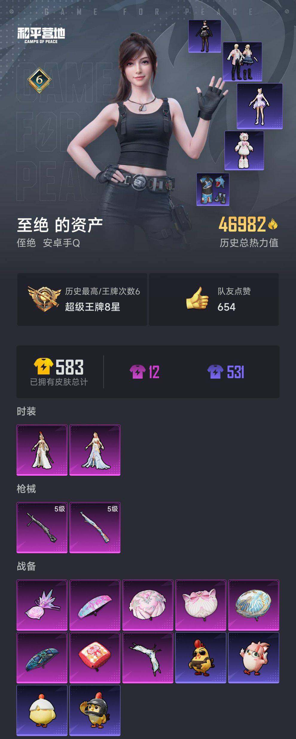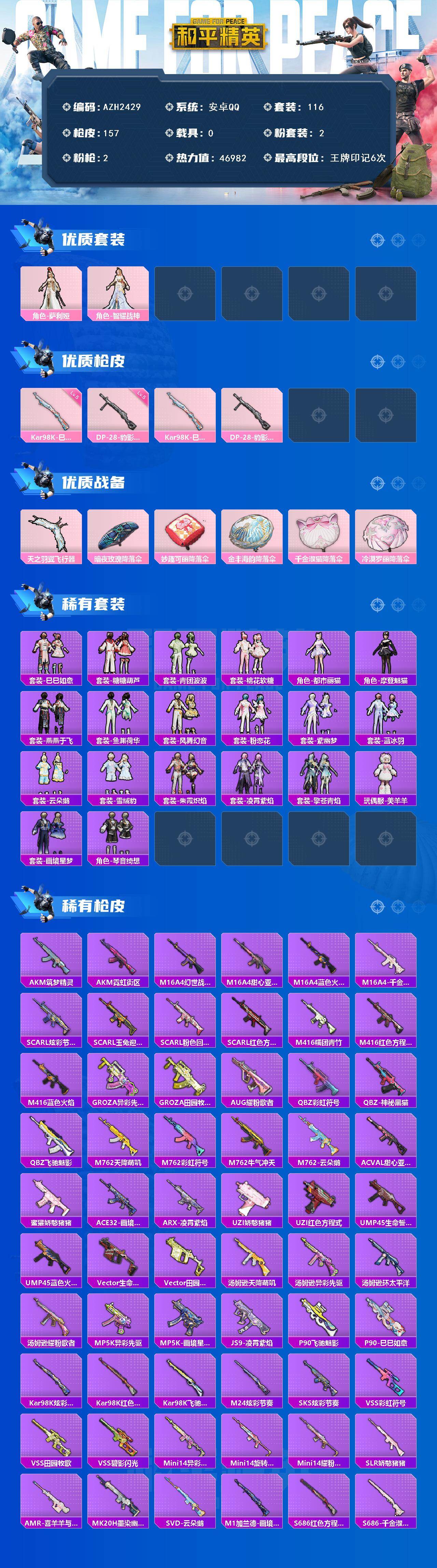 0载具-116套装-157呛皮-【azh2429】安卓 手q【智耀战神 美羊羊 都市丽猫 摩登魅猫】2粉装-2特效呛-0载具-2粉色飞行器-46982热力值-6王牌印记-116套装-157呛皮 【粉色套装】:角色-萨利娅,角色-智耀战神 【粉色呛皮等级】:kar98k-巳巳如意五级,dp-28-豹影疾电五级 【粉色呛皮】: