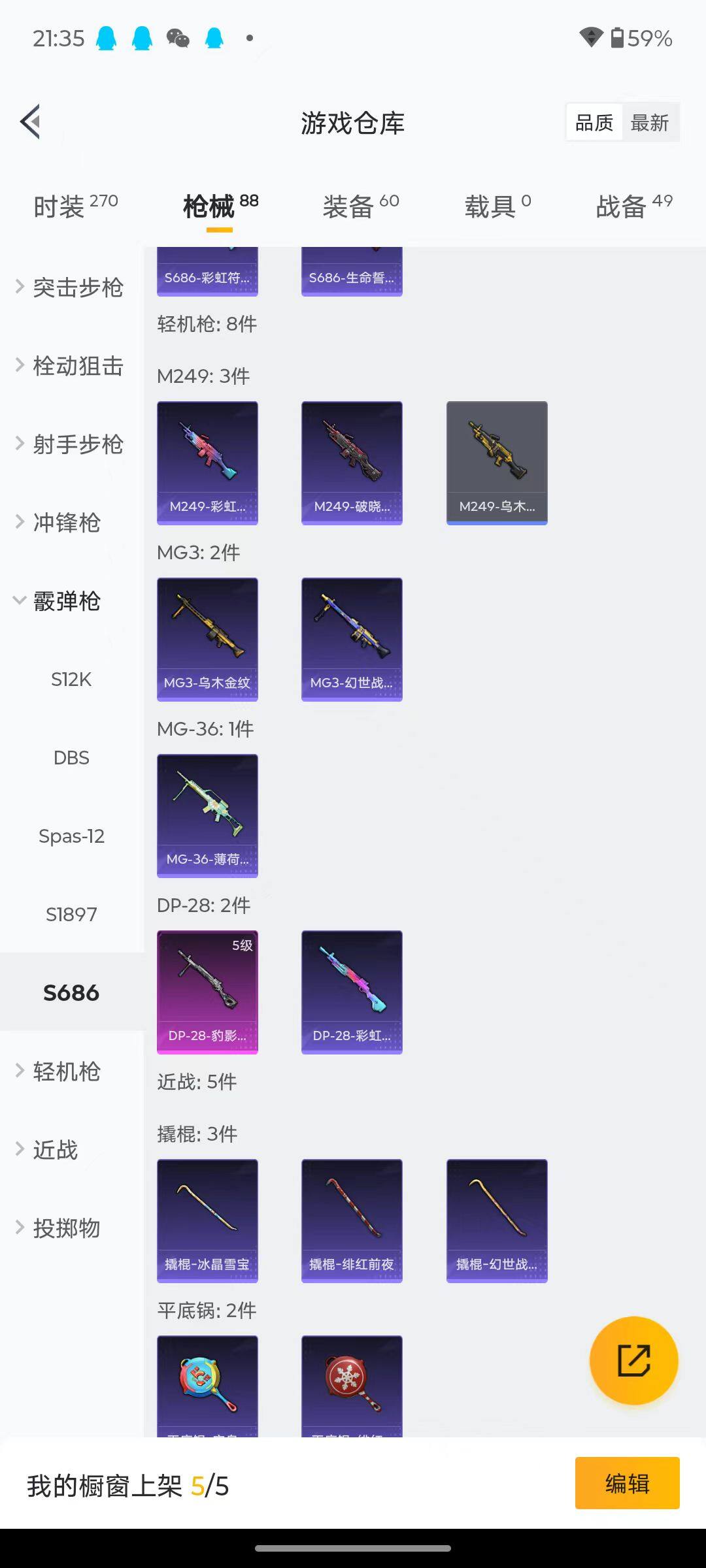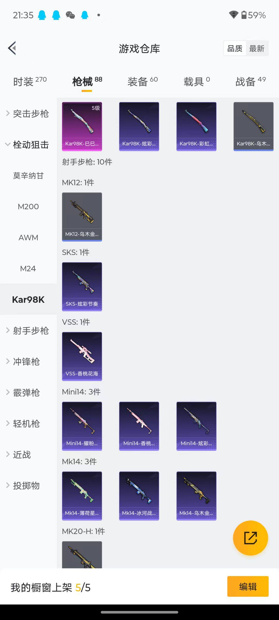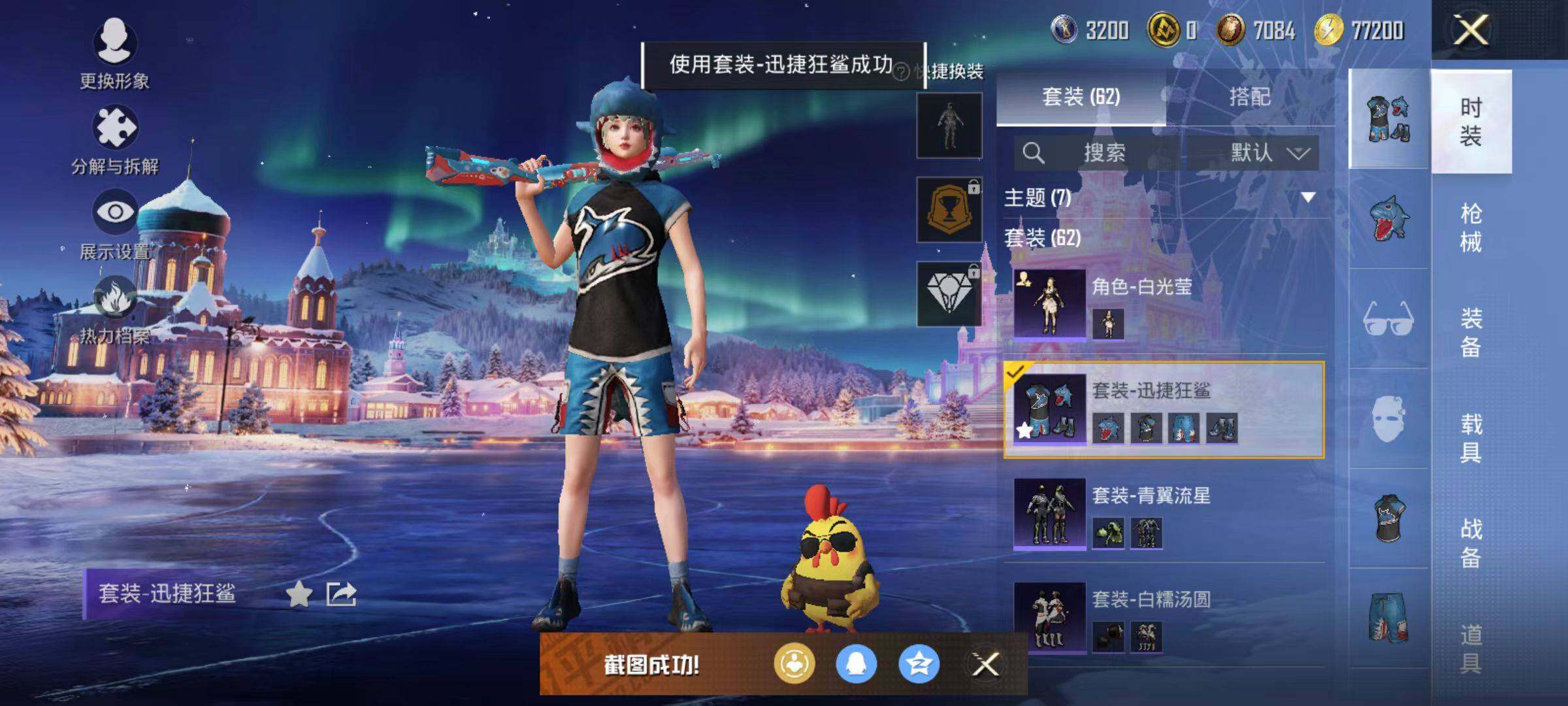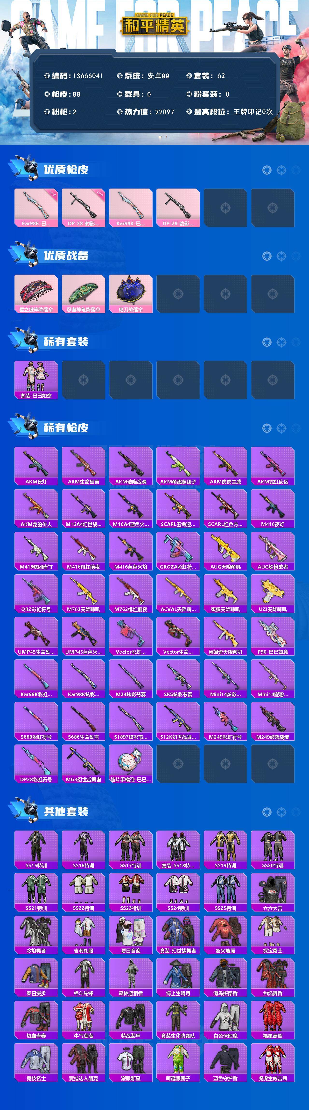 6451【2特效呛22097热力值1王牌印记62套88呛皮】 【粉色呛皮】:kar98k-巳巳如意,dp-28-豹影疾电 【粉色降落伞】:星之彼岸降落伞,忍者神龟降落伞,鬼刀降落伞 【稀有套装】:套装-巳巳如意 【稀有呛皮】:akm-夜灯,akm-生命誓言,akm-破晓战魂,akm-萌趣颜团子,akm-虎虎生威,akm-霓虹街区,akm-龙的传人,aug-天降萌叽,aug-耀粉歌者,ac-