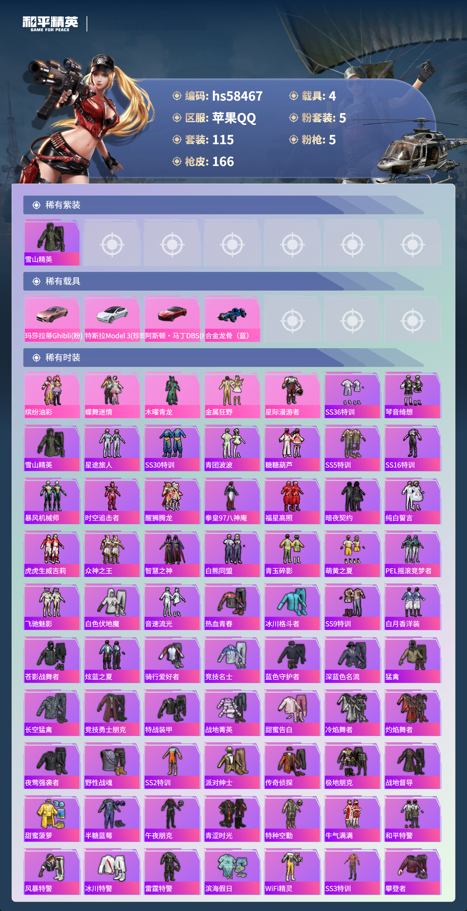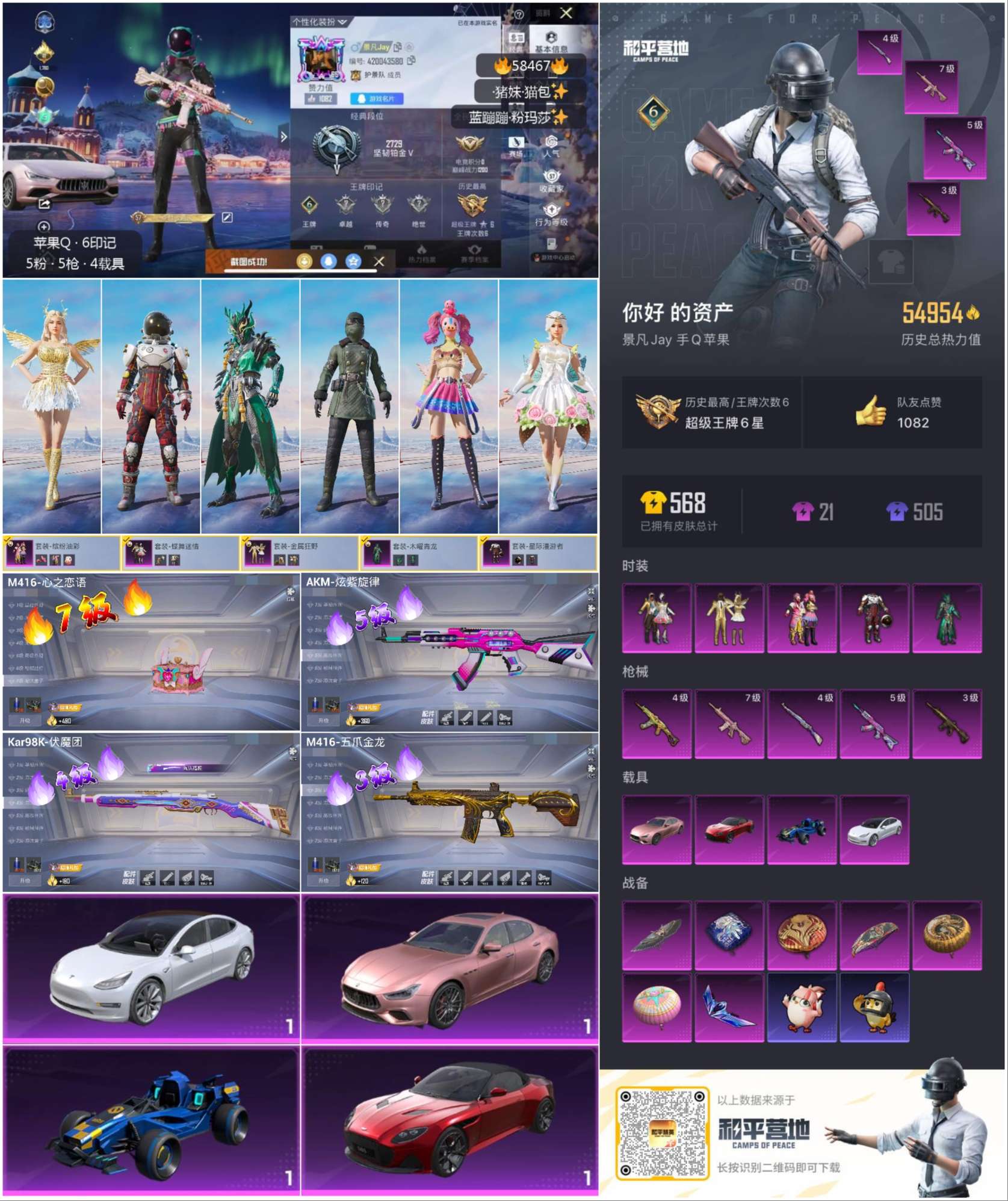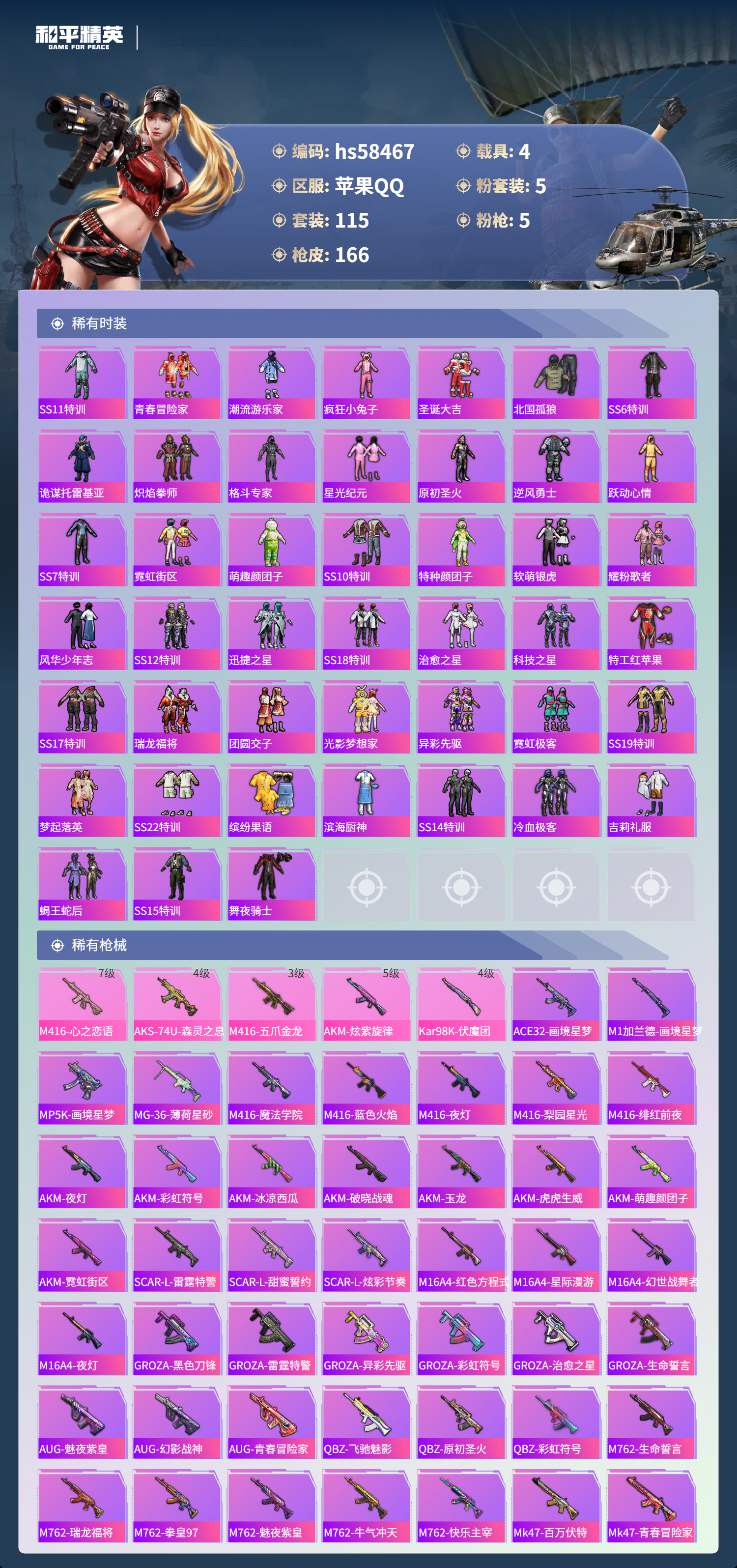 hs58467 苹果手q-6王牌印记-5粉装-5特效呛-4载具-54954热力值-115套装-166呛皮【5粉装】套装-金属狂野套装-星际漫游者套装-木曜青龙套装-蝶舞迷情套装-缤纷油彩【5特效呛】akm-炫紫旋律/5级aks-74u-森灵之息/4级kar98k-伏魔团/4级m416-五爪金龙/3级m416-心之恋语/7级【1稀有紫装】雪山精英【4稀有载具】玛莎拉蒂ghib