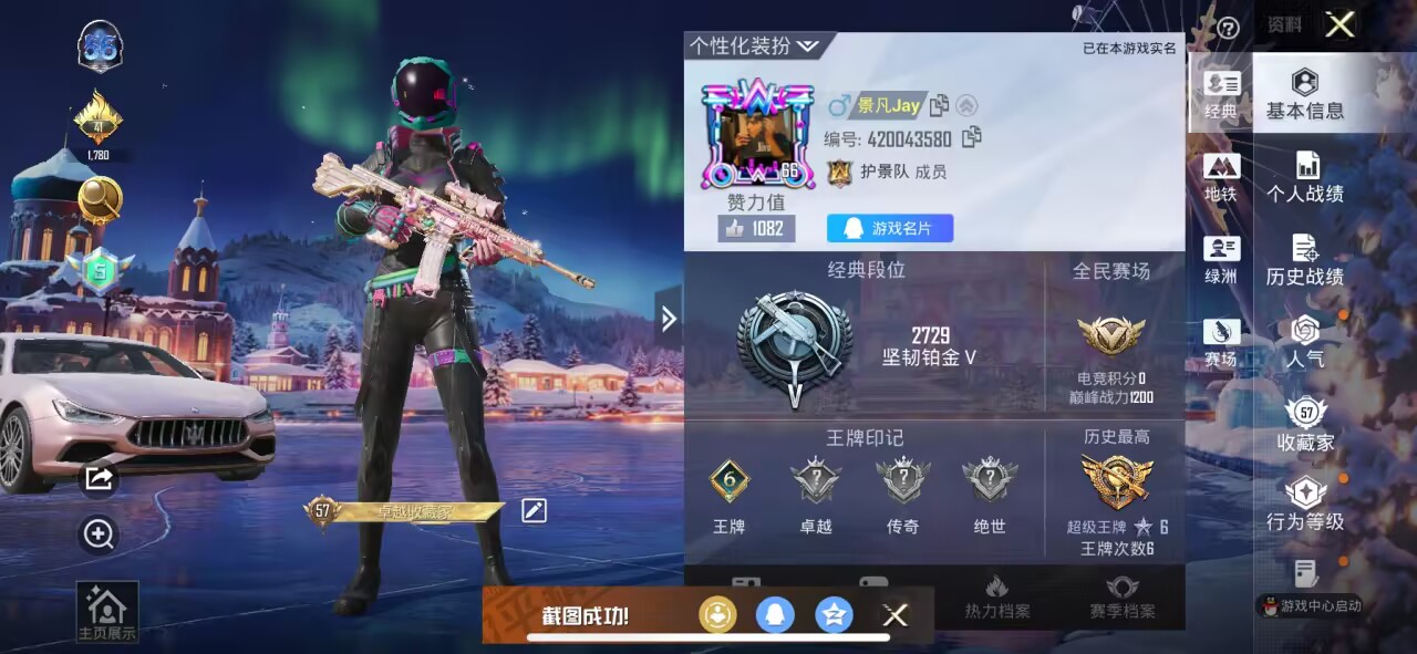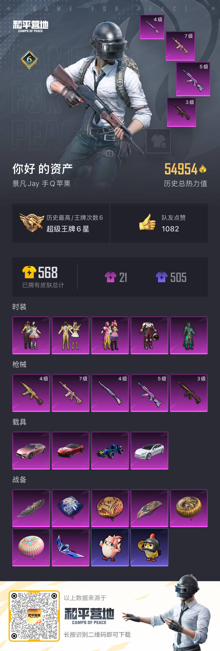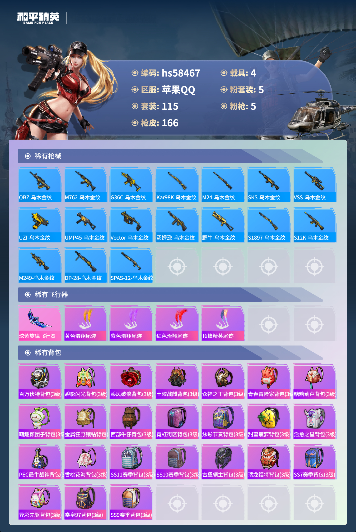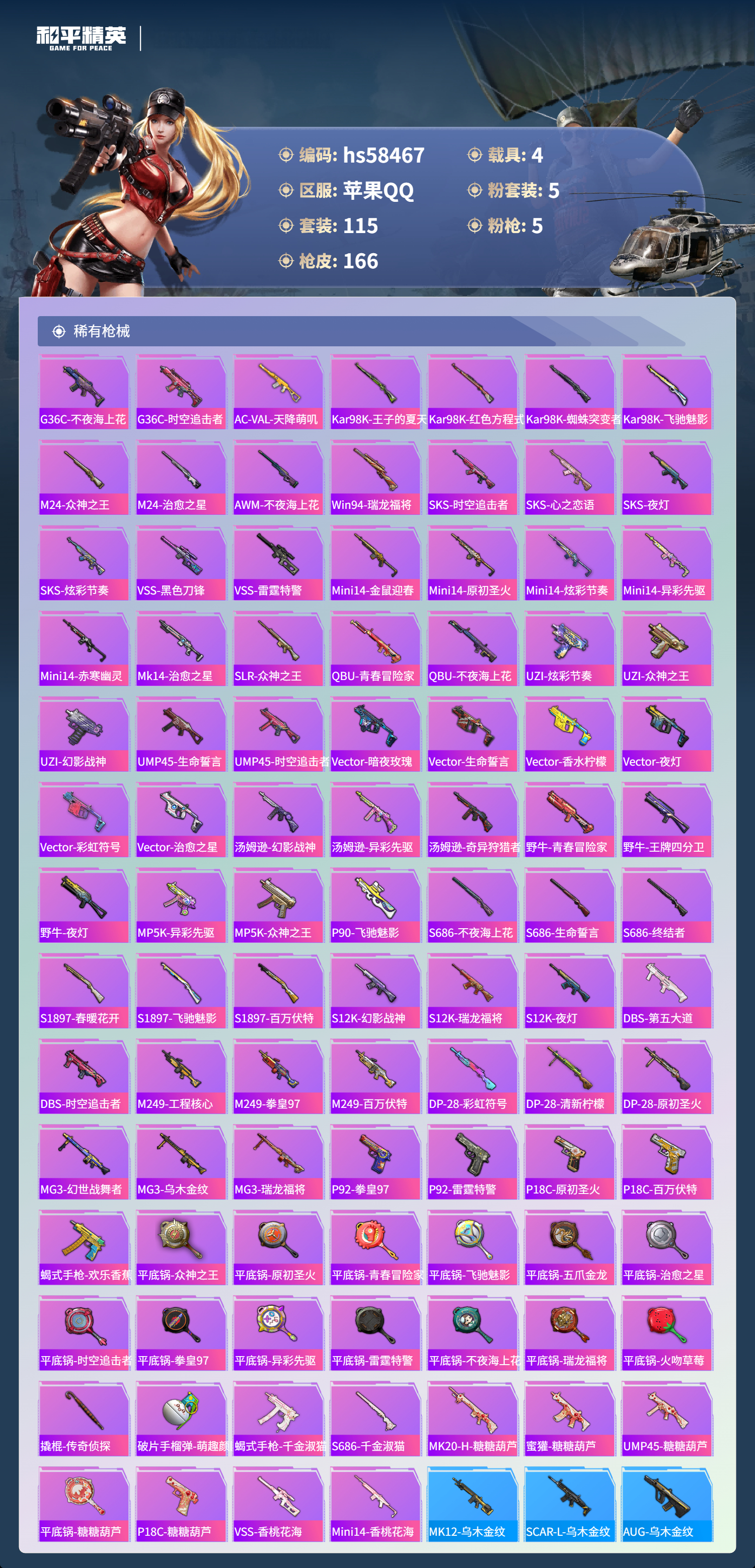 hs58467 苹果手q-6王牌印记-5粉装-5特效呛-4载具-54954热力值-115套装-166呛皮【5粉装】套装-金属狂野套装-星际漫游者套装-木曜青龙套装-蝶舞迷情套装-缤纷油彩【5特效呛】akm-炫紫旋律/5级aks-74u-森灵之息/4级kar98k-伏魔团/4级m416-五爪金龙/3级m416-心之恋语/7级【1稀有紫装】雪山精英【4稀有载具】玛莎拉蒂ghib
