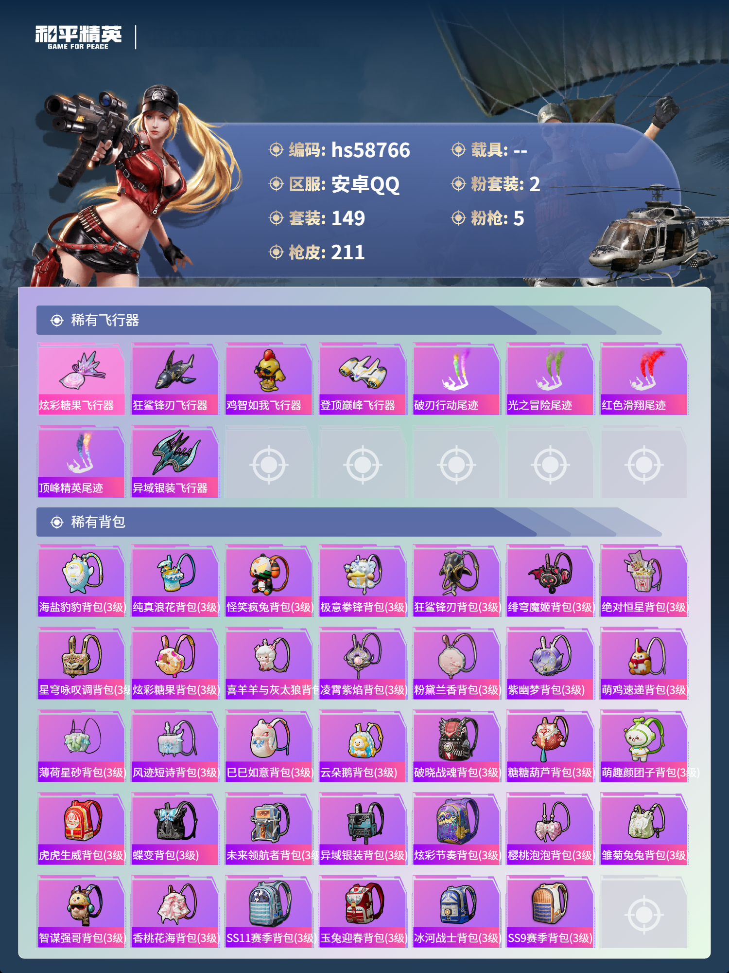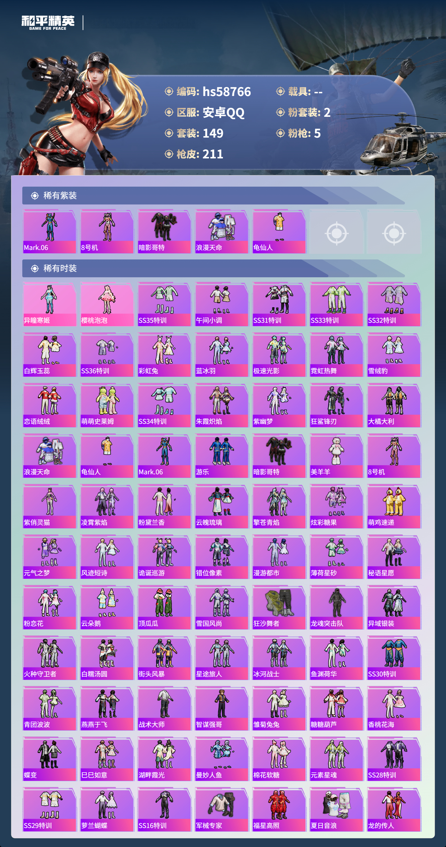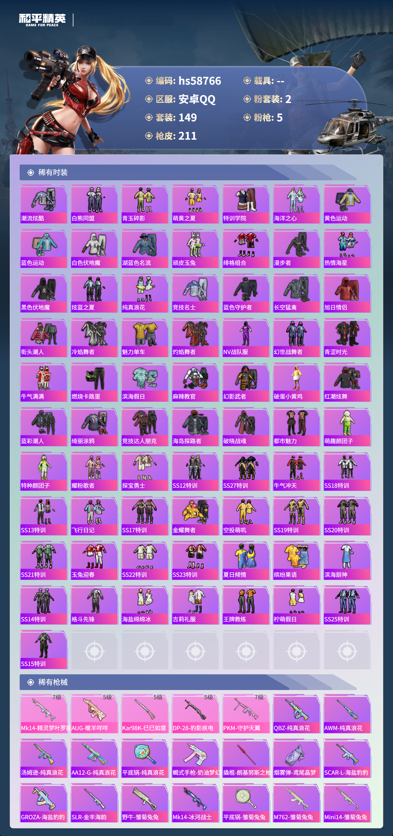 0载具-149套装-211呛皮-hs58766安卓手q-10王牌印记-2粉装-5特效呛-58274热力值-149套装-211呛皮-2卓越印记【2粉装】角色-异瞳寒姬角色-樱桃泡泡【5特效呛】mk14-精灵梦叶罗丽/7级dp-28-豹影疾电/5级aug-暖羊咩咩/5级kar98k-巳巳如意/5级pkm-守护天翼/7级【5稀有紫装】mark.068号机暗影哥特浪漫天命龟仙人【148稀有时装】异瞳寒姬ss3