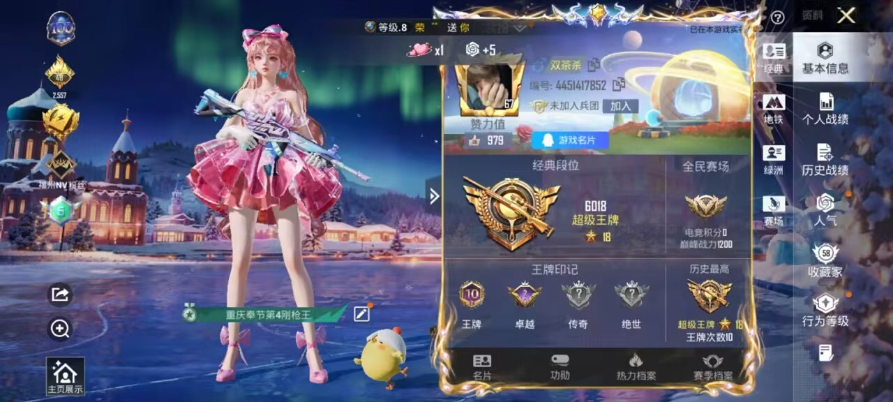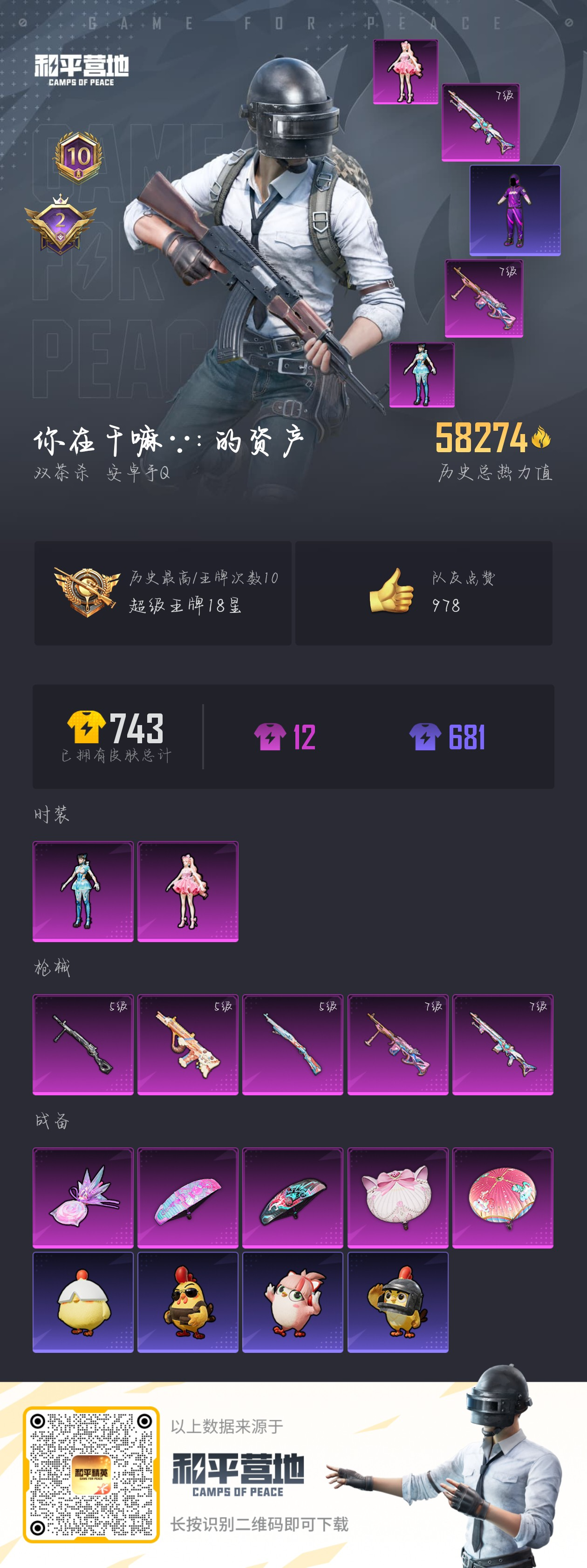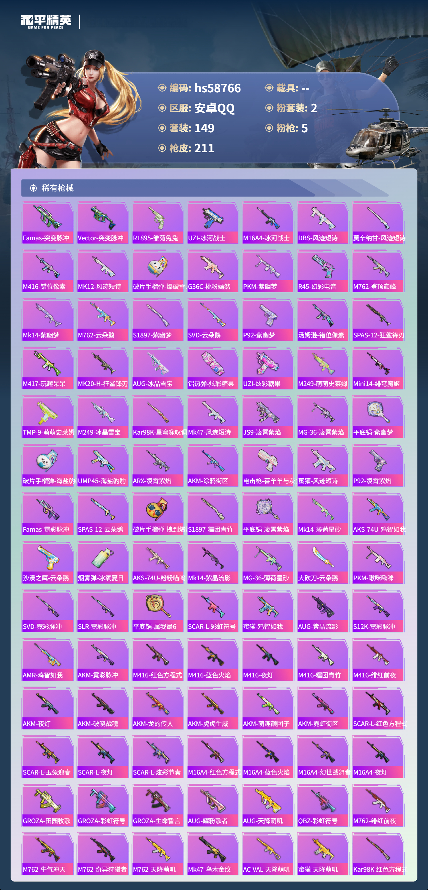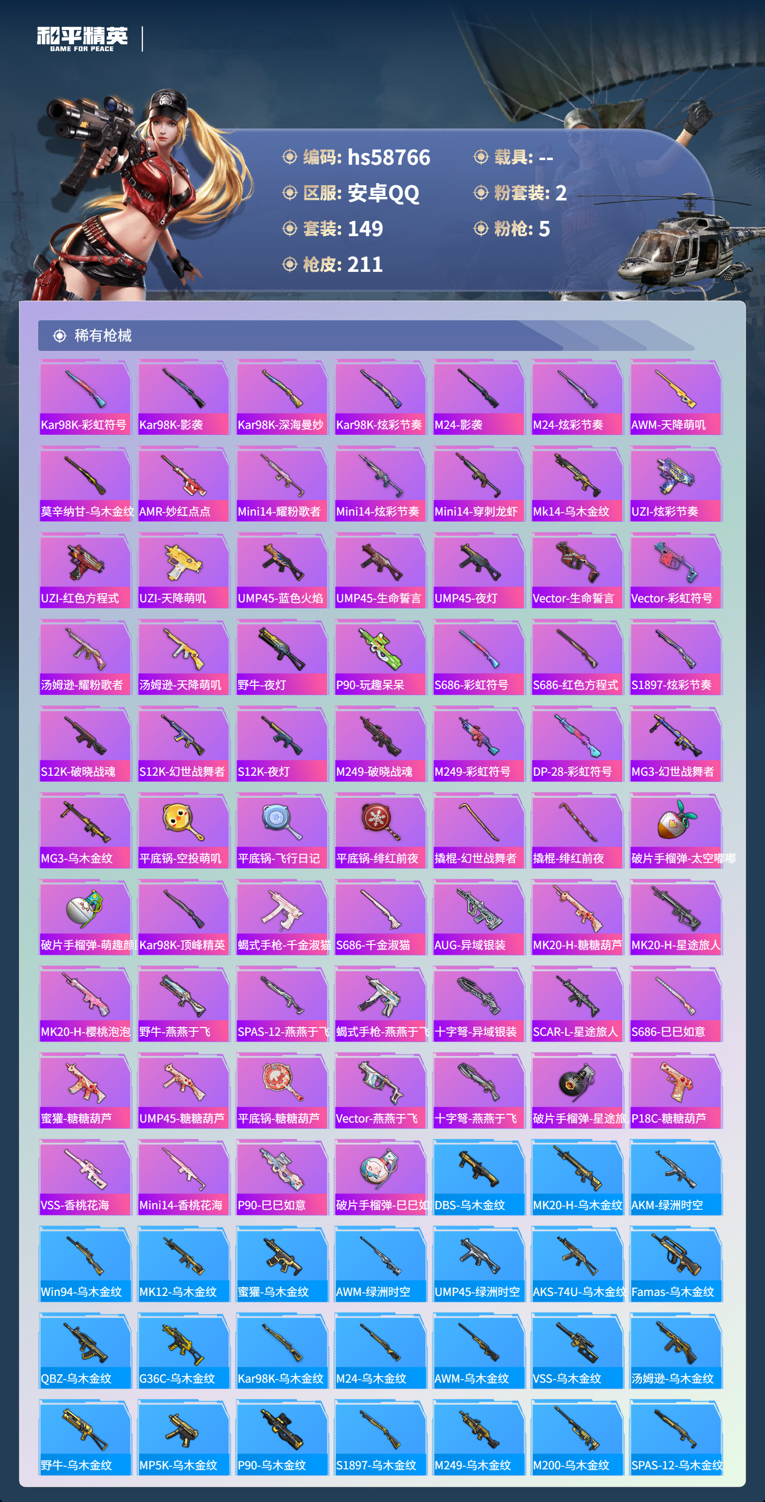 0载具-149套装-211呛皮-hs58766安卓手q-10王牌印记-2粉装-5特效呛-58274热力值-149套装-211呛皮-2卓越印记【2粉装】角色-异瞳寒姬角色-樱桃泡泡【5特效呛】mk14-精灵梦叶罗丽/7级dp-28-豹影疾电/5级aug-暖羊咩咩/5级kar98k-巳巳如意/5级pkm-守护天翼/7级【5稀有紫装】mark.068号机暗影哥特浪漫天命龟仙人【148稀有时装】异瞳寒姬ss3