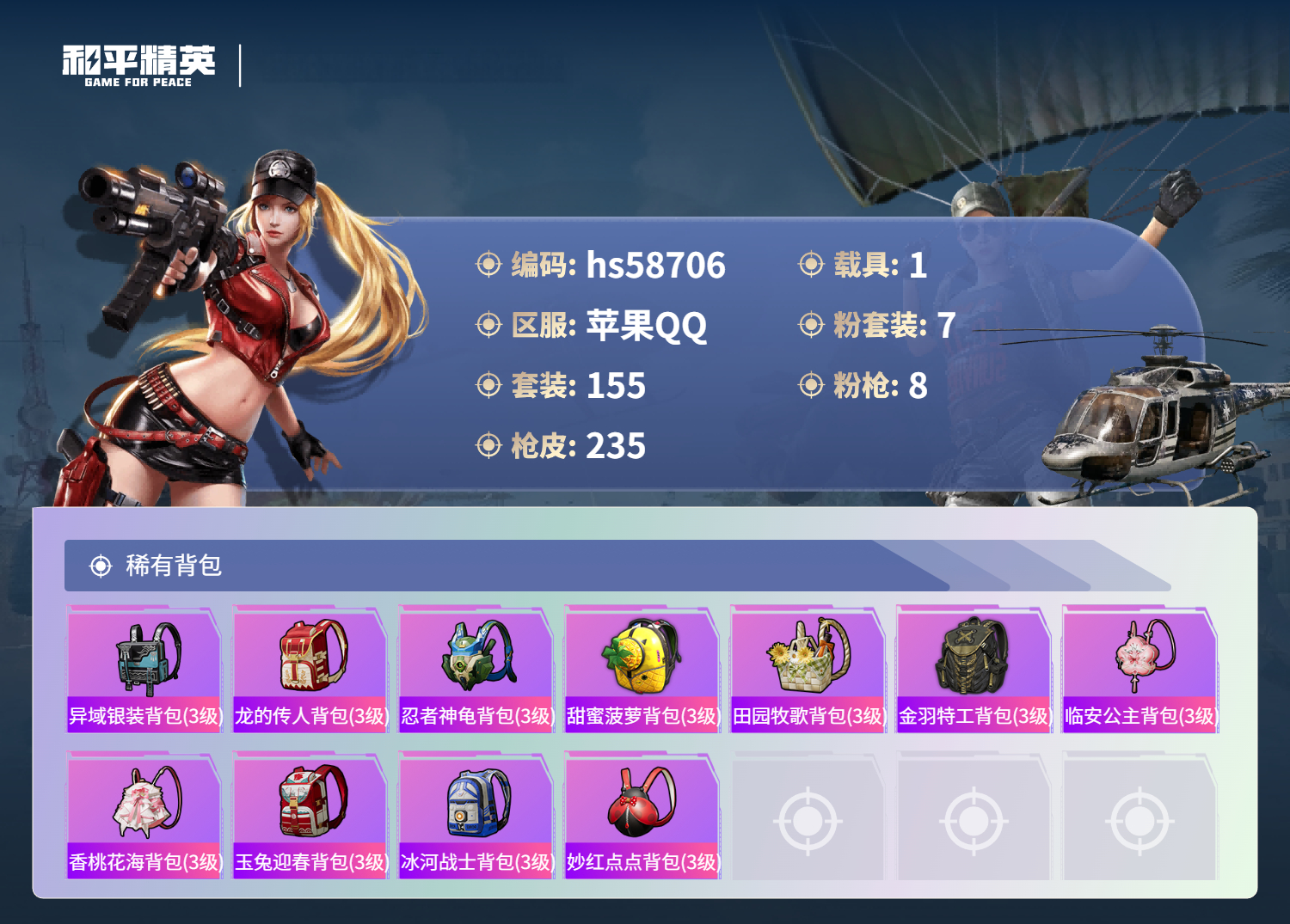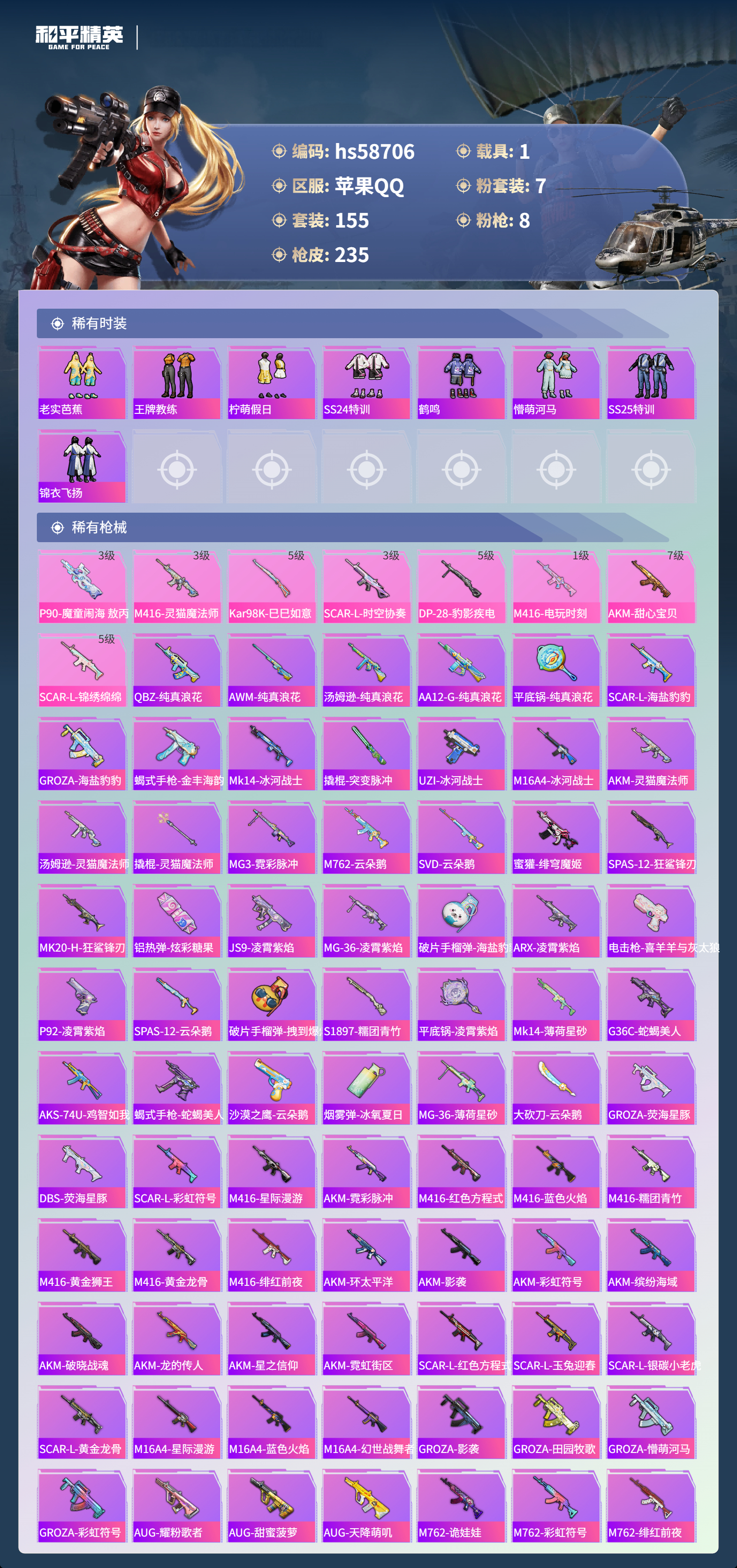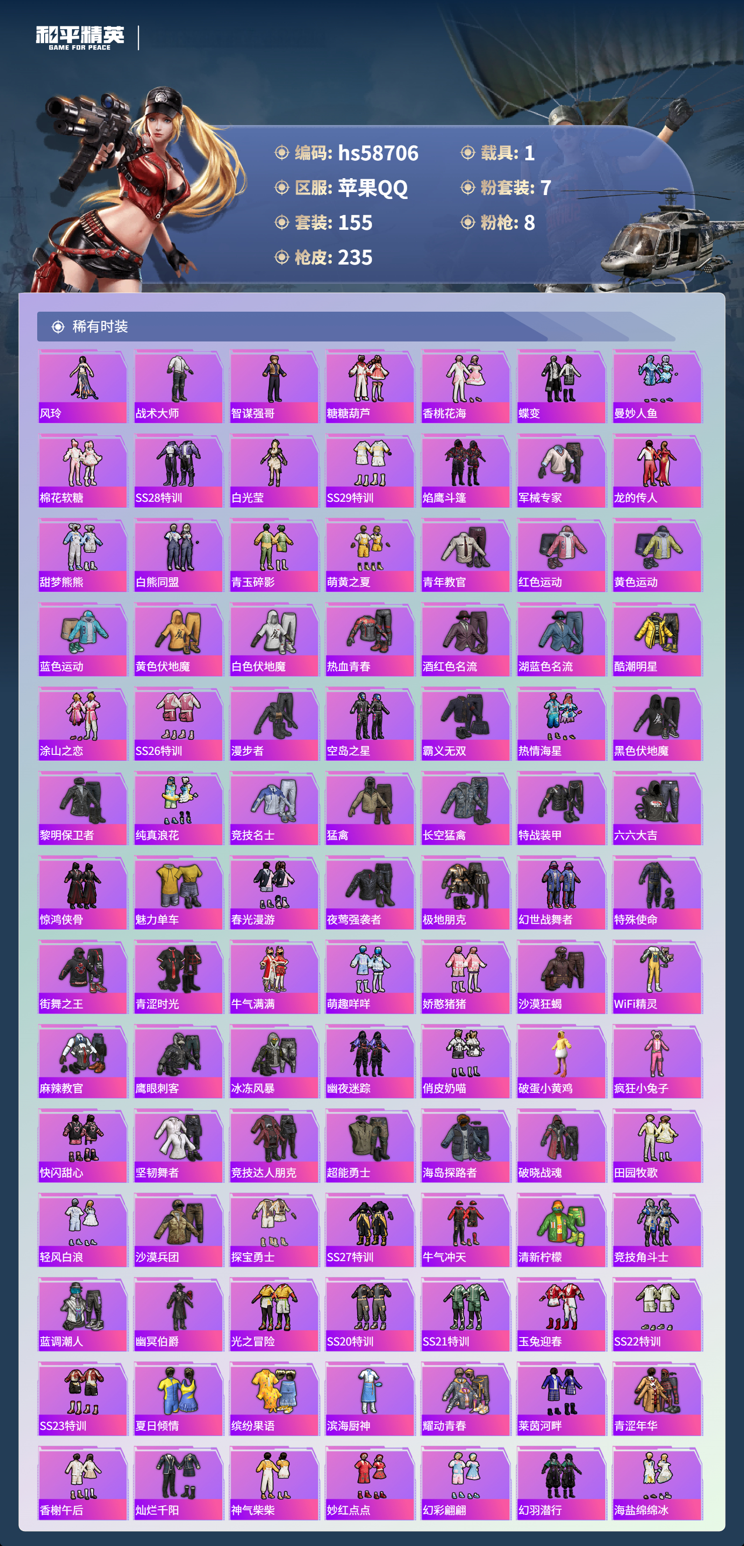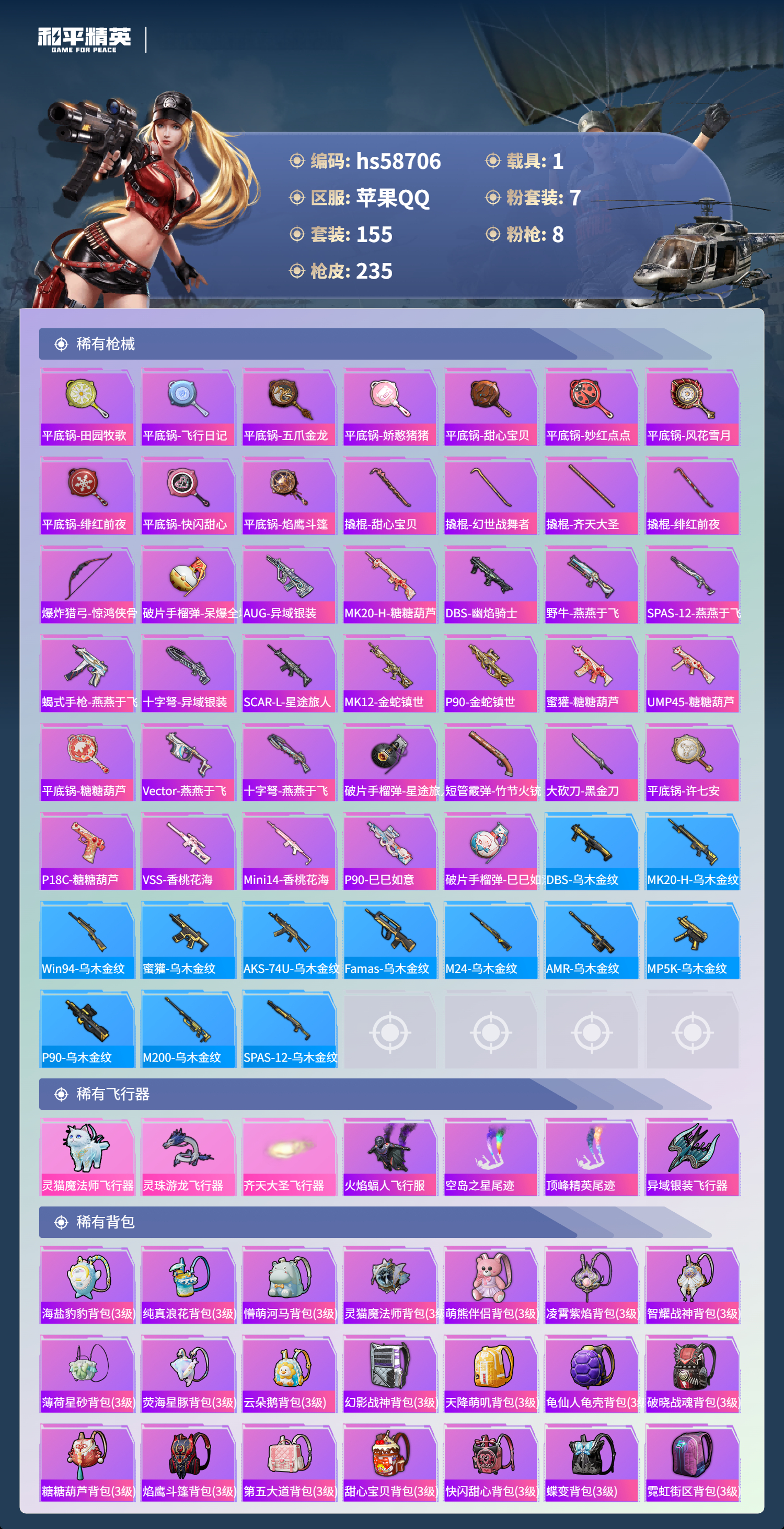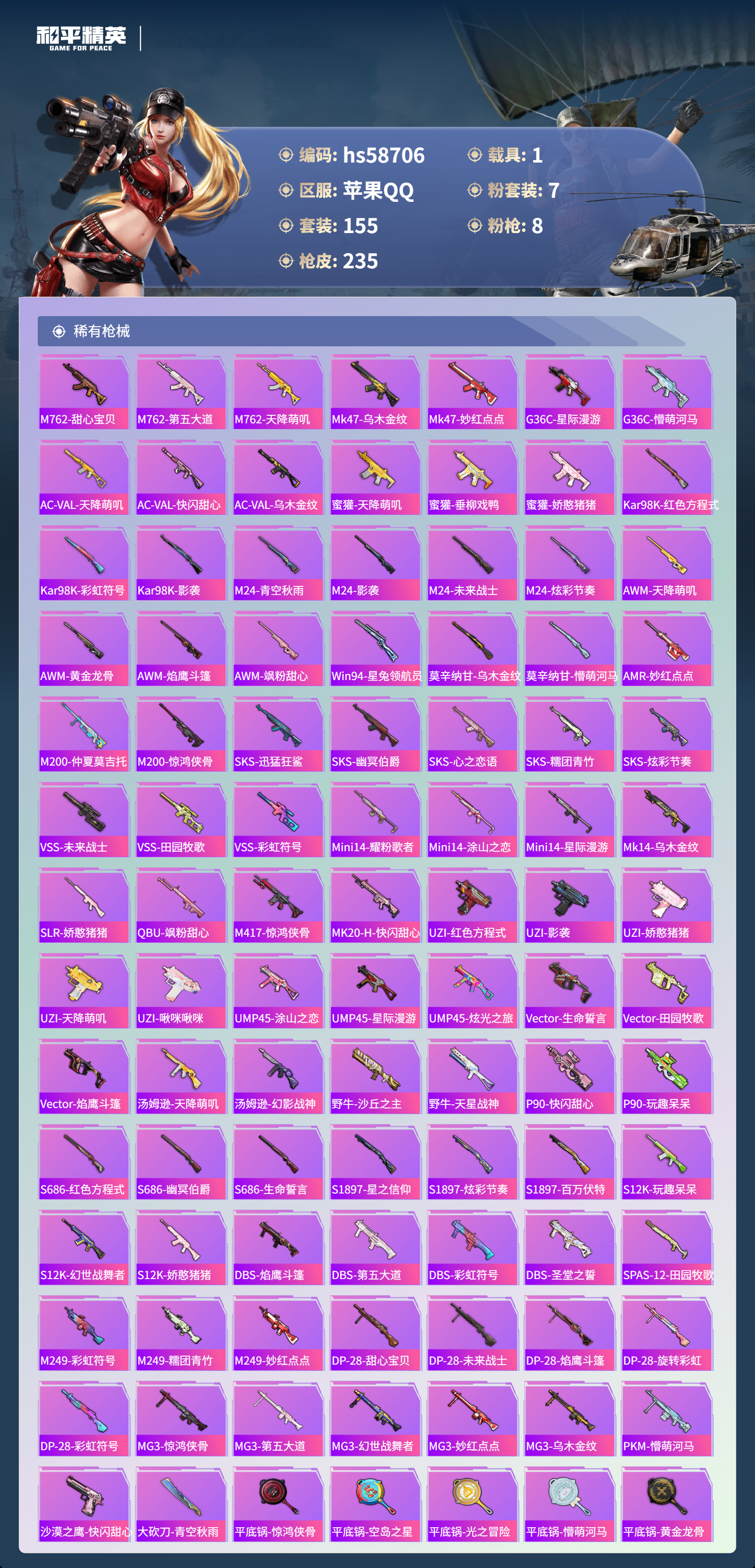 hs58706 苹果手q-15王牌印记-1红装-7粉装-8特效呛-1载具-70775热力值-155套装-235呛皮-1卓越印记【1红装】魔童闹海-敖丙/2级【7粉装】套装-炫光之旅套装-甜心巧克力套装-天使彩虹糖套装-宝贝奶油派角色-异瞳寒姬角色-宙之时溯角色-冷漠罗丽【8特效呛】scar-l-锦绣绵绵/5级m416-电玩时刻/1级akm-甜心宝贝/7级scar-l-时空协
