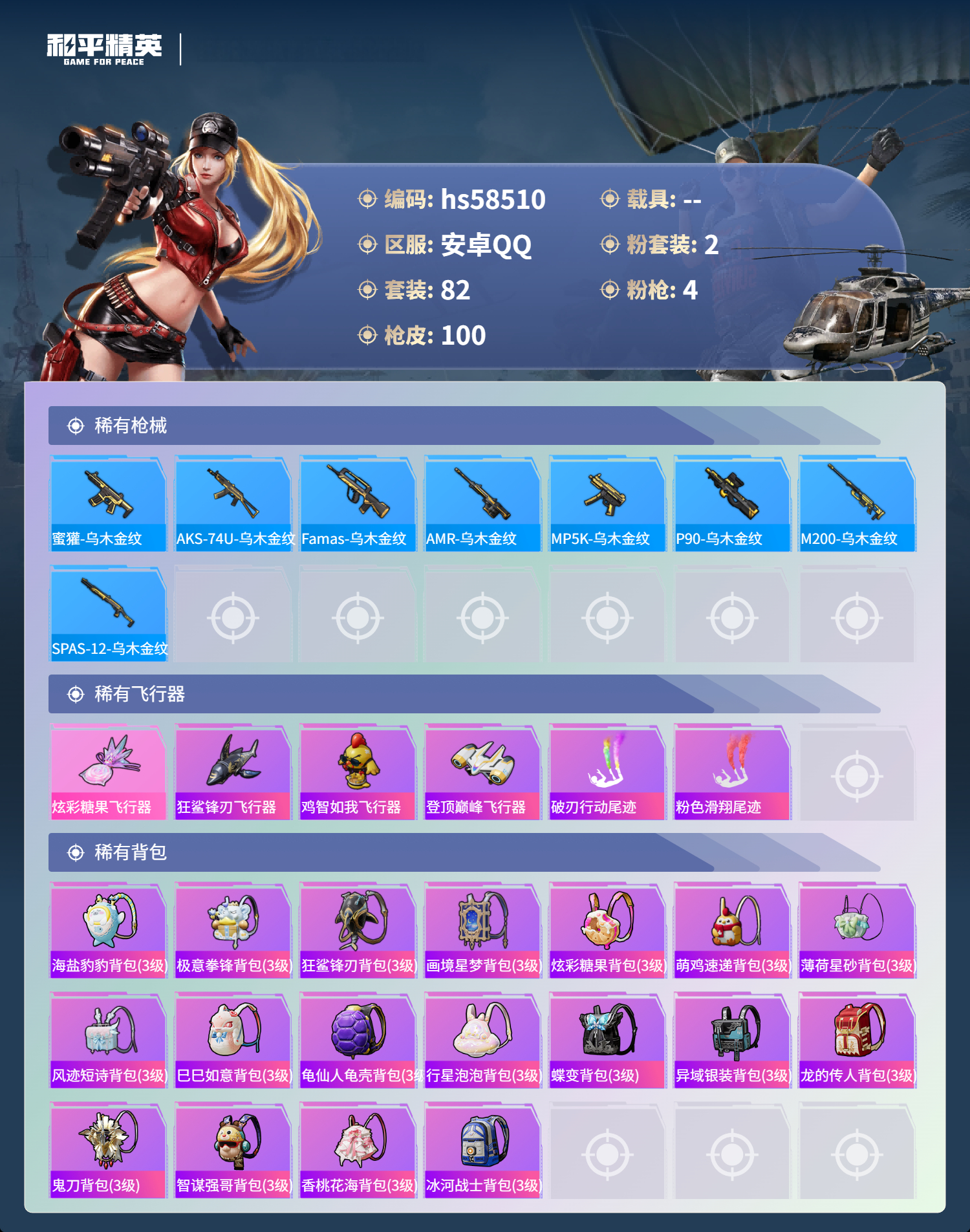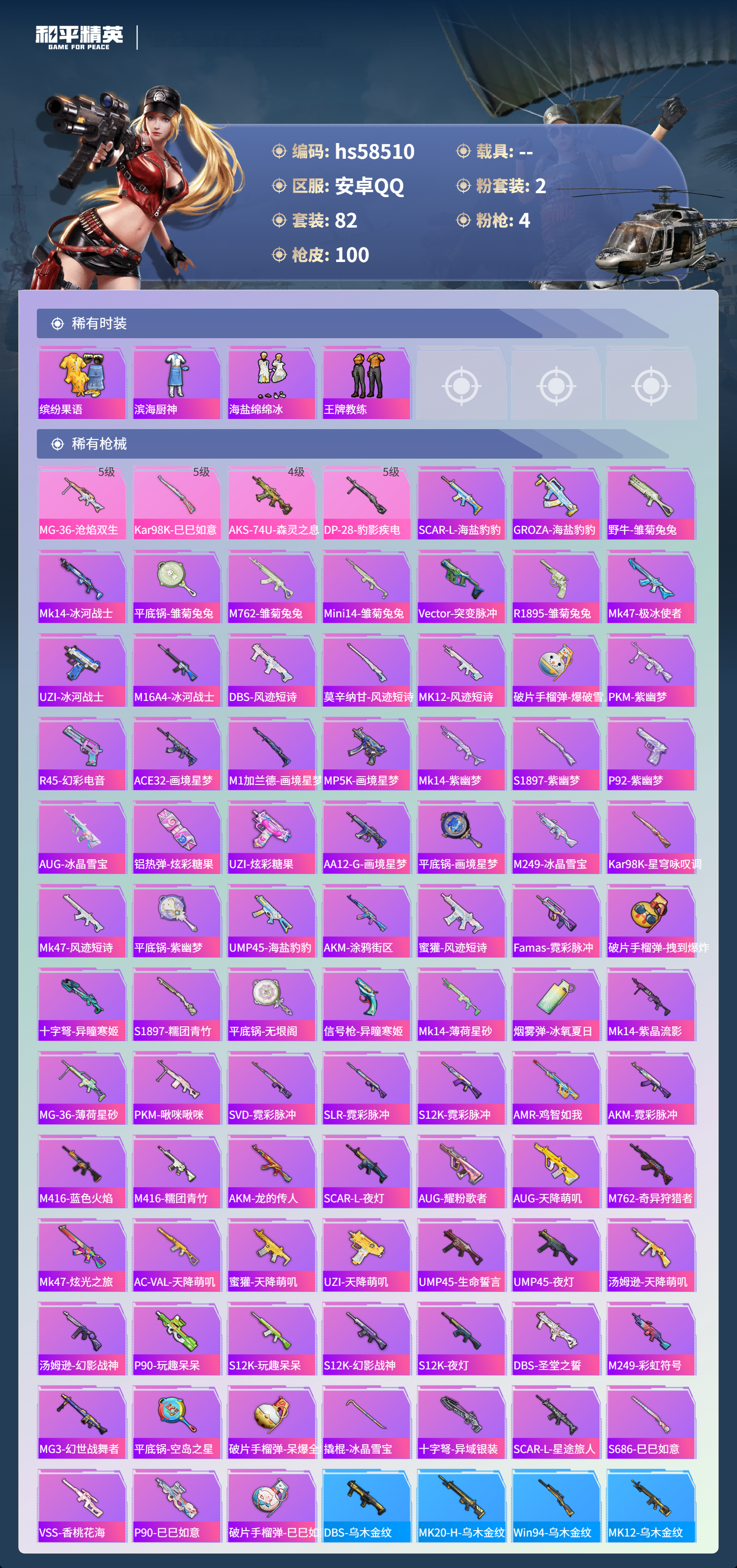 hs58510 安卓手q-0王牌印记-2粉装-4特效呛-27911热力值-82套装-100呛皮【2粉装】角色-异瞳寒姬时空协奏·火花【4特效呛】aks-74u-森灵之息/4级kar98k-巳巳如意/5级dp-28-豹影疾电/5级mg-36-沧焰双生/5级【3稀有紫装】浪漫天命小丑鱼龟仙人【81稀有时装】异瞳寒姬午间小调ss31特训ss32特训蓝冰羽琴音绮想极速光影