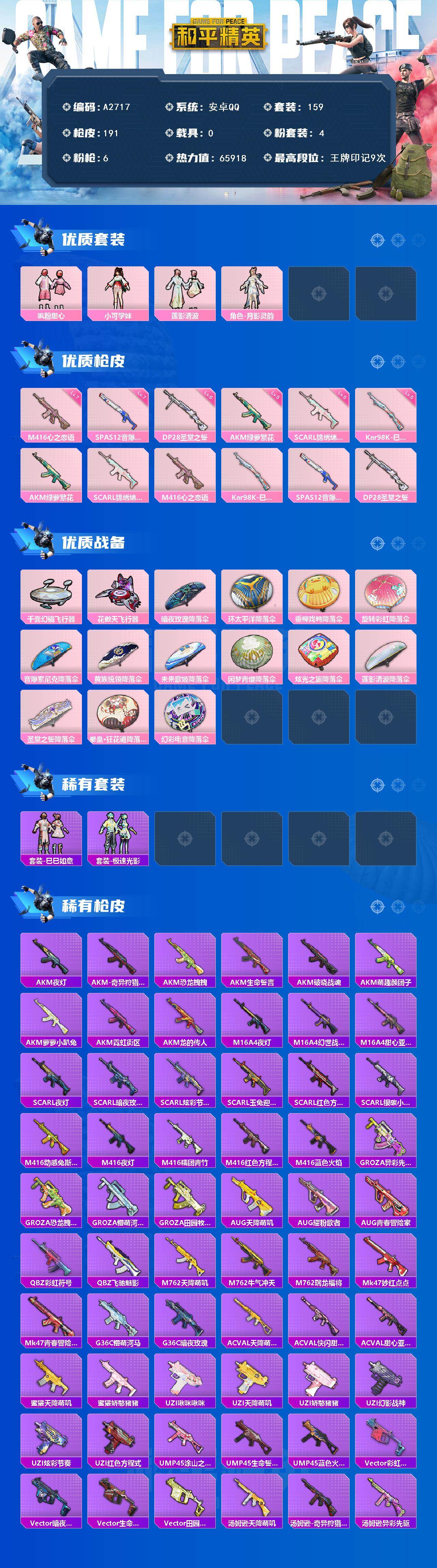 [16006617]安卓【小号 粉装-飒粉甜心/akm-绿萝繁花五级/角色-小可学妹/scar-l-锦绣绵绵五级/套装-龟仙人】 手q-4粉装-6特效呛-0载具-3粉色飞行器-65918热力值-9王牌印记-159套装-191呛皮 【热门品类】:套装-龟仙人 【粉色套装】:粉装-飒粉甜心,角色-小可学妹,粉装-莲影清波,角色-月影灵韵 【粉色呛皮等级】:akm-绿萝繁花五级,scar-l-锦绣绵绵五级,m416-心之恋语七级,kar98k-巳巳如意五级,spas-12-音爆索尼克七级,dp-28-圣堂之誓六级 【粉色呛皮】:akm-绿萝繁花,scar-l-锦绣绵绵,m416-心之恋语,kar98k-巳巳如意,spas-12-音爆索尼克,dp-28-圣堂之誓 【粉色飞行器】:千面幻镜飞行器,花傲天飞行器 【粉色降落伞】:暗夜玫瑰降落伞,环太平洋降落伞,垂柳戏鸭降落伞,旋转彩虹降落伞,音爆索尼克降落伞,黄族统领降落伞,未来歌姬降落伞,闲梦青缨降落伞,炫光之旅降落伞,莲影清波降落伞,圣堂之誓降落伞,拳皇·狂花道降落伞,幻彩电音降落伞 【稀有套装】:套装-龟仙人,套装-巳巳如意,套装-极速光影 【稀有呛皮】:akm-夜灯,akm-奇异狩猎者,akm-恐龙拽拽,akm-生命誓言,akm-破晓战魂,akm-萌趣颜团子,akm-萝萝小趴兔,akm-霓虹街区,akm-龙的传人,m16a4-夜灯,m16a4-幻世战舞者,m16a4-甜心亚梦,scar-l-夜灯,scar-l-暗夜玫瑰,scar-l-炫彩节奏,scar-l-玉兔迎春,scar-l-红色方程式,scar-l-银碳小老虎,m416-动感兔斯基,m416-夜灯,m416-糯团青竹,m416-红色方程式,m416-蓝色火焰,groza-异彩先驱,groza-恐龙拽拽,groza-懵萌河马,groza-田园牧歌,aug-天降萌叽,aug-耀粉歌者,aug-青春冒险家,q-彩虹符号,q-飞驰魅影,m762-天降萌叽,m762-牛气冲天,m762-瑞龙福将,mk47-妙红点点,mk47-青春冒险家,g36c-懵萌河马,g36c-暗夜玫瑰,ac-val-天降萌叽,ac-val-快闪甜心,ac-val-甜心亚梦,蜜獾-天降萌叽,蜜獾-娇憨猪猪,uzi-啾咪啾咪,uzi-天降萌叽,uzi-娇憨猪猪,uzi-幻影战神,u