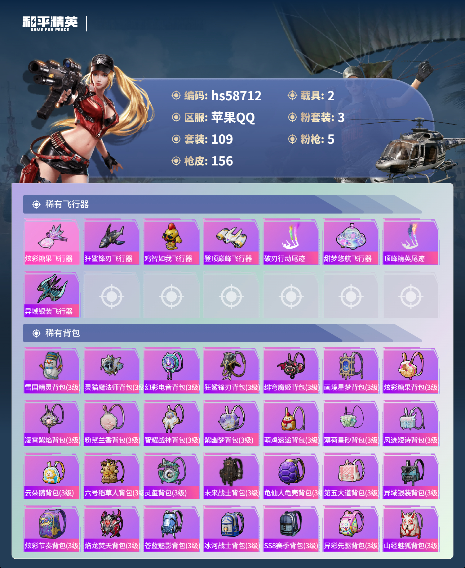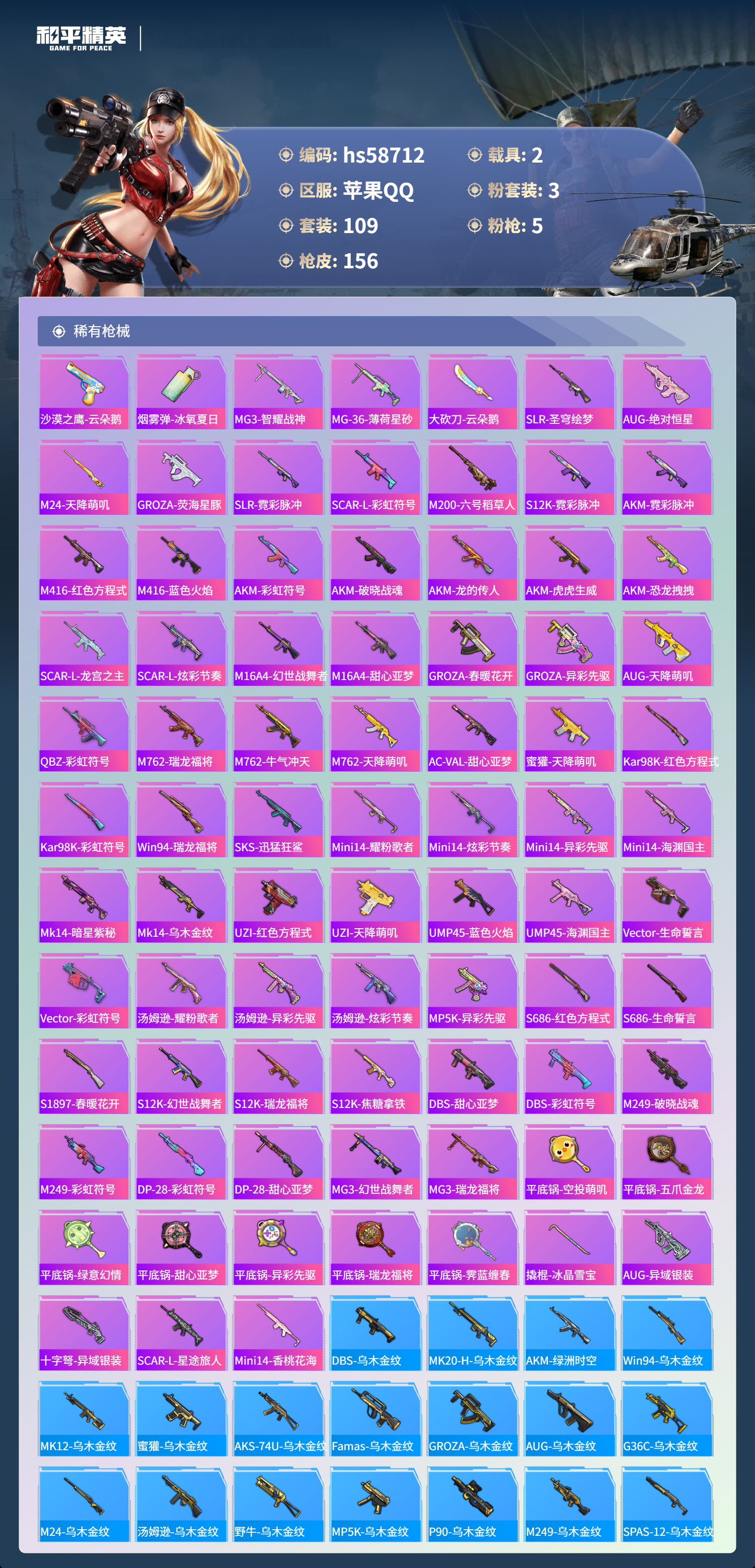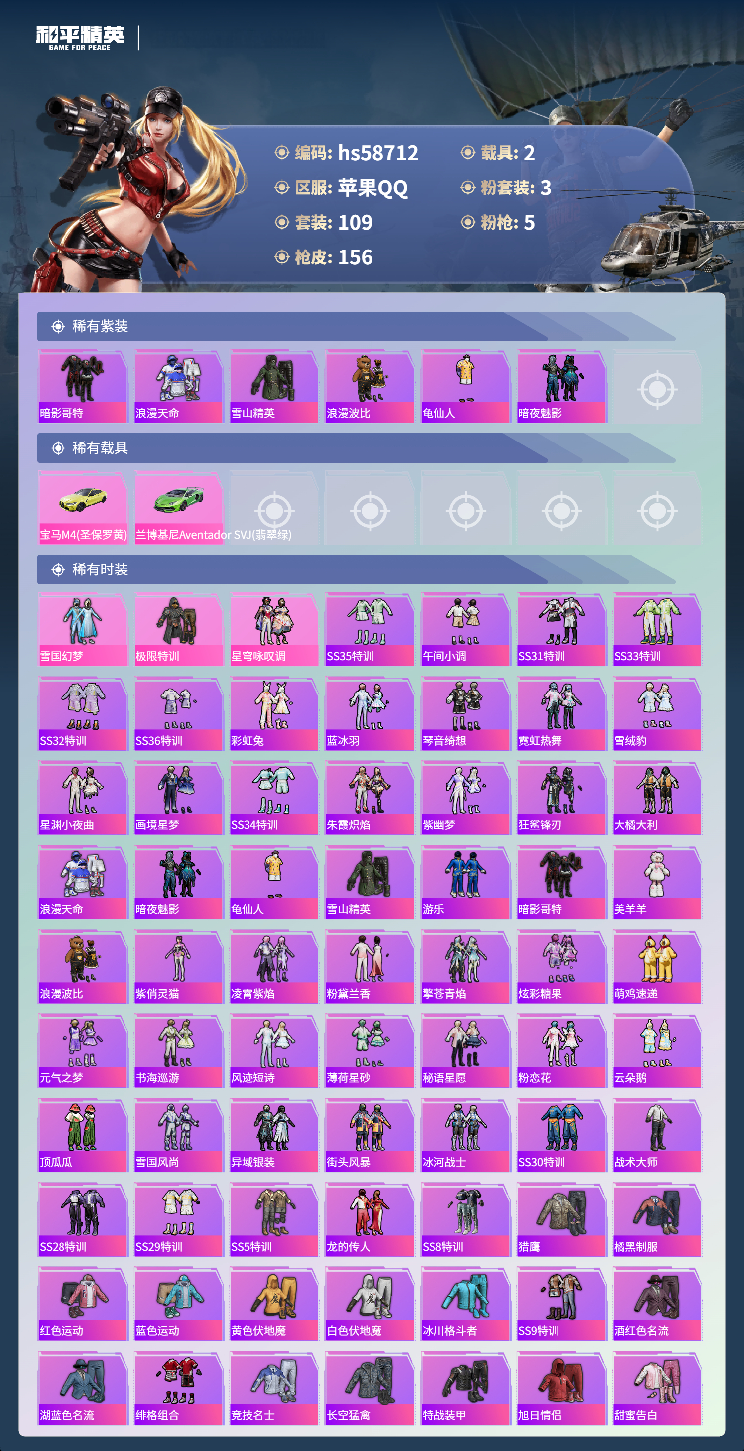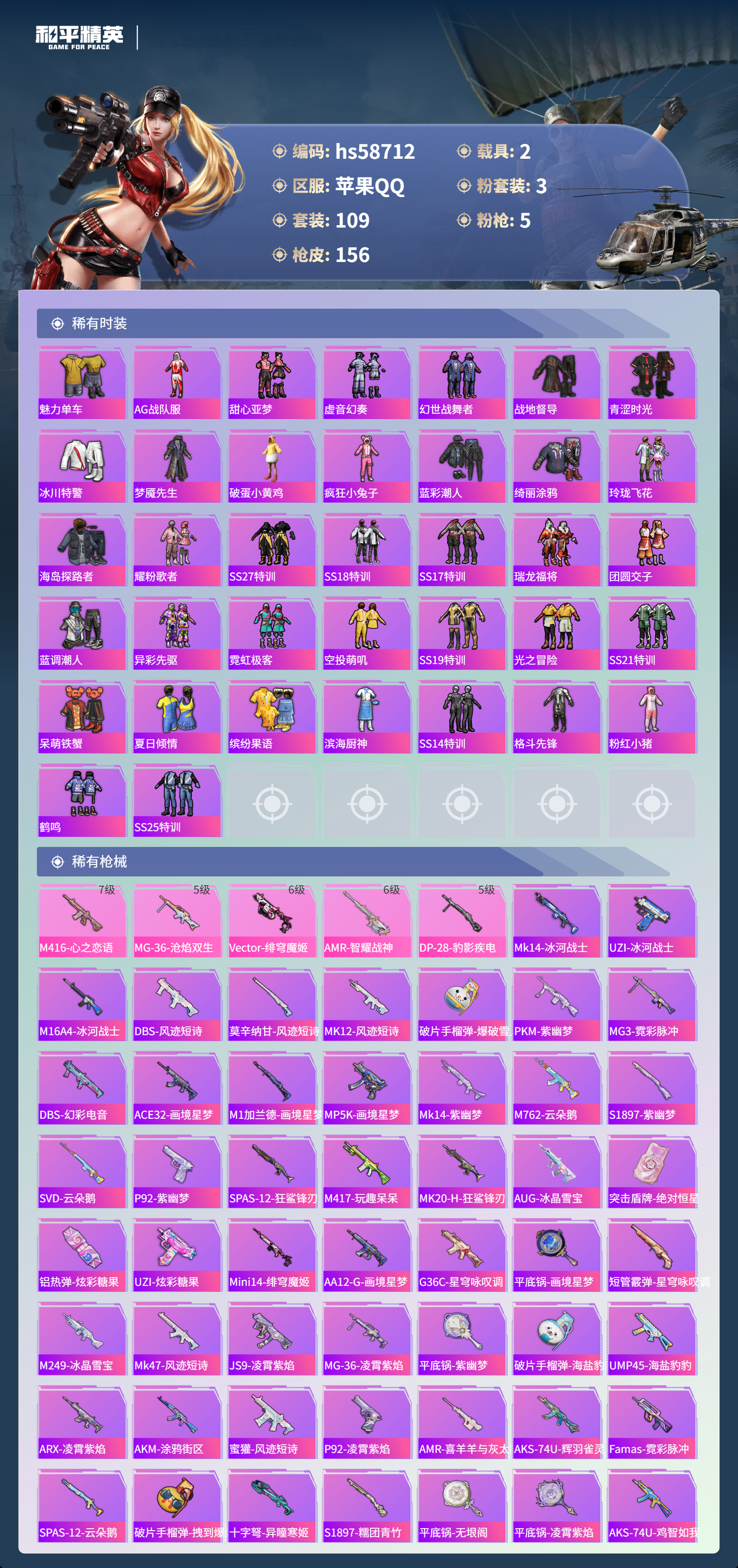 hs58712 苹果手q-6王牌印记-3粉装-5特效呛-2载具-49286热力值-109套装-156呛皮-5卓越印记-2传奇印记【3粉装】套装-雪国幻梦套装-星穹咏叹调套装-极限特训【5特效呛】mg-36-沧焰双生/5级dp-28-豹影疾电/5级amr-智耀战神/6级vect-绯穹魔姬/6级m416-心之恋语/7级【6稀有紫装】暗影哥特浪漫天命雪山精英浪漫波比龟仙人