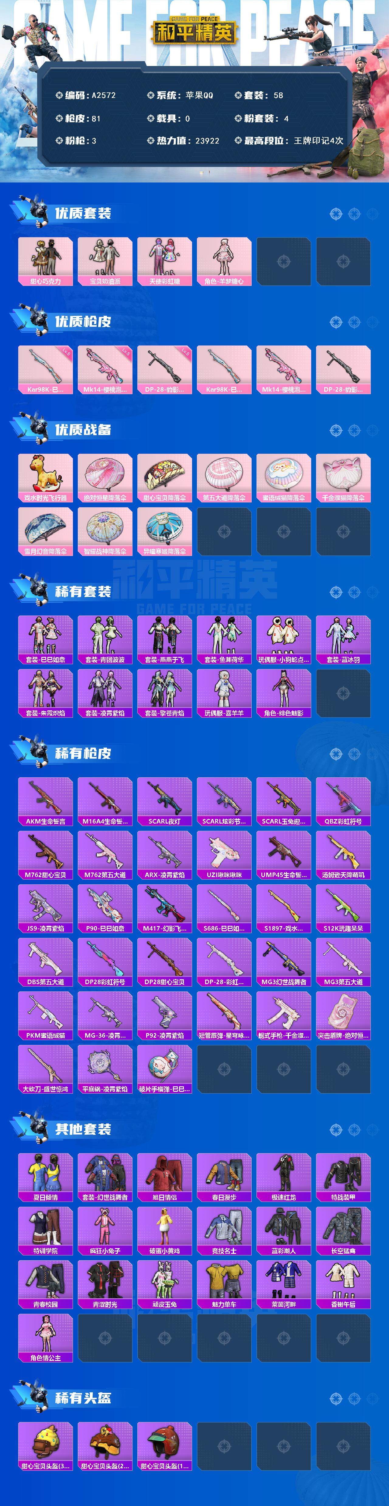 [16006659]苹果【公主号 粉装-甜心巧克力/粉装-宝贝奶油派/kar98k-巳巳如意/mk14-樱桃泡泡/戏水时光飞行器】 手q-4粉装-3特效呛-0载具-2粉色飞行器-23922热力值-4王牌印记-58套装-81呛皮 【粉色套装】:粉装-甜心巧克力,粉装-宝贝奶油派,粉装-天使彩虹糖,角色-羊梦糖心 【粉色呛皮等级】:kar98k-巳巳如意五级,mk14-樱桃泡泡五级,dp-28-豹影疾电五级 【粉色呛皮】:kar98k-巳巳如意,mk14-樱桃泡泡,dp-28-豹影疾电 【粉色飞行器】:戏水时光飞行器 【粉色降落伞】:绝对恒星降落伞,甜心宝贝降落伞,第五大道降落伞,蜜语绒猫降落伞,千金淑猫降落伞,雪月幻音降落伞,智耀战神降落伞,异瞳寒姬降落伞,炫彩糖果降落伞 【稀有套装】:套装-巳巳如意,套装-雪国风尚,套装-青团波波,套装-燕燕于飞,套装-鱼渊荷华,玩偶服-小狗蛇点点,套装-蓝冰羽,套装-朱霞炽焰,套装-凌霄紫焰,套装-擎苍青焰,玩偶服-喜羊羊,角色-绯色魅影,套装-炫彩糖果 【稀有呛皮】:aug-冰晶雪宝,akm-生命誓言,m16a4-生命誓言,scar-l-夜灯,scar-l-炫彩节奏,scar-l-玉兔迎春,q-彩虹符号,m762-甜心宝贝,m762-第五大道,arx-凌霄紫焰,uzi-啾咪啾咪,ump45-生命誓言,汤姆逊-天降萌叽,js9-凌霄紫焰,p90-巳巳如意,m417-幻影飞狐,s686-巳巳如意,s1897-戏水时光,s12k-玩趣呆呆,dbs-第五大道,dp-28-彩虹符号,dp-28-甜心宝贝,dp-28-彩虹独角兽,mg3-幻世战舞者,mg3-第五大道,pkm-蜜语绒猫,mg-36-凌霄紫焰,p92-凌霄紫焰,短管霰弹-星穹咏叹调,蝎式手呛-千金淑猫,突击盾牌-绝对恒星,大砍刀-盛世惊鸿,平底锅-凌霄紫焰,破片手留单-巳巳如意 【其他套装】:套装-夏日倾情,套装-幻世战舞者,套装-旭日情侣,套装-春日漫步,套装-极速红龙,套装-特战装甲,套装-特训学院,套装-疯狂小兔子,套装-破蛋小黄鸡,套装-竞技名士,套装-蓝彩潮人,套装-长空猛禽,套装-青春校园,套装-青涩时光,套装-顽皮玉兔,套装-魅力单车,套装-莱茵河畔,套装-香榭午后,角色-情公主 【稀有头盔】:甜心宝贝头盔3级,甜心宝贝头盔2级,甜心宝贝头盔1级 【稀有