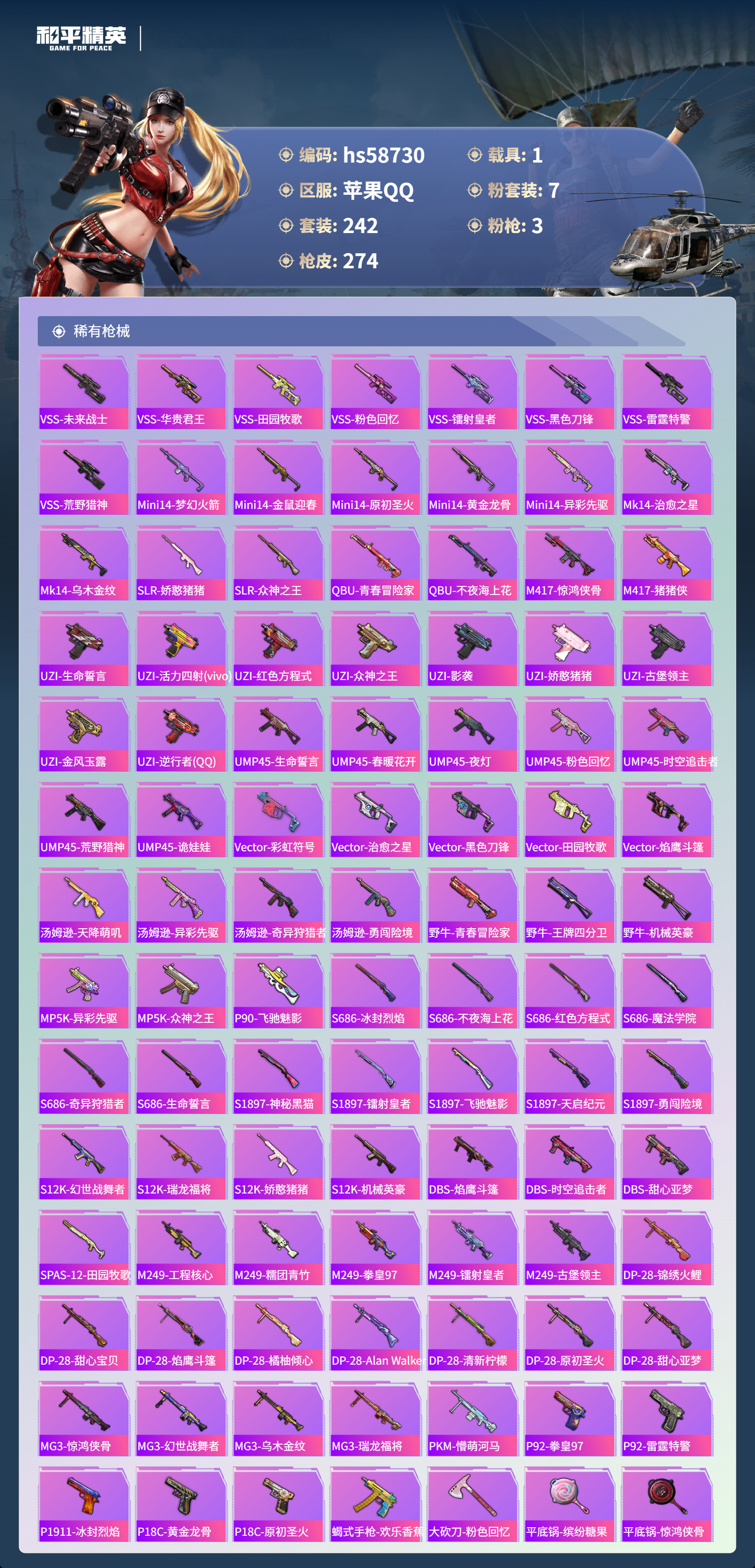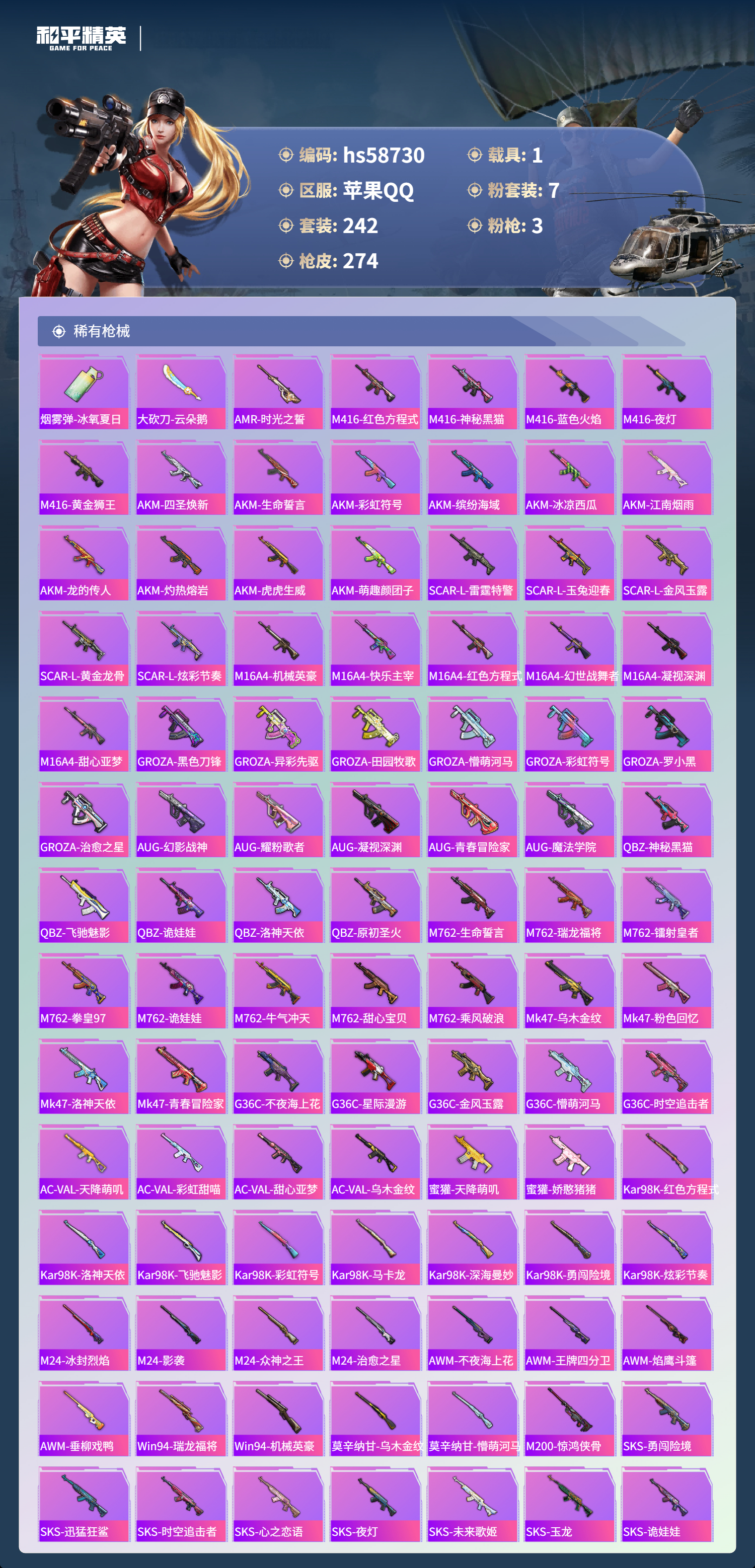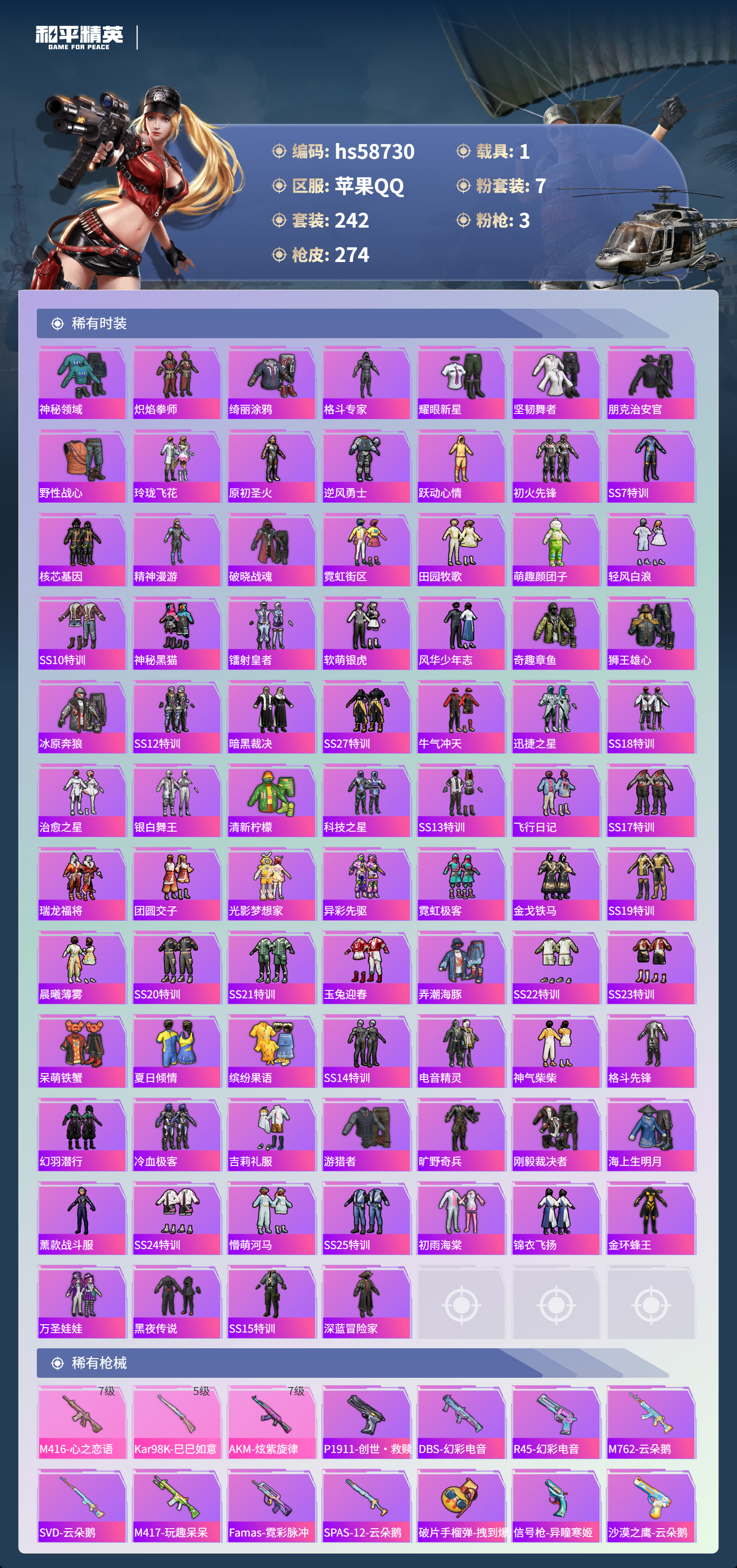 hs58730 苹果手q-22王牌印记-7粉装-3特效呛-1载具-93570热力值-242套装-274呛皮【7粉装】套装-天星战神套装-创世·救赎套装-华贵君王套装-宝贝奶油派套装-天使彩虹糖套装-向日葵套装-粉色回忆【3特效呛】m416-心之恋语/7级kar98k-巳巳如意/5级akm-炫紫旋律/7级【8稀有紫装】奇异狩猎者暗影哥特深海小丑鱼雪山精英浪漫波比迅捷狂
