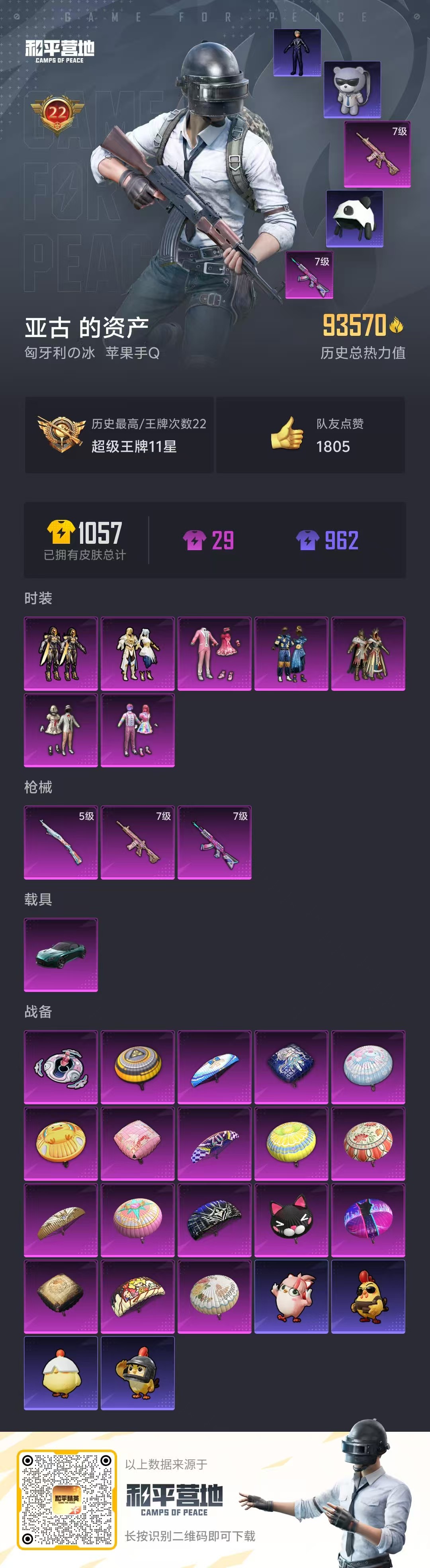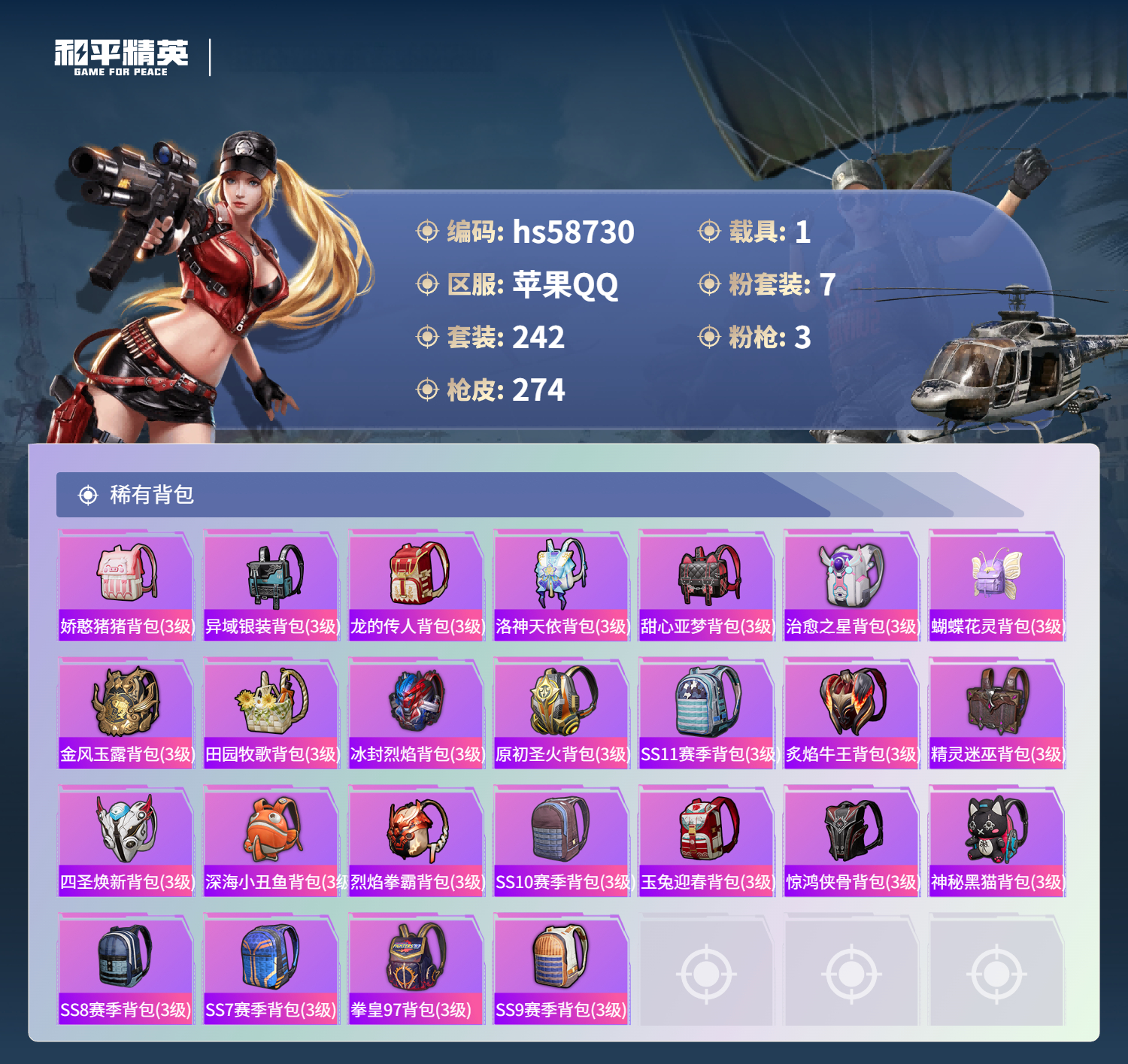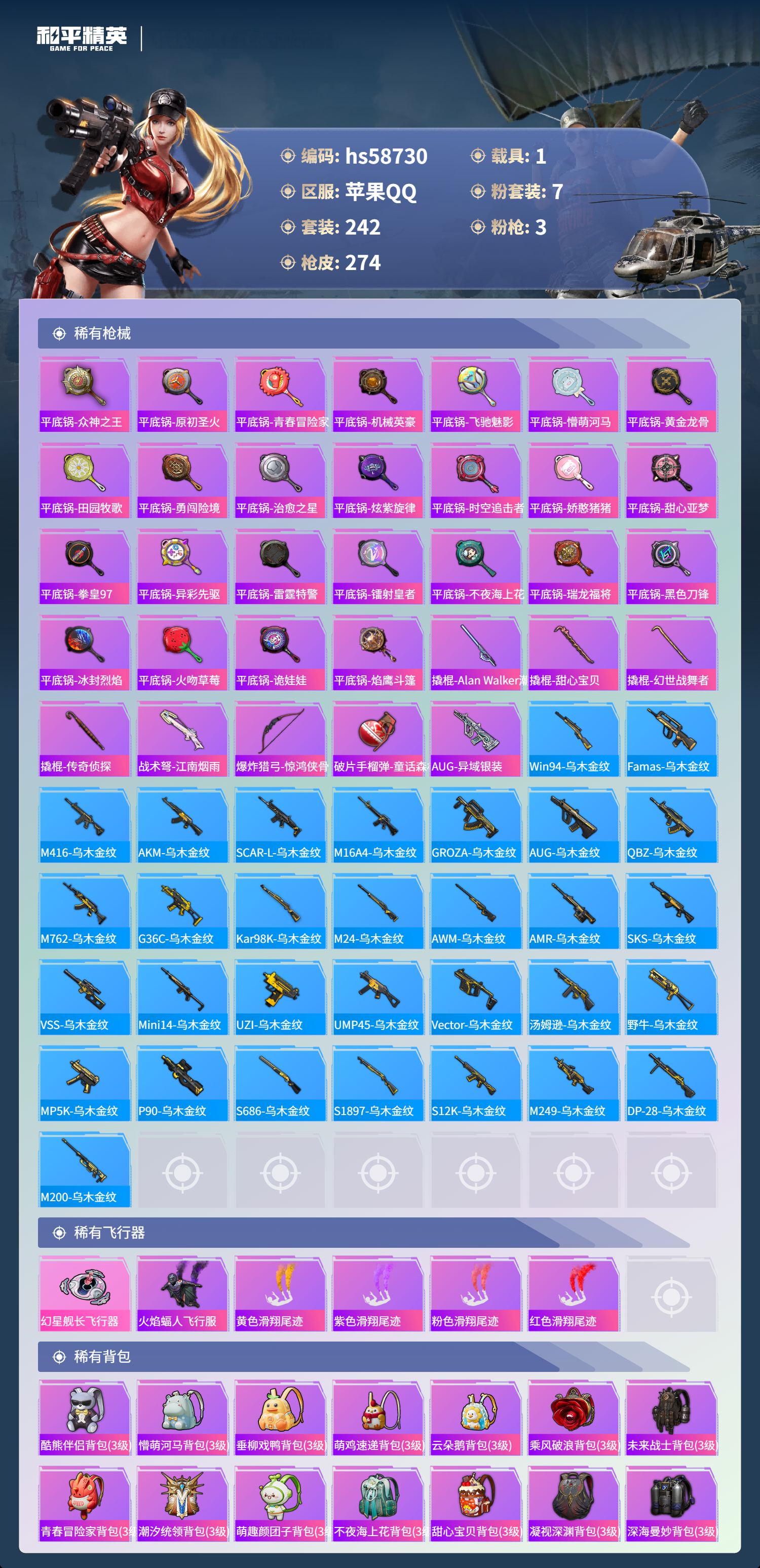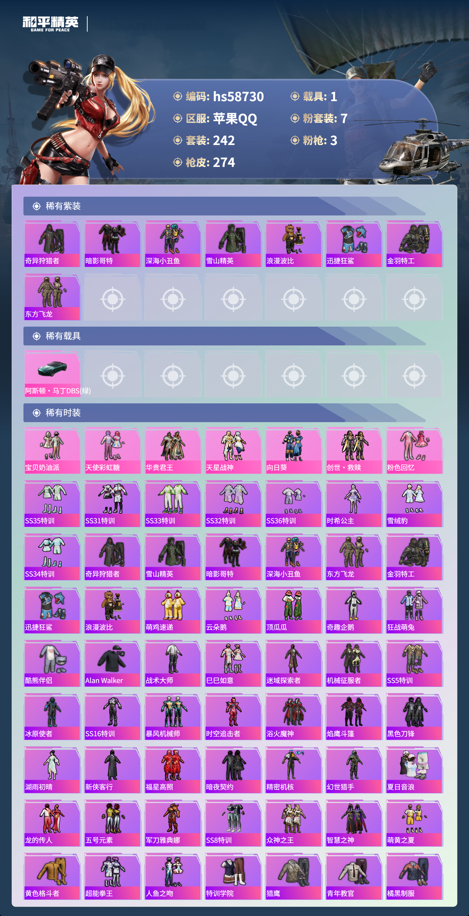 hs58730 苹果手q-22王牌印记-7粉装-3特效呛-1载具-93570热力值-242套装-274呛皮【7粉装】套装-天星战神套装-创世·救赎套装-华贵君王套装-宝贝奶油派套装-天使彩虹糖套装-向日葵套装-粉色回忆【3特效呛】m416-心之恋语/7级kar98k-巳巳如意/5级akm-炫紫旋律/7级【8稀有紫装】奇异狩猎者暗影哥特深海小丑鱼雪山精英浪漫波比迅捷狂