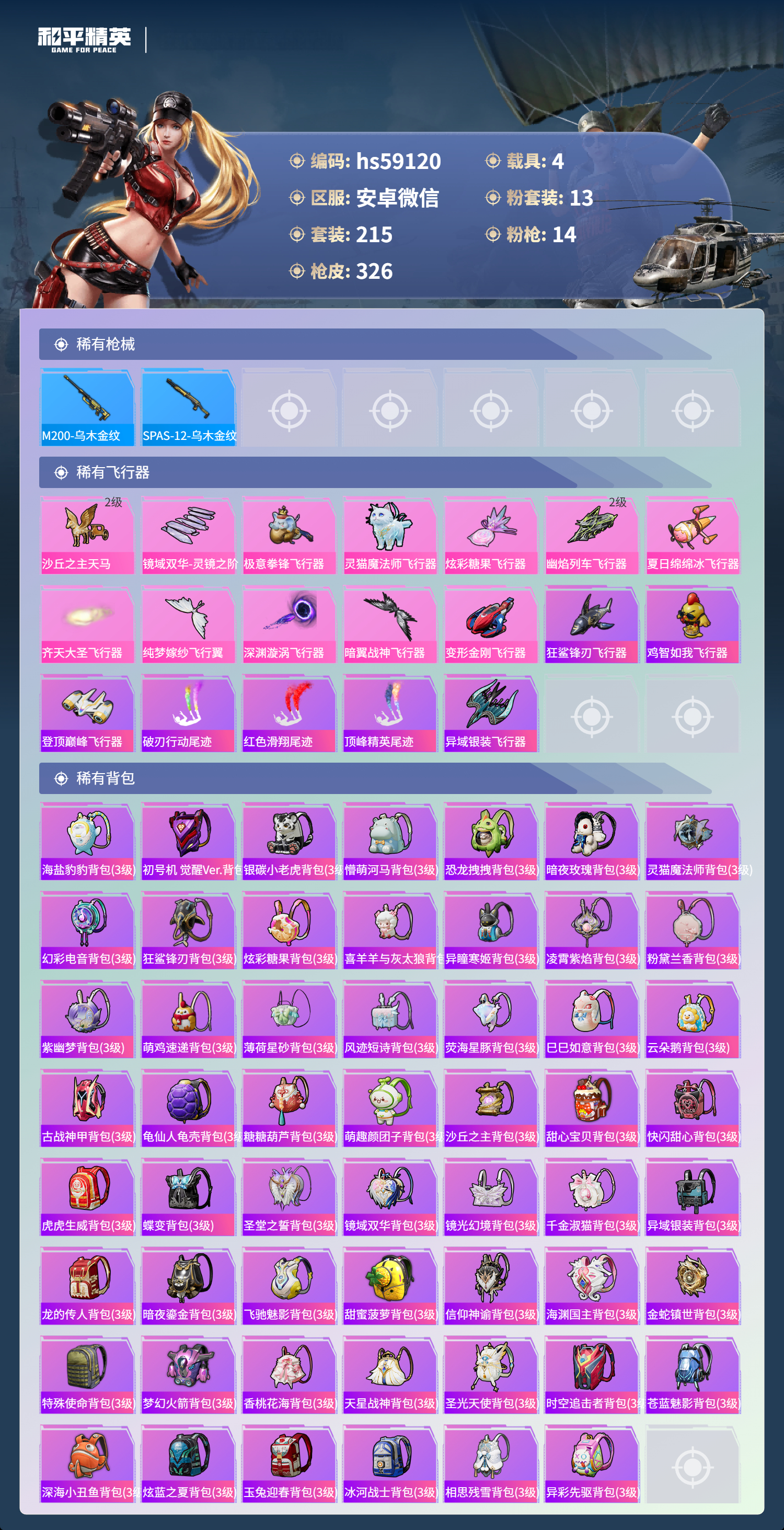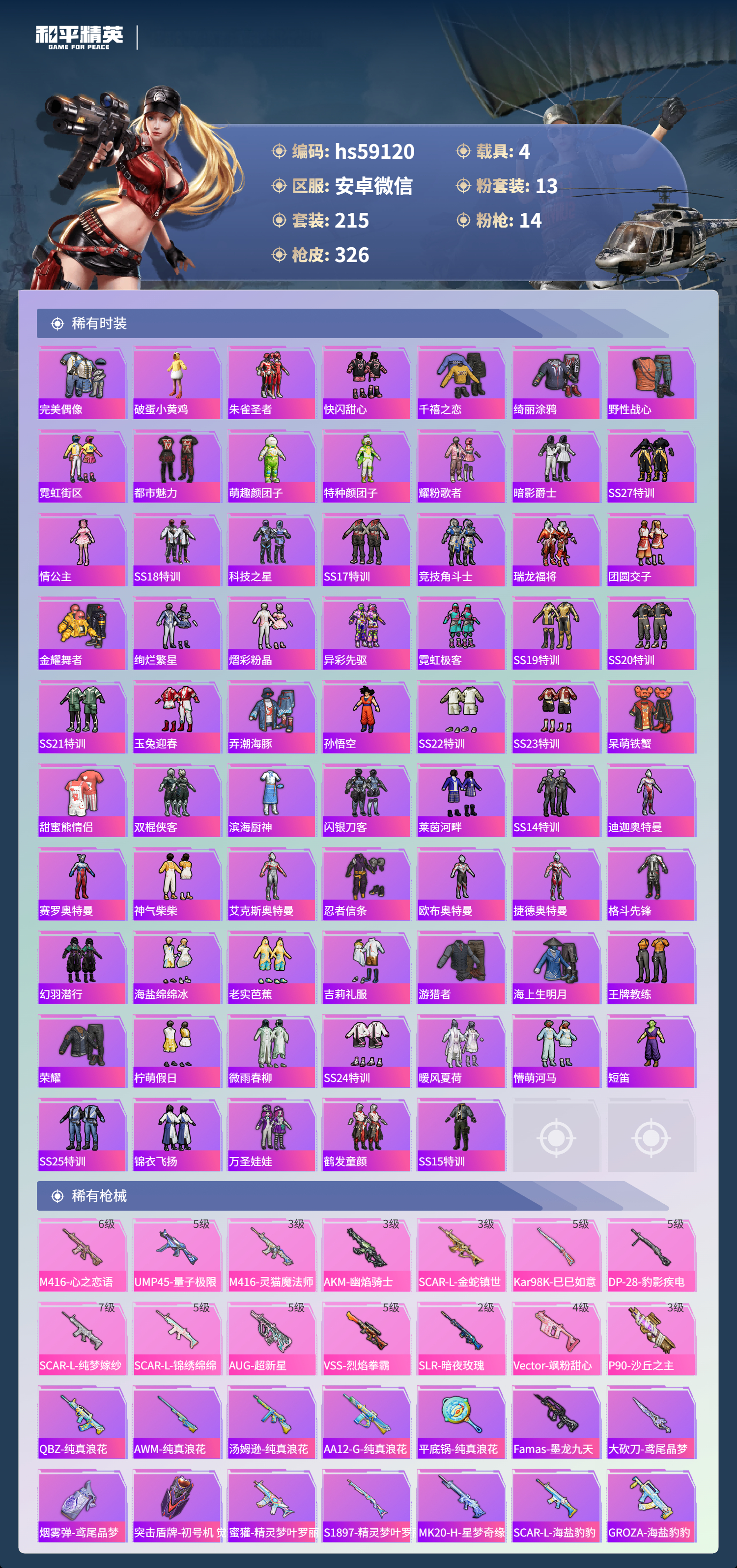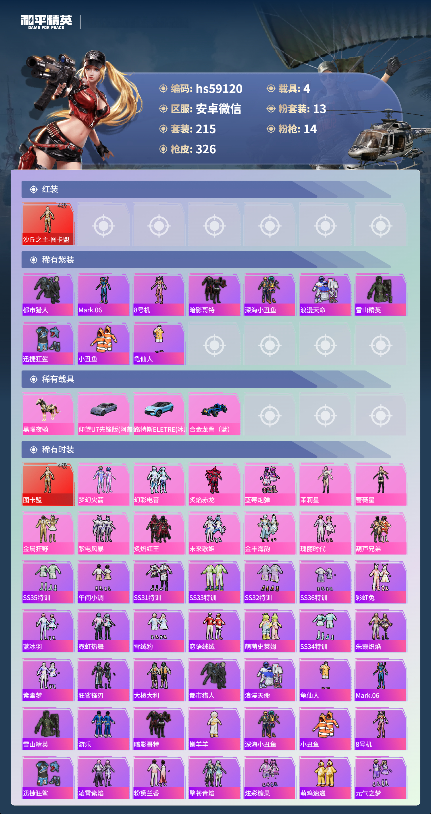 2409510安卓微信-21王牌印记-有战神框-1红装-13粉装-14特效呛-4载具-热力值-215套装-326呛皮-10卓越印记-7传奇印记 【1红装】沙丘之主-图卡盟/4级 【13粉装】角色-茉莉星套装-蓝莓炮弹套装-金属狂野套装-葫芦兄弟套装-幻彩电音套装-梦幻火箭套装-炙焰红王角色-蔷薇星套装-瑰丽时代套装-紫电风暴套装-未来歌姬套装-金丰海韵套装-炙焰赤