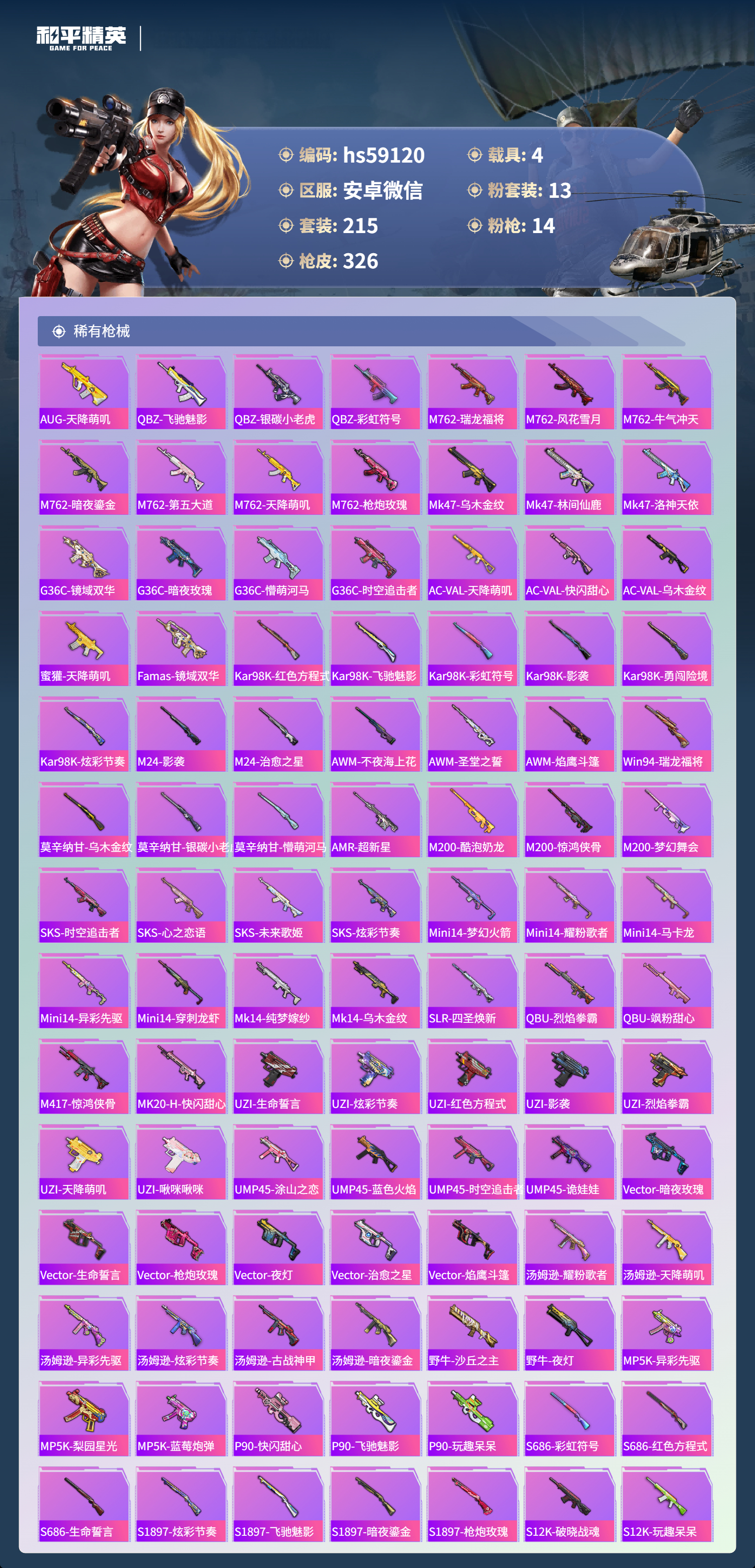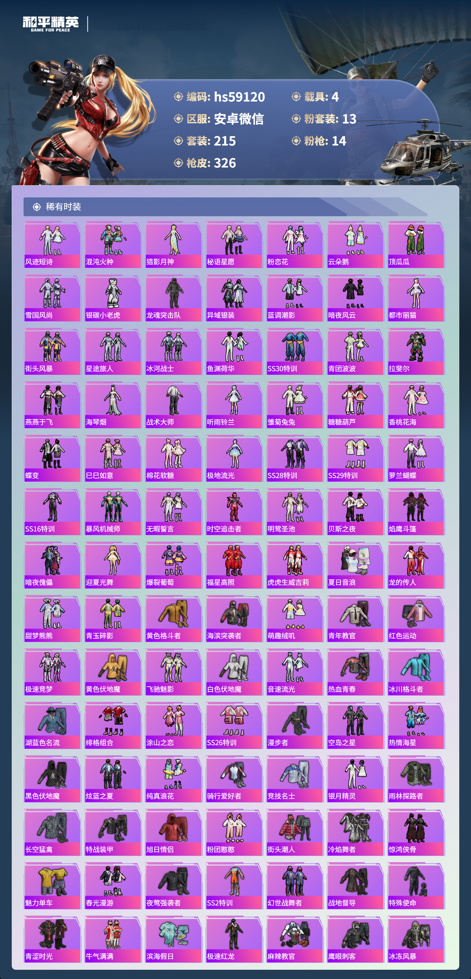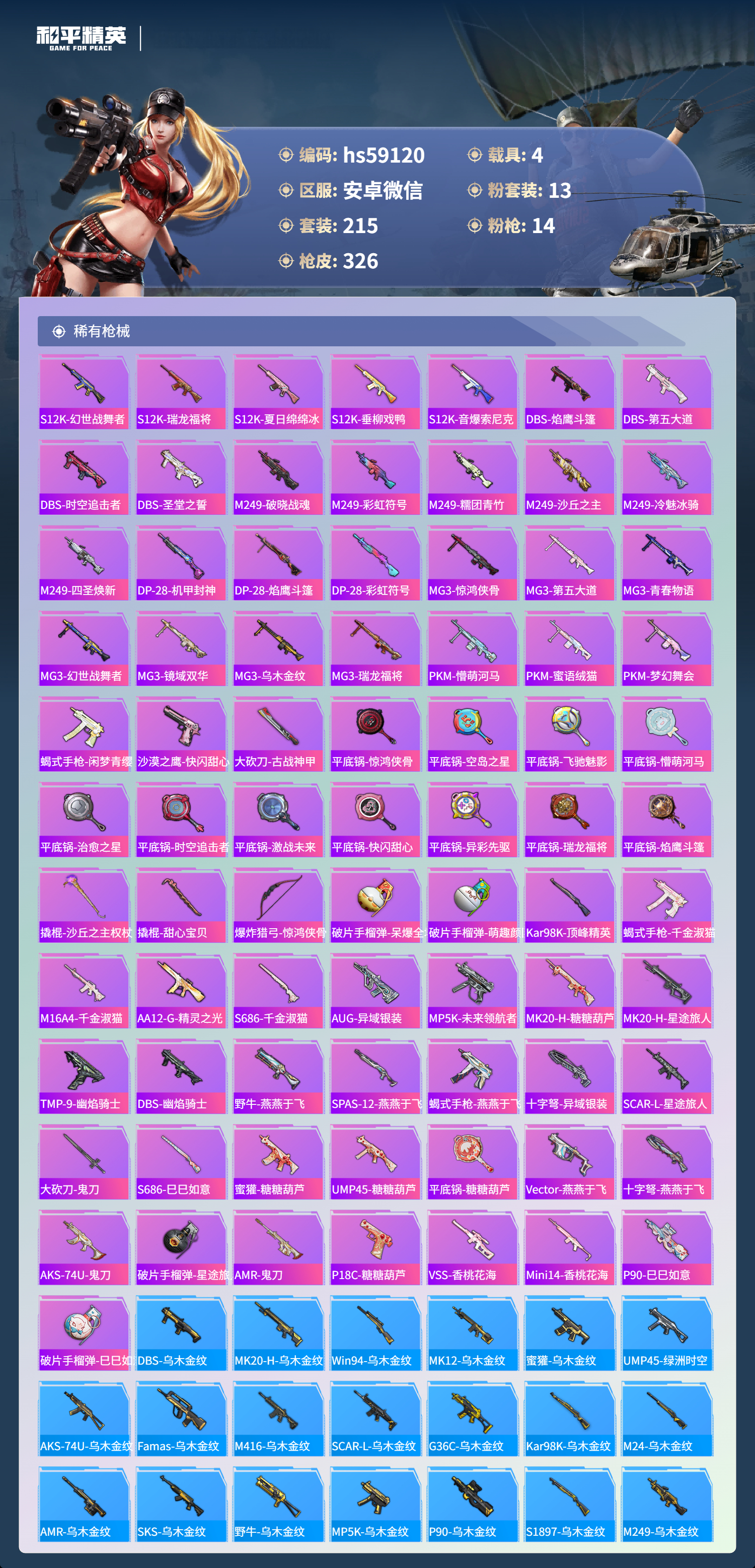 2409510安卓微信-21王牌印记-有战神框-1红装-13粉装-14特效呛-4载具-热力值-215套装-326呛皮-10卓越印记-7传奇印记 【1红装】沙丘之主-图卡盟/4级 【13粉装】角色-茉莉星套装-蓝莓炮弹套装-金属狂野套装-葫芦兄弟套装-幻彩电音套装-梦幻火箭套装-炙焰红王角色-蔷薇星套装-瑰丽时代套装-紫电风暴套装-未来歌姬套装-金丰海韵套装-炙焰赤