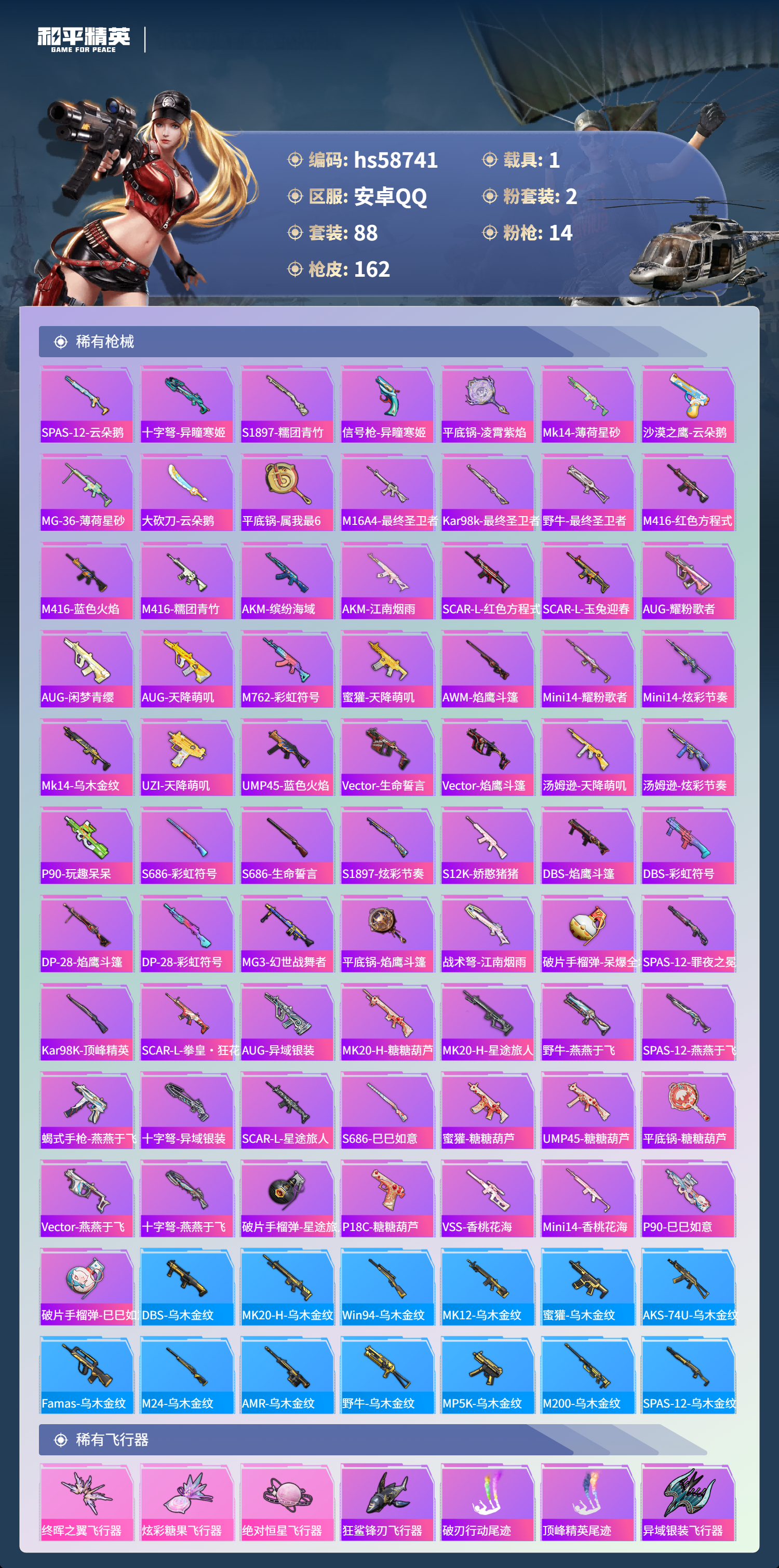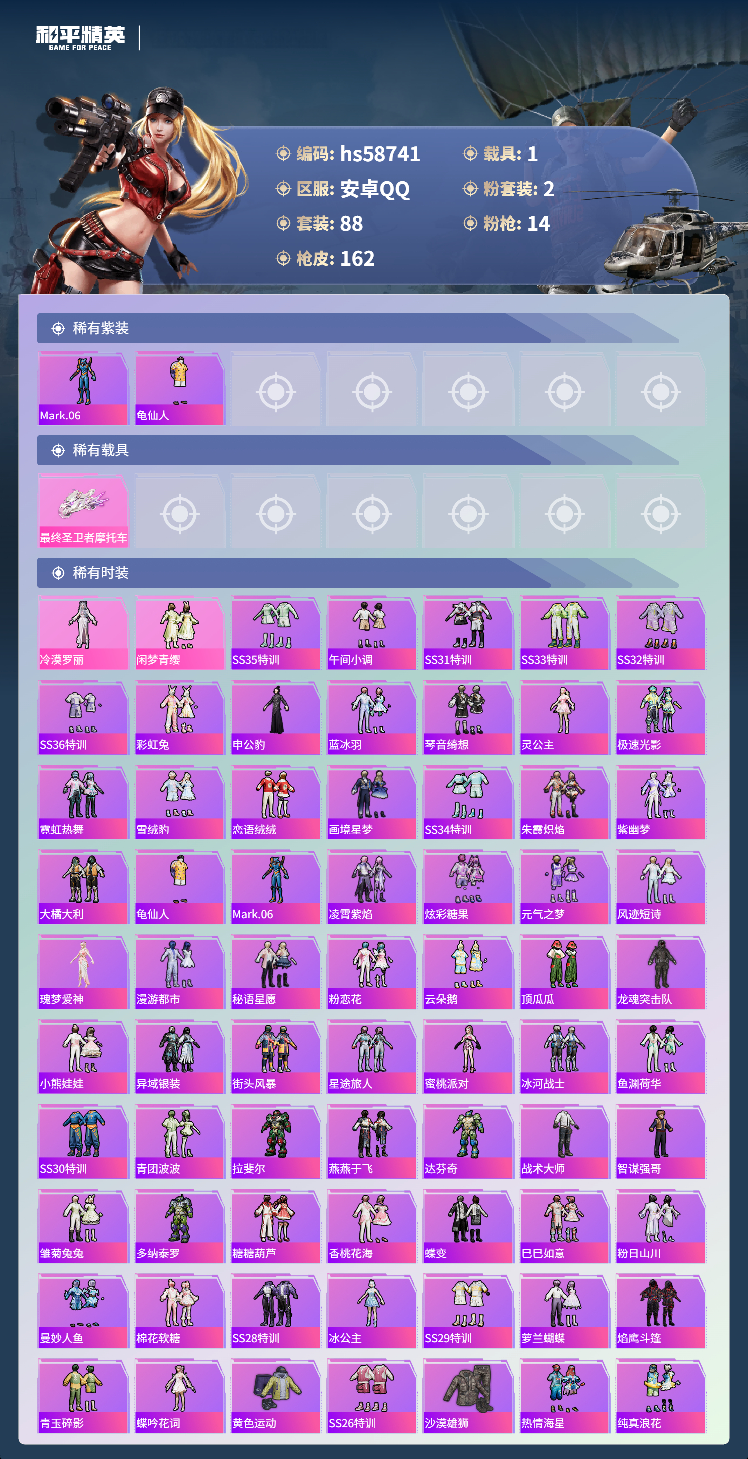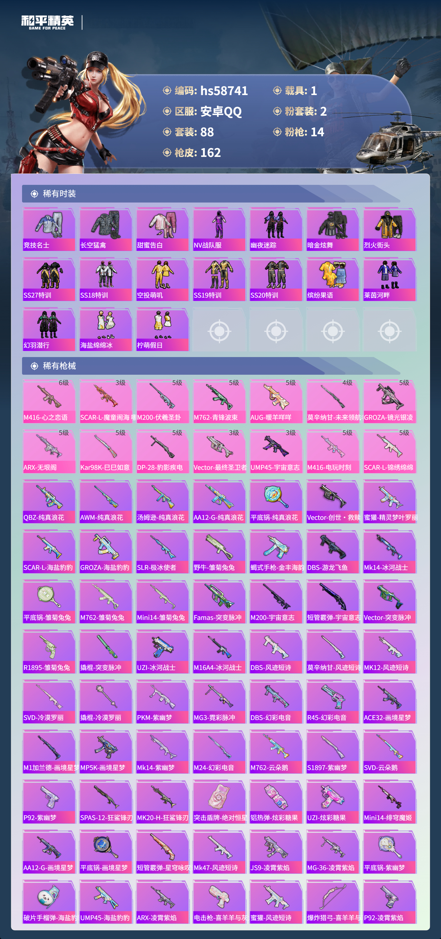 hs58741 安卓手q-8王牌印记-2粉装-14特效呛-1载具-54988热力值-88套装-162呛皮-5卓越印记-1传奇印记【2粉装】角色-冷漠罗丽套装-闲梦青缨【14特效呛】莫辛纳甘-未来领航者/4级m762-青锋波束/5级arx-无垠阁/5级groza-镜光银凌/5级dp-28-豹影疾电/5级m200-伏羲圣卦/5级m416-心之恋语/6级scar-l-锦绣绵绵/5级
