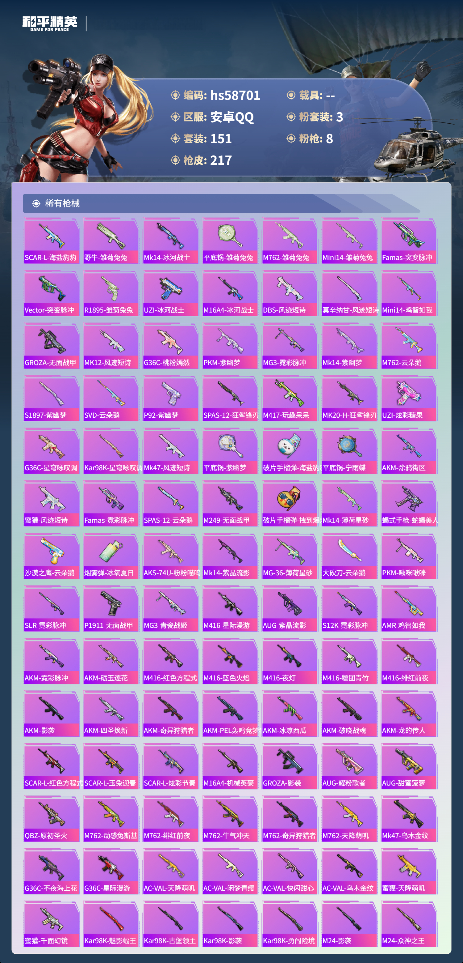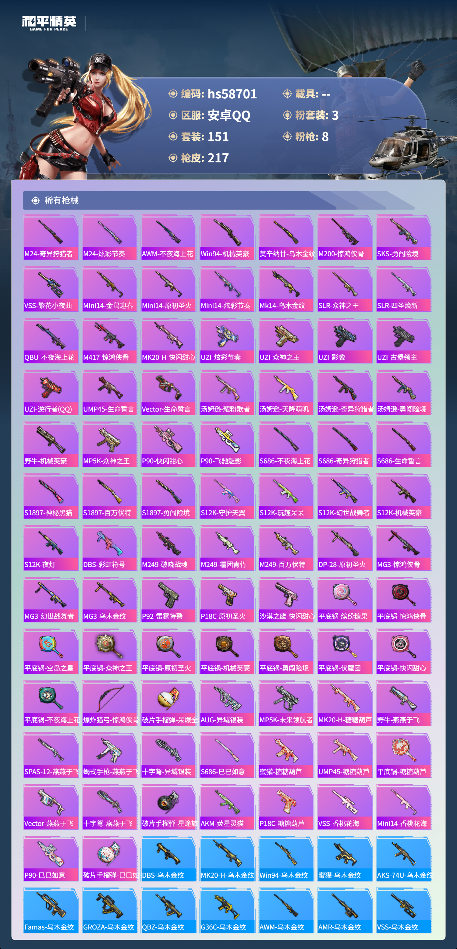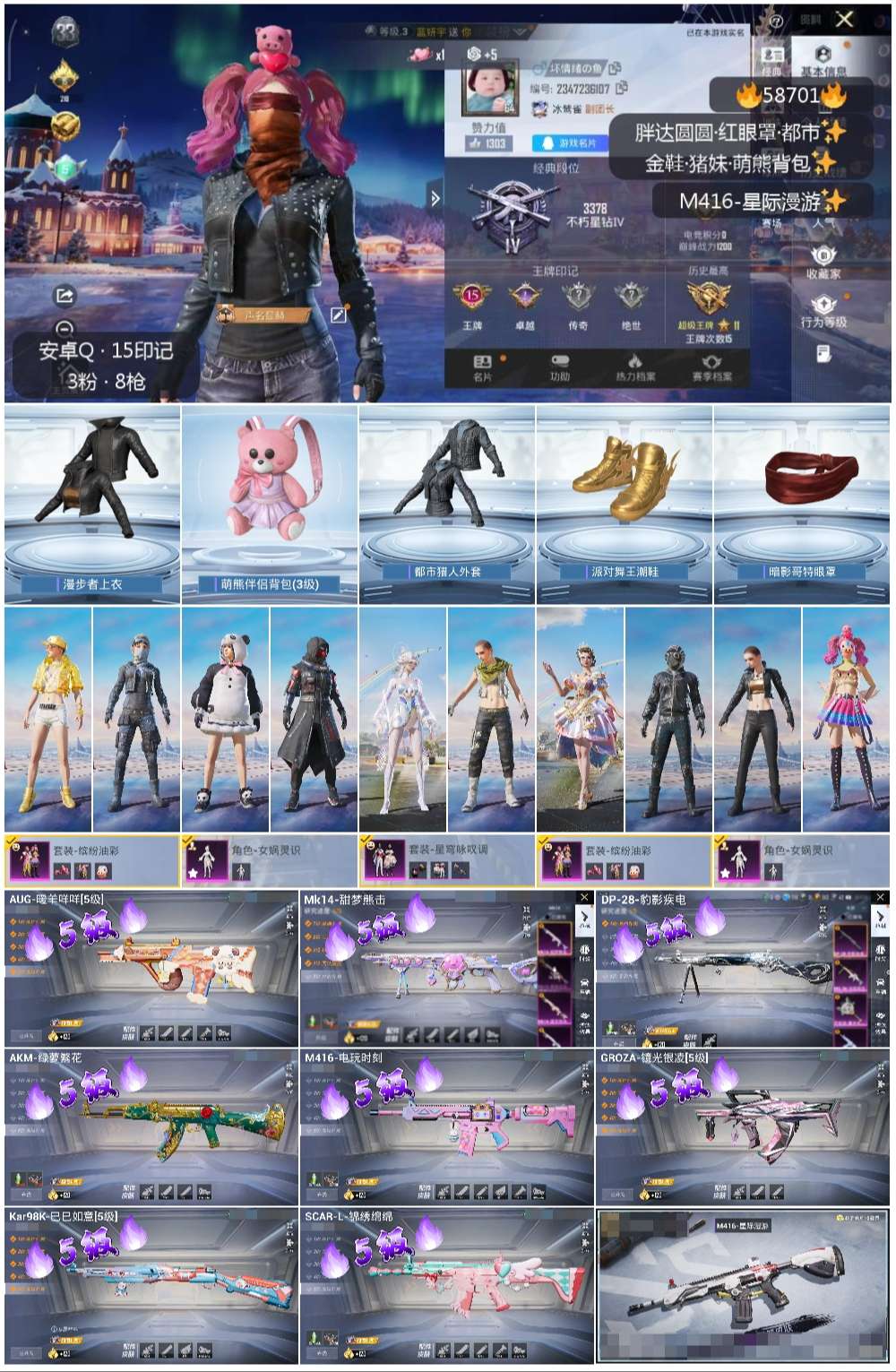 hs58701 安卓手q-15王牌印记-3粉装-8特效呛-61204热力值-151套装-217呛皮-1卓越印记【3粉装】套装-缤纷油彩套装-星穹咏叹调角色-女娲灵识【8特效呛】aug-暖羊咩咩/5级kar98k-巳巳如意/5级dp-28-豹影疾电/5级mk14-甜梦熊击/5级scar-l-锦绣绵绵/5级m416-电玩时刻/5级akm-绿萝繁花/5级groza-镜光银凌/5级