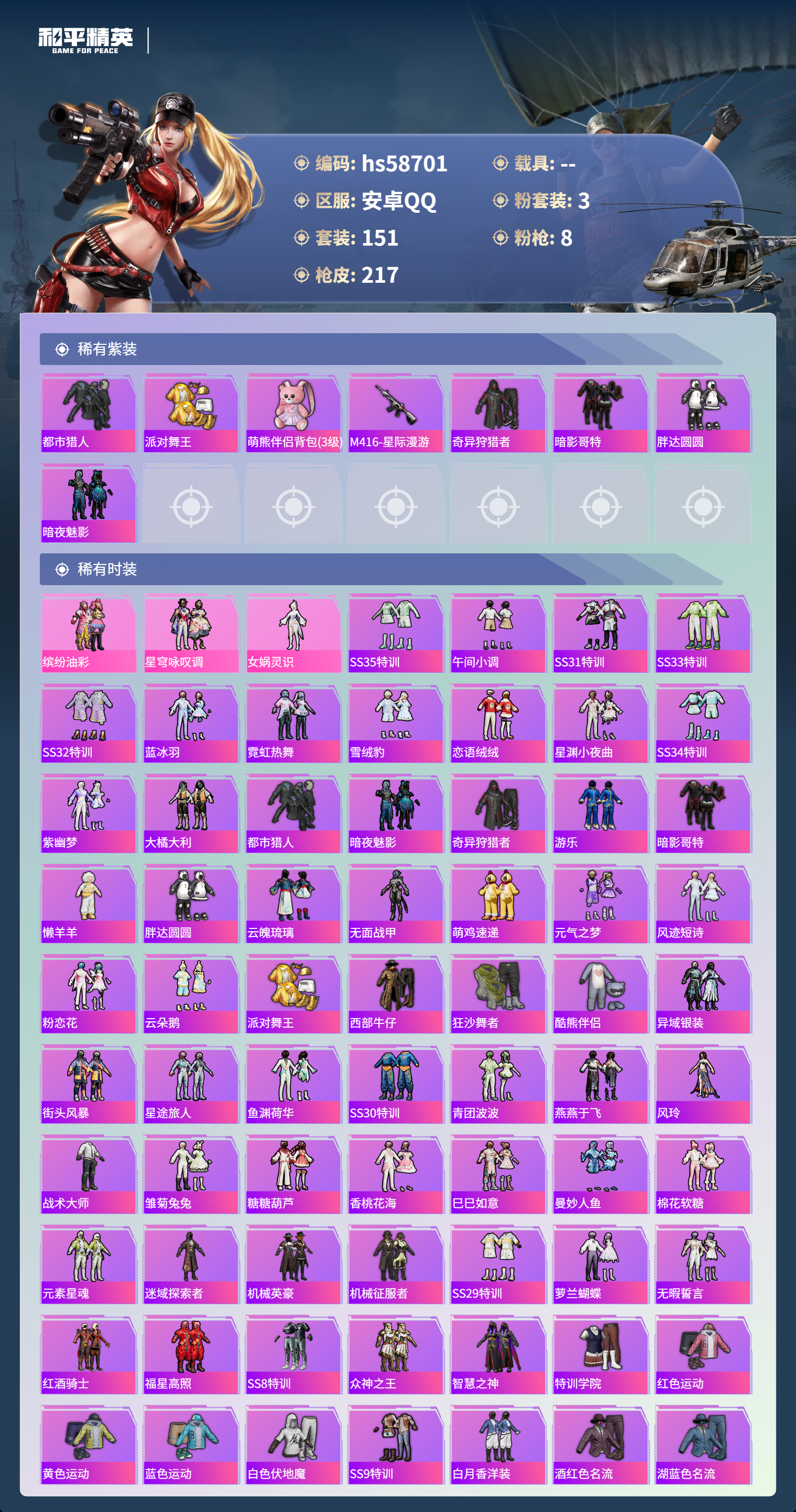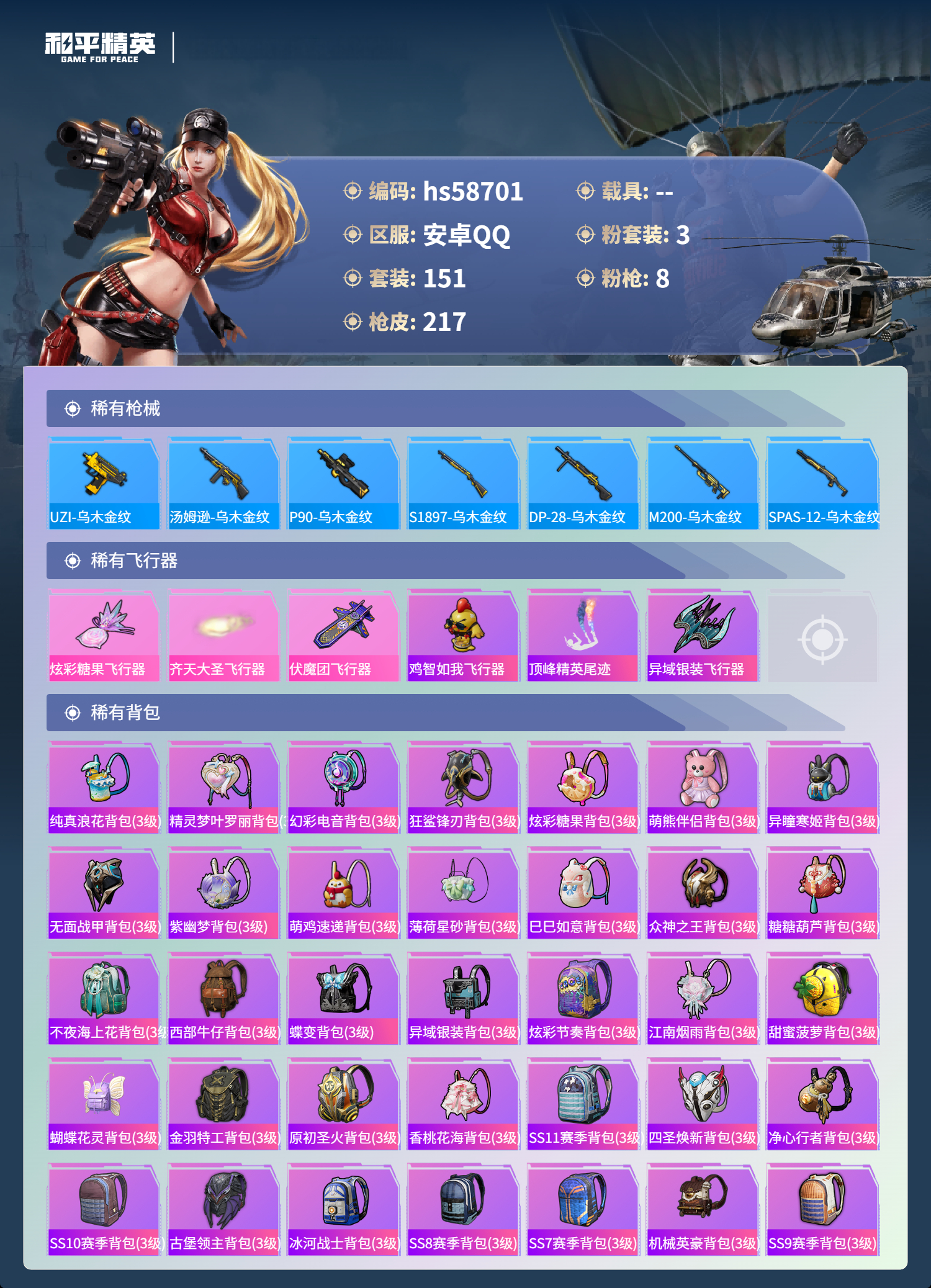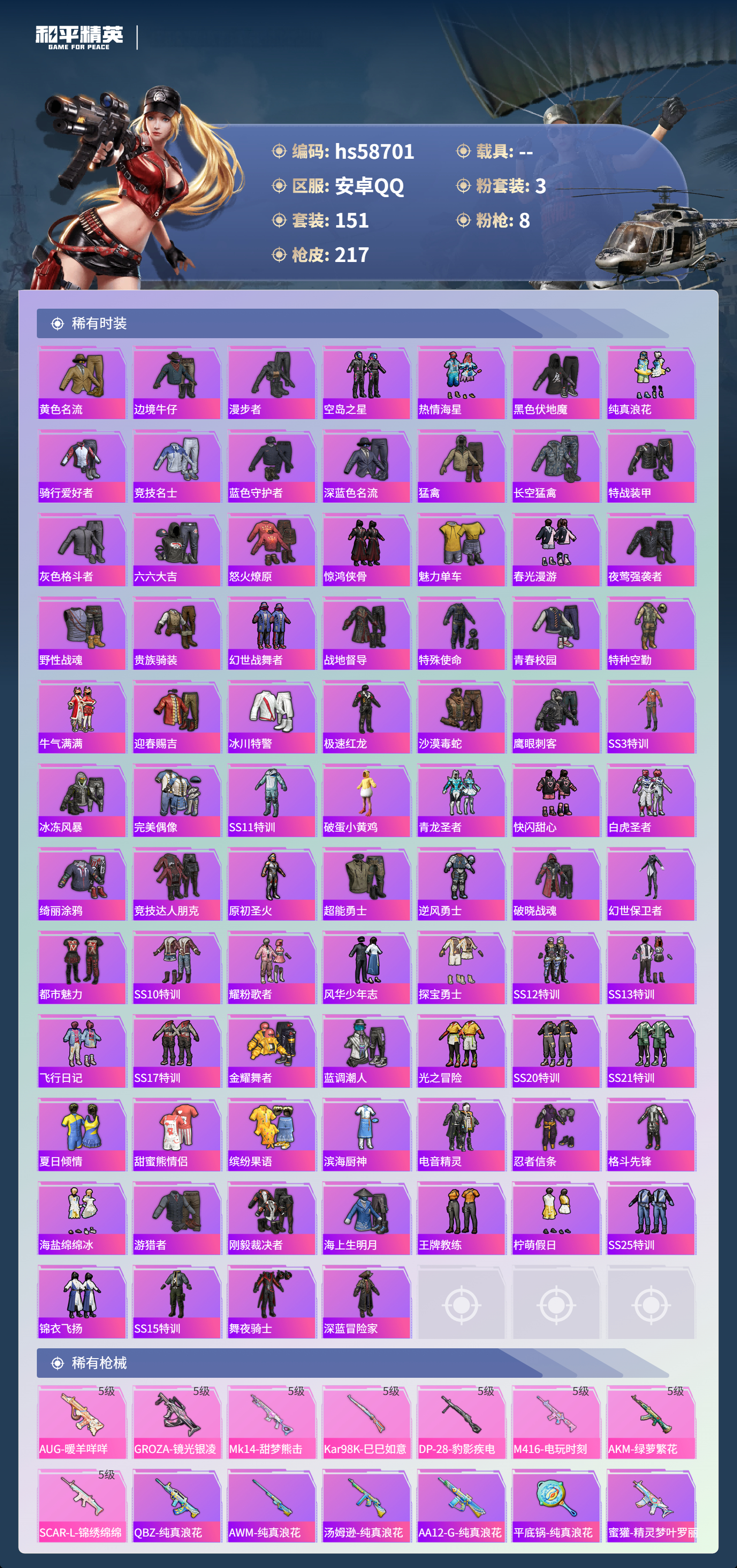 hs58701 安卓手q-15王牌印记-3粉装-8特效呛-61204热力值-151套装-217呛皮-1卓越印记【3粉装】套装-缤纷油彩套装-星穹咏叹调角色-女娲灵识【8特效呛】aug-暖羊咩咩/5级kar98k-巳巳如意/5级dp-28-豹影疾电/5级mk14-甜梦熊击/5级scar-l-锦绣绵绵/5级m416-电玩时刻/5级akm-绿萝繁花/5级groza-镜光银凌/5级