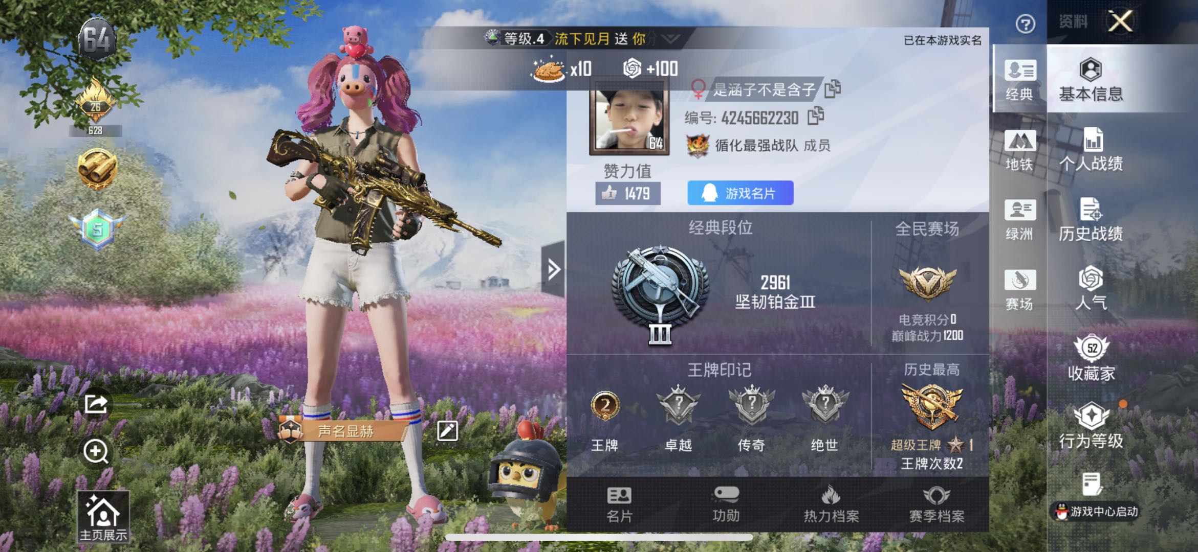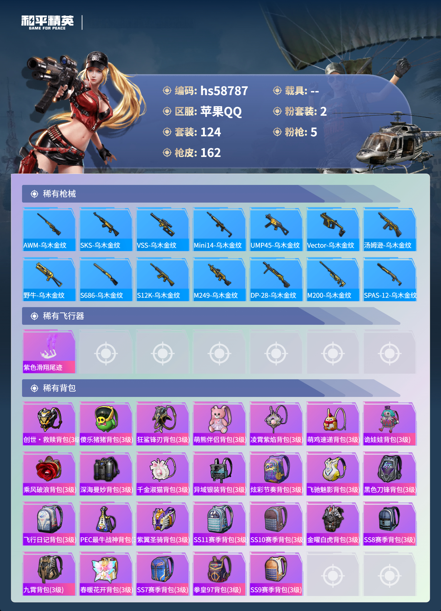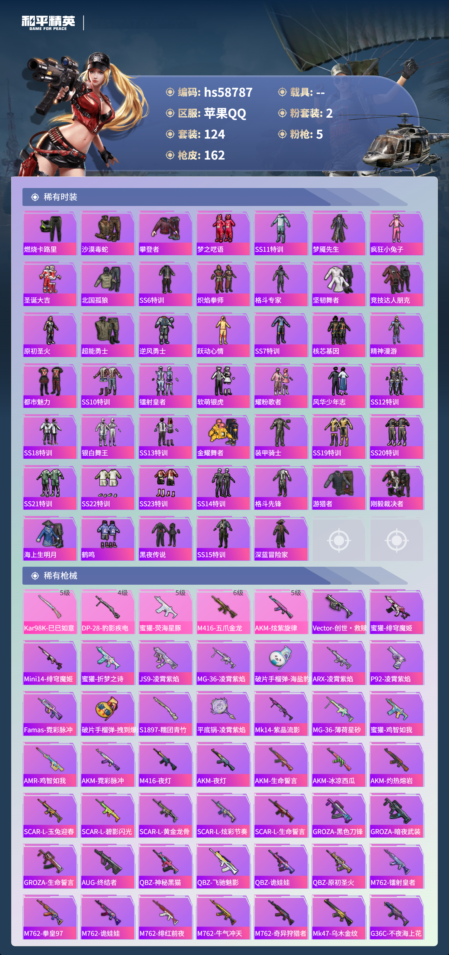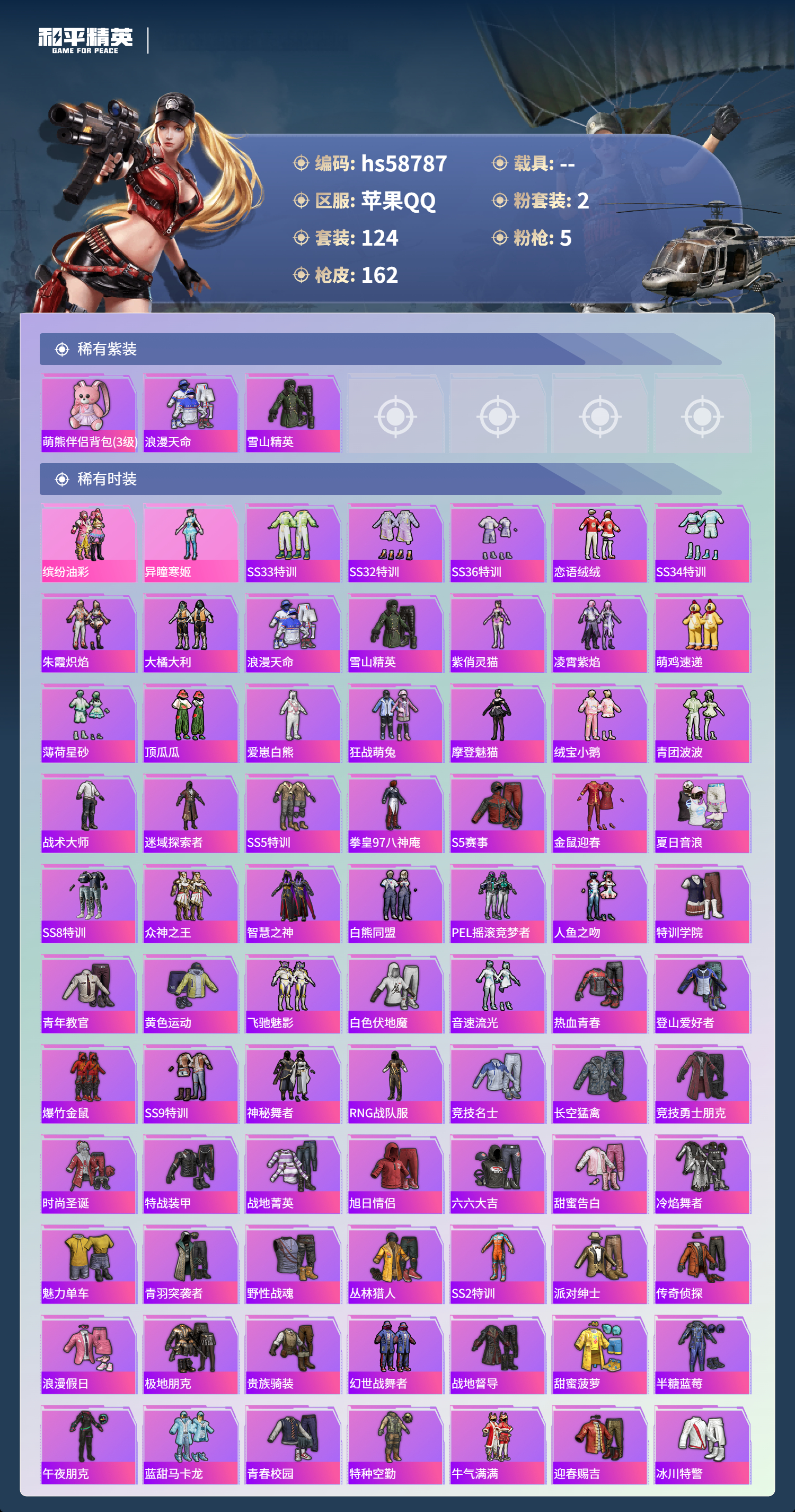 2409552苹果手q-2王牌印记-2粉装-5特效呛-48605热力值-124套装-162呛皮 【2粉装】套装-缤纷油彩角色-异瞳寒姬 【5特效呛】m416-五爪金龙/6级kar98k-巳巳如意/5级dp-28-豹影疾电/4级akm-炫紫旋律/5级蜜獾-荧海星豚/5级 【3稀有紫装】萌熊伴侣背包3级浪漫天命雪山精英 【124稀有时装】缤纷油彩异瞳寒姬ss33特训s