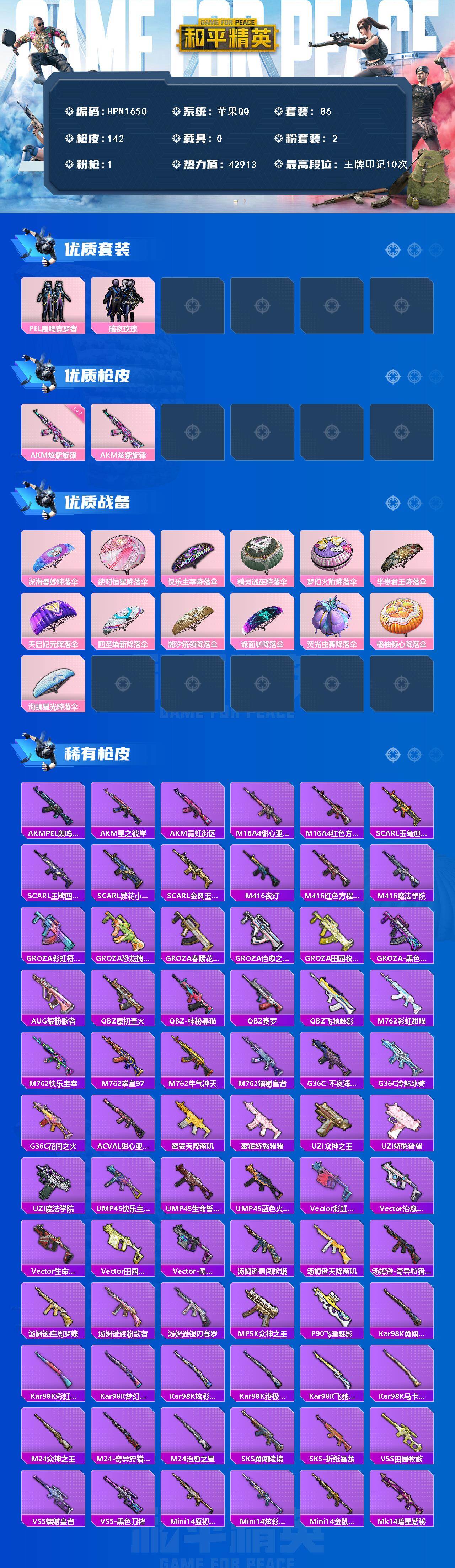 【n1650】86套装/呛械1/装备161/战备102/王牌印记10/热力值42913/七级akm-炫紫旋律/pel轰鸣竞梦者/暗夜玫瑰/akm-炫紫旋律/深海曼妙降落伞/绝对恒星降落伞/快乐主宰降落伞/精灵迷巫降落伞/梦幻火箭降落伞/华贵君王降落伞/天启纪元降落伞/四圣焕新降落伞/潮汐统领降落伞/诡面斩降落伞/荧光虫舞降落伞/橘柚倾心降落伞/海螺星光降落伞/炫彩糖果降落伞/套装-雪国风尚