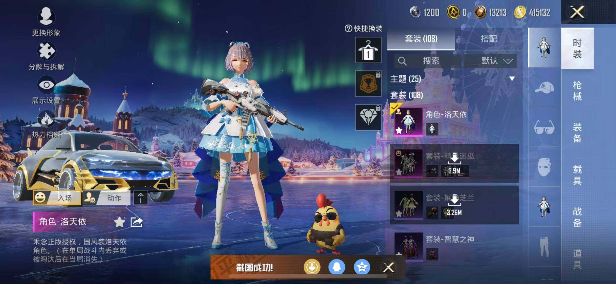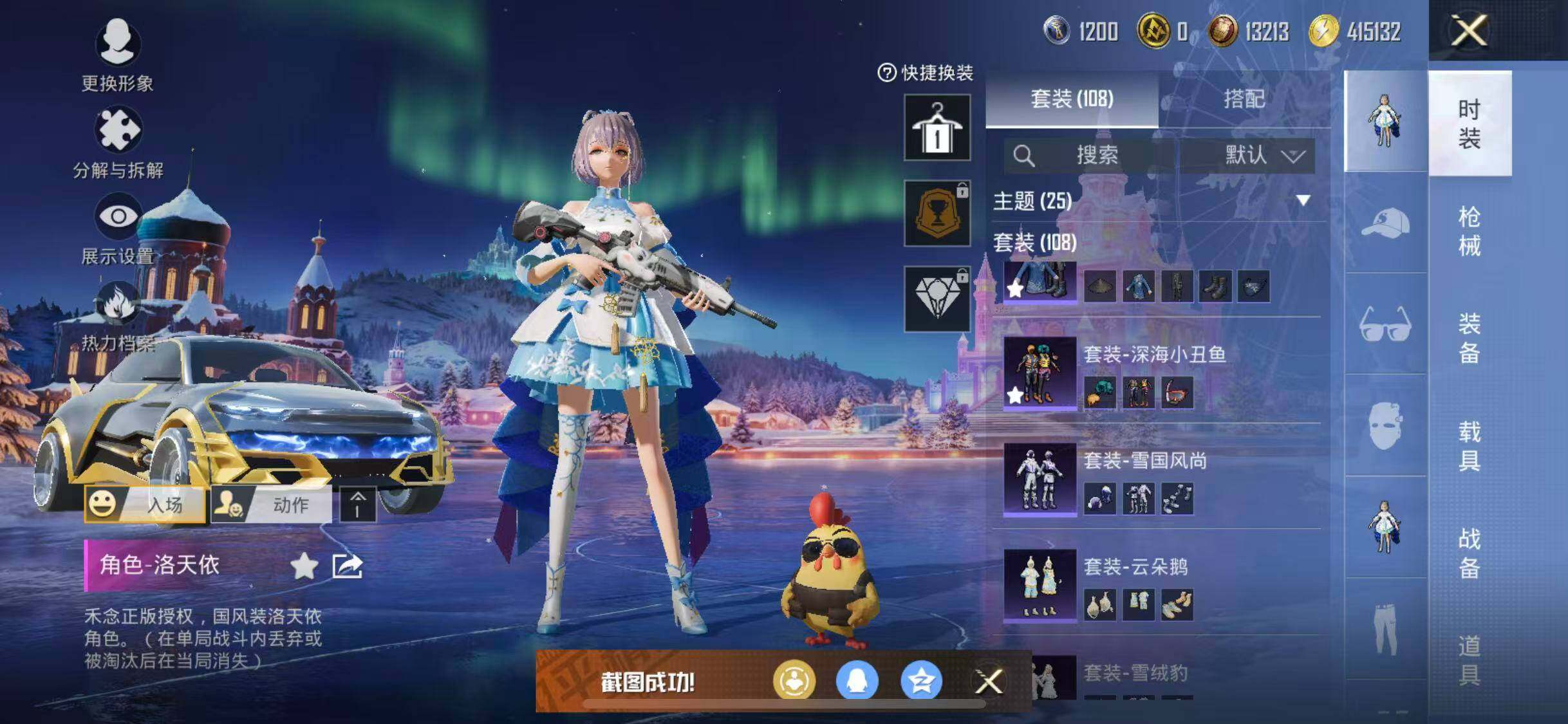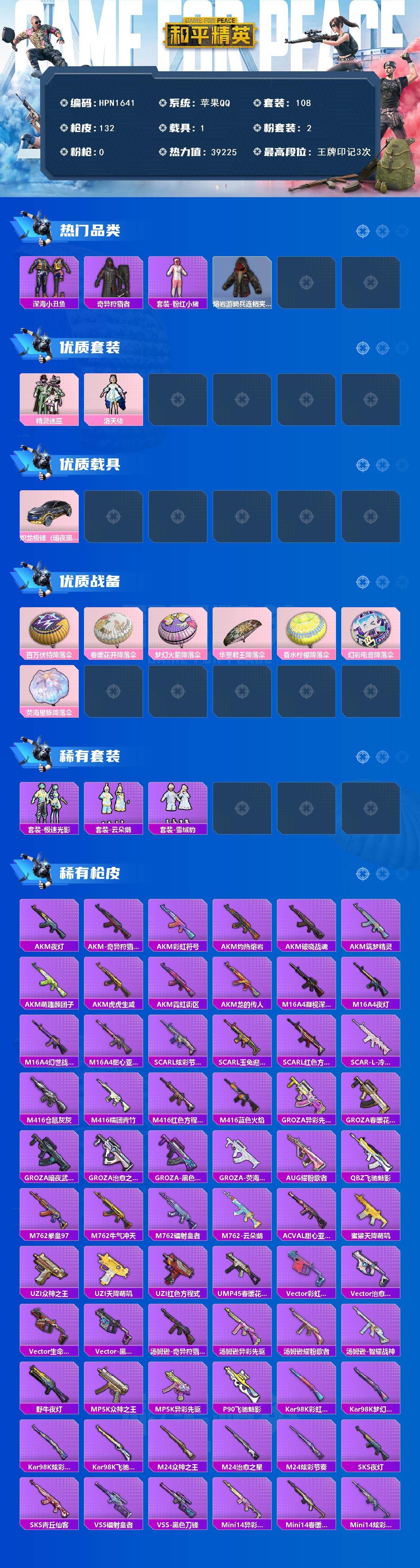 【n1641】108套装/装备158/载具1/战备102/王牌印记3/热力值39225/深海小丑鱼/奇异狩猎者/粉红小猪/熔岩游骑兵连帽夹克/精灵迷巫/洛天依/炽龙极锋暗夜黑/百万伏特降落伞/春暖花开降落伞/梦幻火箭降落伞/华贵君王降落伞/香水柠檬降落伞/幻彩电音降落伞/荧海星豚降落伞/套装-雪国风尚/套装-极速光影/套装-云朵鹅/套装-雪绒豹/akm-夜灯/akm-奇异狩猎者/akm