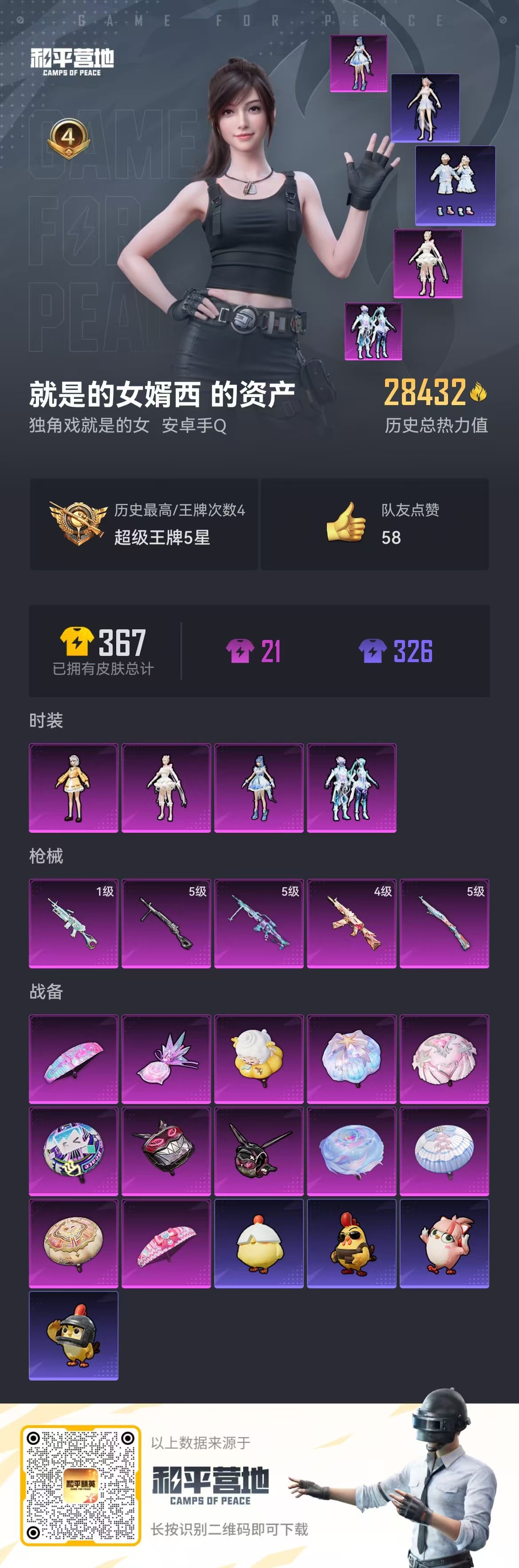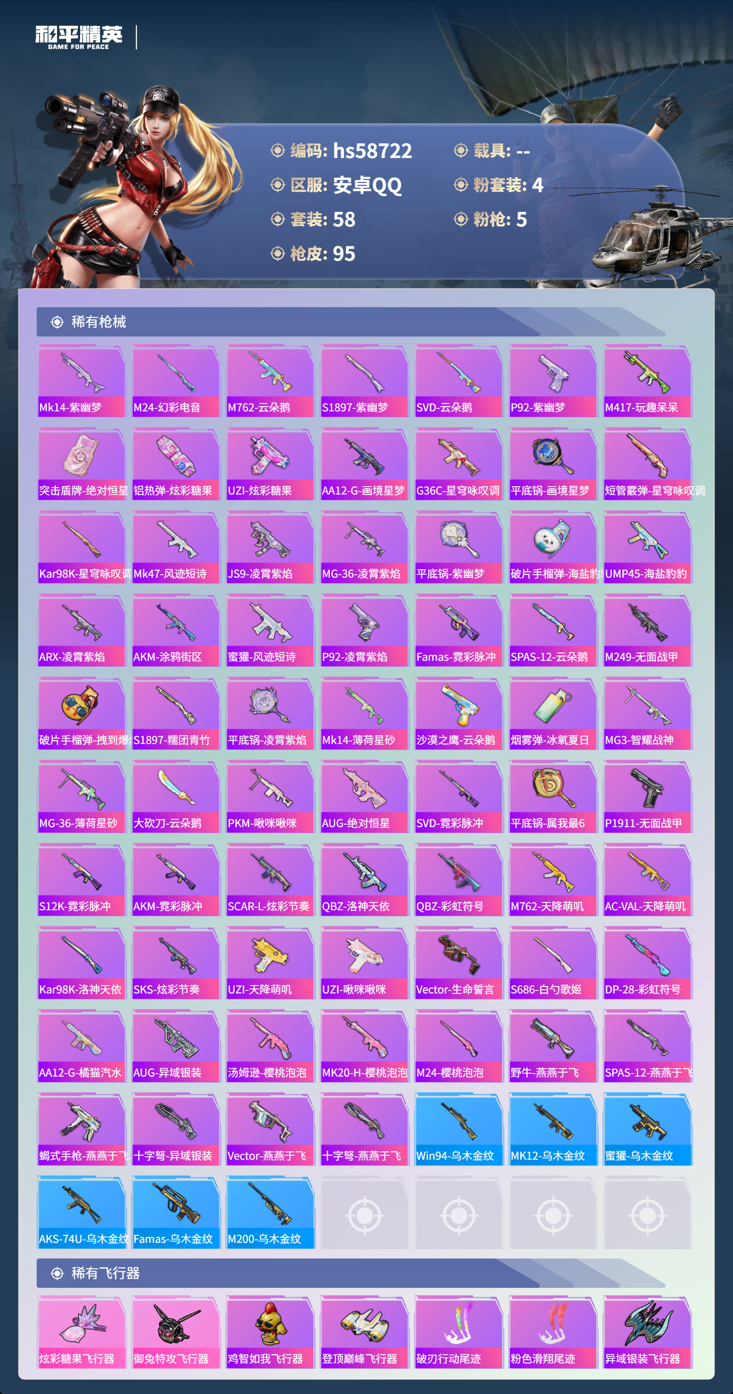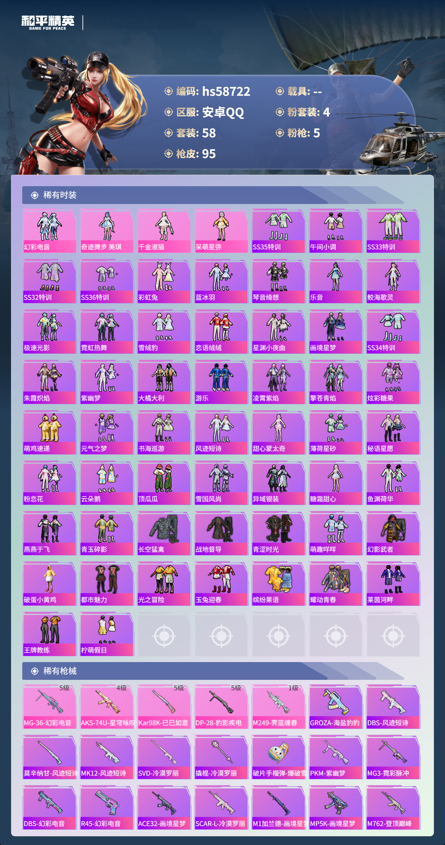 0载具-58套装-95呛皮-hs58722 安卓手q-4王牌印记-4粉装-5特效呛-28612热力值-58套装-95呛皮【4粉装】角色-奇迹舞步 美琪角色-千金淑猫套装-幻彩电音角色-呆萌星弥【5特效呛】dp-28-豹影疾电/5级kar98k-巳巳如意/5级m249-霁蓝缠春/1级aks-74u-星穹咏叹调/4级mg-36-幻彩电音/5级【58稀有时装】幻彩电音奇迹舞步 美琪ss35特训午间小调s