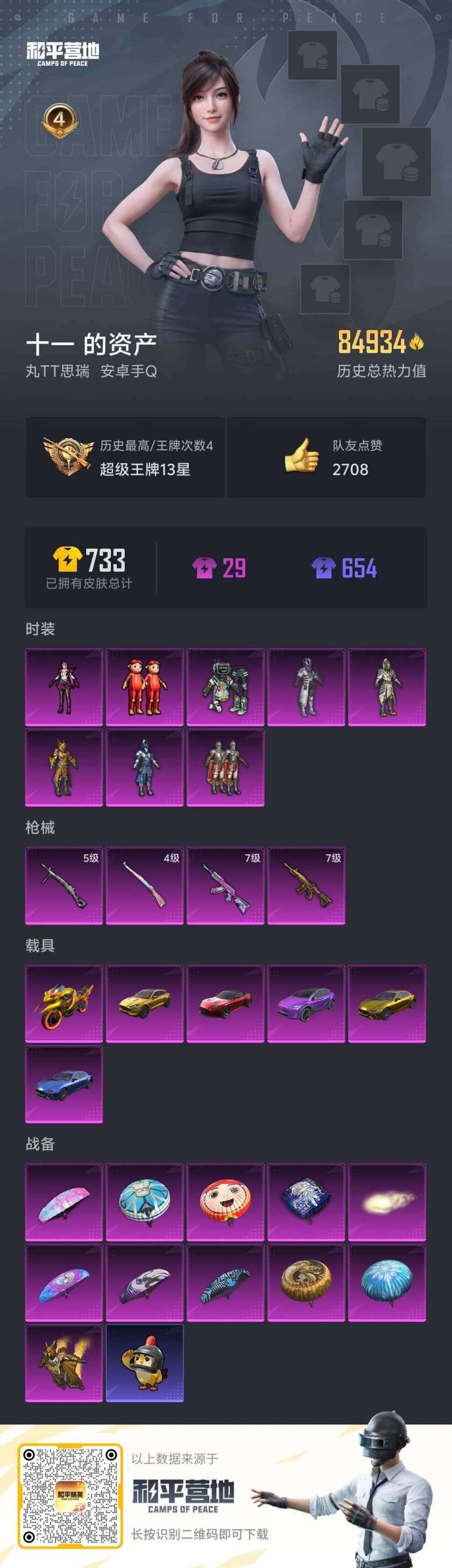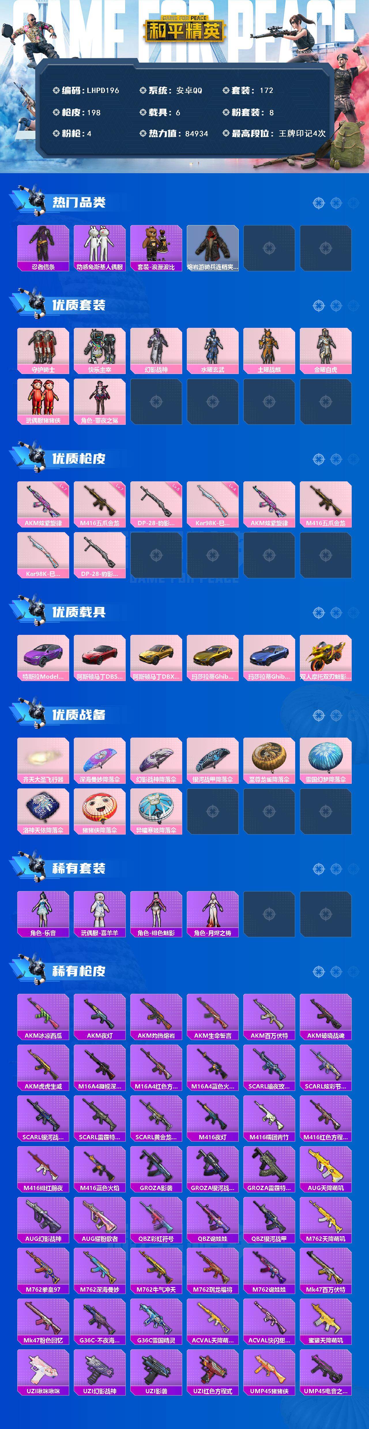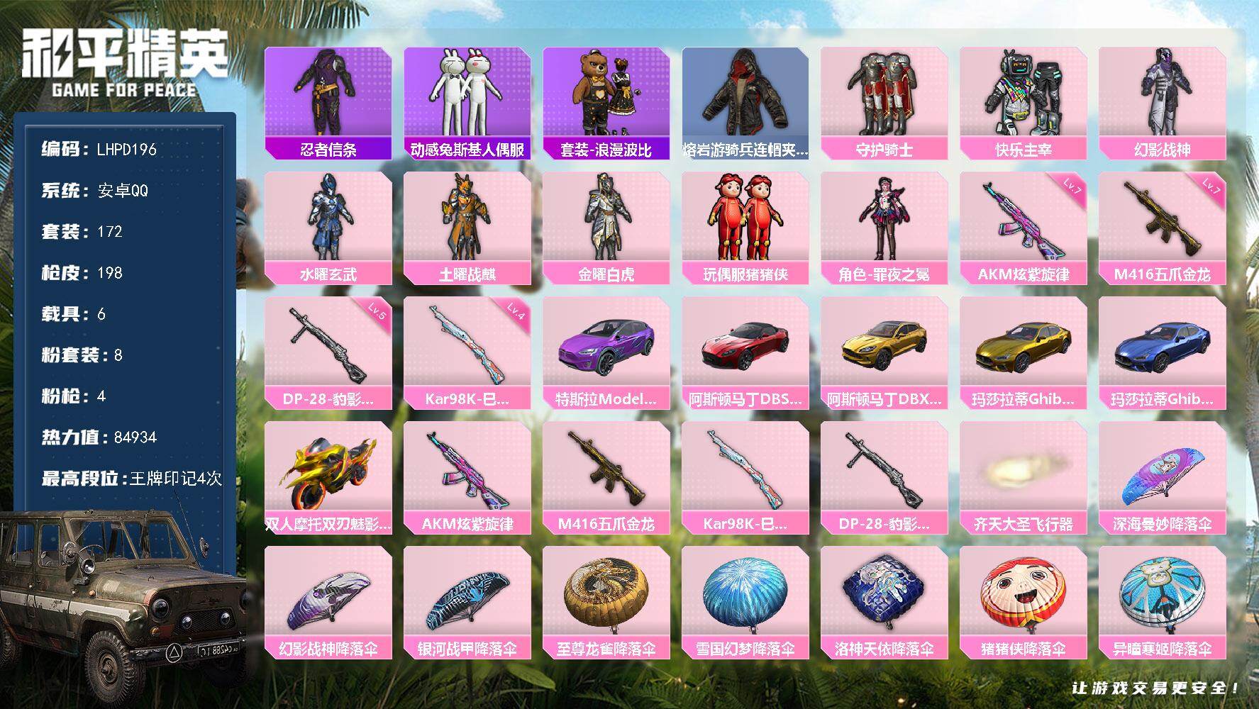 [16011998]【特价出售/店主推荐】安卓 手q-8粉装-4特效呛-6载具-2粉色飞行器-84934热力值-4王牌印记-172套装-198呛皮【热门品类】:套装-忍者信条,套装-动感兔斯基人偶服,套装-浪漫波比,熔岩游骑兵连帽夹克【粉色套装】:粉装-守护骑士,粉装-快乐主宰,粉装-幻影战神,粉装-水曜玄武,粉装-土曜战麒,粉装-金曜白虎,玩偶服-猪猪侠,角色-罪夜之冕【粉色呛皮等级】:akm-炫紫旋律七级,m416-五爪金龙七级,kar98k-巳巳如意四级,dp-28-豹影疾电五级【粉色载具】:特斯拉model x(奇幻紫),阿斯顿马丁dbs(红),阿斯顿马丁dbx(金),玛莎拉蒂ghibli(金),玛莎拉蒂ghibli(蓝),双人摩托-双刃魅影(金)【粉色呛皮】:akm-炫紫旋律,m416-五爪金龙,kar98k-巳巳如意,dp-28-豹影疾电【粉色飞行器】:齐天大圣飞行器