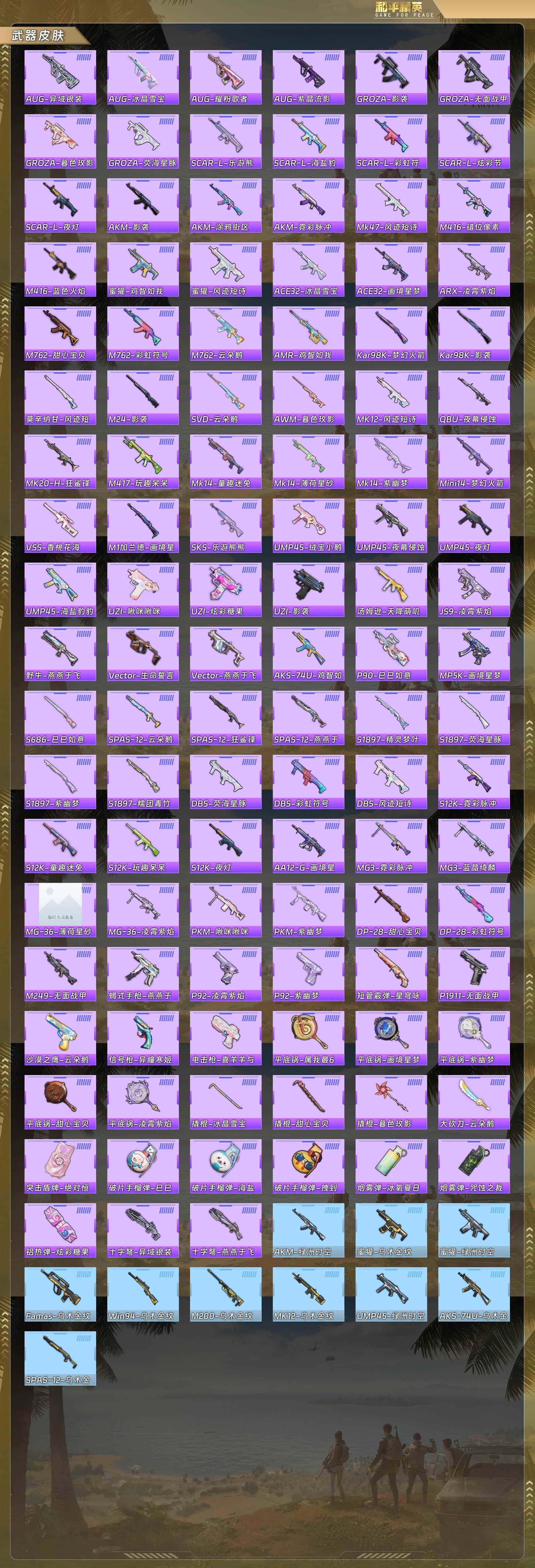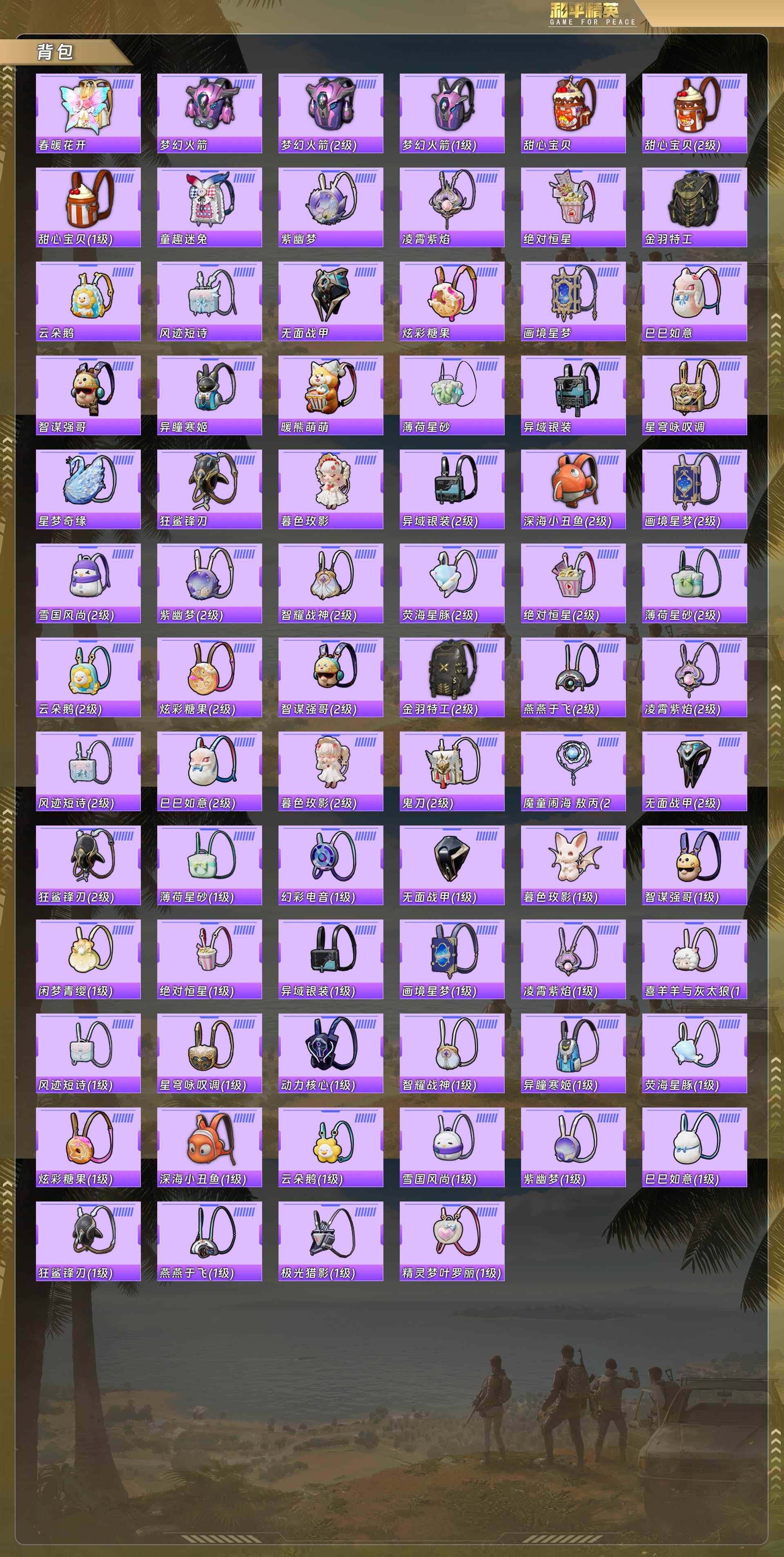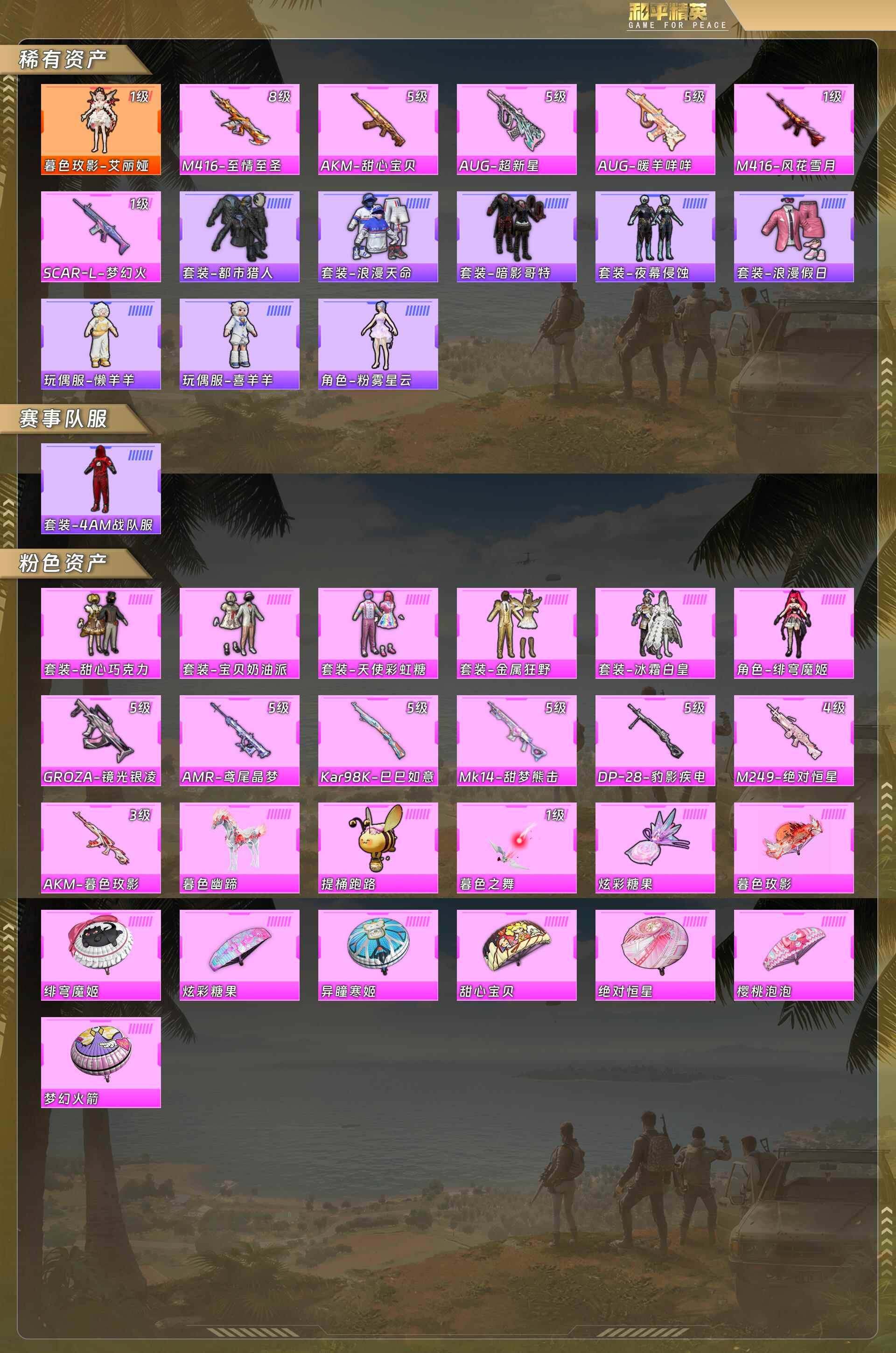 身法号-暮色玫影-艾丽娅[1级]/都市猎人/浪漫天命/暗影哥特/粉雾星云/4am战队服/甜心巧克力/宝贝奶油派/天使彩虹糖/金属狂野/冰霜白皇/绯穹魔姬/m416-至情至圣[8级]/akm-甜心宝贝[5级]/aug-超新星[5级]/m416-风花雪月[1级]/scar-l-梦幻火箭[1级]/amr-鸢尾晶梦[5级]akm-暮色玫影[3级]/暮色幽蹄/没战神框 hp5293 【红色神装等级】:暮色玫影-艾丽娅一级 【红色角色神装】:暮色玫影-艾丽娅 【热门品类】:套装-浪漫天命,套装-都市猎人,套装-小丑鱼,套装-暗影哥特 【粉色套装】:粉装-甜心巧克力,粉装-宝贝奶油派,粉装-天使彩虹糖,粉装-金属狂野,粉装-冰霜白皇,角色-绯穹魔姬 【粉色呛皮等级】:akm-甜心宝贝五级,akm-暮色玫影三级,scar-l-梦幻火箭一级,m416-风花雪月一级,m416-至情至圣八级,groza-镜光银凌五级,aug-超新星五级,aug-暖羊咩咩五级,kar98k-巳巳如意五级,mk14-甜梦熊击五级,amr-鸢尾晶梦五级,m249-绝对恒星四级,dp-28-豹影疾电五级 【粉色载具】:暮色幽蹄 【粉色呛皮】:akm-甜心宝贝,akm-暮色玫影,scar-l-梦幻火箭,m416-风花雪月,m416-至情至圣,groza-镜光银凌,aug-超新星,aug-暖羊咩咩,kar98k-巳巳如意,mk14-甜梦熊击,amr-鸢尾晶梦,m249-绝对恒星,dp-28-豹影疾电 【粉色飞行器】:暮色之舞飞行器 【粉色降落伞】:绝对恒星降落伞,甜心宝贝降落伞,梦幻火箭降落伞,樱桃泡泡降落伞,绯穹魔姬降落伞,异瞳寒姬降落伞,炫彩糖果降落伞,暮色玫影降落伞 【稀有套装】:套装-巳巳如意,套装-乐游熊熊,套装-雪国风尚,套装-燕燕于飞,套装-鱼渊荷华,角色-蜜桃派对,套装-粉恋花,套装-紫幽梦,套装-蓝冰羽,套装-星影赞美诗,套装-彩虹兔,套装-云朵鹅,套装-雪绒豹,套装-蜜露汐语,角色-夜瞳黯灵,套装-朱霞炽焰,套装-凌霄紫焰,套装-擎苍青焰,玩偶服-懒羊羊,玩偶服-喜羊羊,角色-绯色魅影,套装-书海巡游,套装-画境星梦,套装-琴音绮想,套装-炫彩糖果 【稀有呛皮】:aug-冰晶雪宝,akm-影袭,scar-l-夜灯,scar-l-炫彩节奏,m416-蓝色火焰,groza-影袭,groza-荧海星豚,groza-暮色玫影,aug-耀粉歌者,m762-彩虹符号,m762-甜心宝贝,m762-云朵鹅,ace32-画境星梦,arx-凌霄紫焰,uzi-啾咪啾咪,uzi-影袭,ump45-夜灯,ump45-绒宝小鹅,vect-生命誓言,汤姆逊-天降萌叽,mp5k-画境星梦,js9-凌霄紫焰,p90-巳巳如意,kar98k-影袭,kar98k-梦幻火箭,m24-影袭,awm-暮色玫影,mini14-梦幻火箭,mk14-童趣迷兔,svd-云朵鹅,m1加兰德-画境星梦,s686-巳巳如意,s1897-荧海星豚,s12k-玩趣呆呆,s12k-童趣迷兔,s12k-夜灯,dbs-彩虹符号,dbs-荧海星豚,aa12-g-画境星梦,spas-12-云朵鹅,dp-28-彩虹符号,dp-28-甜心宝贝,mg3-蓝晶绮麟,mg-36-凌霄紫焰,p92-凌霄紫焰,短管霰弹-星穹咏叹调,沙墨之鹦-云朵鹅,突击盾牌-绝对恒星,大砍刀-云朵鹅,撬棍-暮色玫影,平底锅-凌霄紫焰,平底锅-画境星梦,破片手留单-巳巳如意 【其他套装】:套装-4am战队服,套装-光之冒险,套装-夏日倾情,套装-幻世战舞者,套装-旭日情侣,套装-暗影哥特,套装-森林游猎者,套装-浪漫假日,套装-浪漫天命,套装-海岛探路者,套装-疯狂小兔子,套装-竞技名士,套装-绯格组合,套装-缤纷果语,套装-超能勇士,套装-长空猛禽,套装-青涩时光,套装-黄色运动,套装-黑色伏地魔,套装-鹰眼刺客,套装-冰冻风暴,套装-漫步者,套装-豚鼠丹丹,角色-粉雾星云 【稀有头盔】:梦幻火箭头盔3级,梦幻火箭头盔2级,梦幻火箭头盔1级,甜心宝贝头盔3级,甜心宝贝头盔2级,甜心宝贝头盔1级,深海小丑鱼头盔2级,深海小丑鱼头盔1级,金羽特工头盔3级,金羽特工头盔1级 【稀有背包】:梦幻火箭背包3级,梦幻火箭背包2级,梦幻火箭背包1级,甜心宝贝背包3级,甜心宝贝背包2级,甜心宝贝背包1级,深海小丑鱼背包2级,深海小丑鱼背包1级,金羽特工背包3级,金羽特工背包2级 【营地id】:980233853