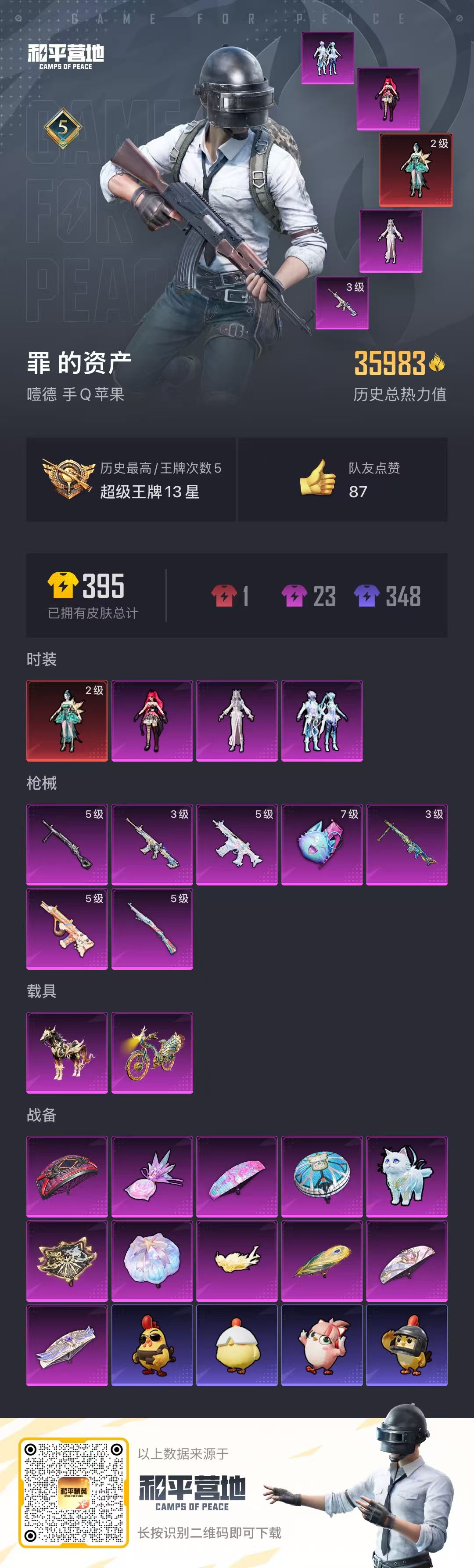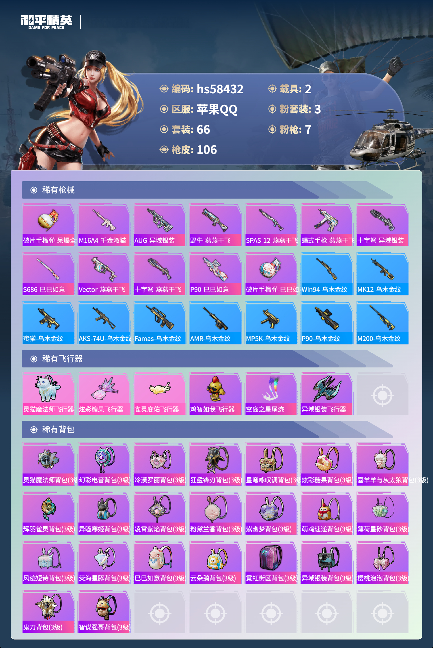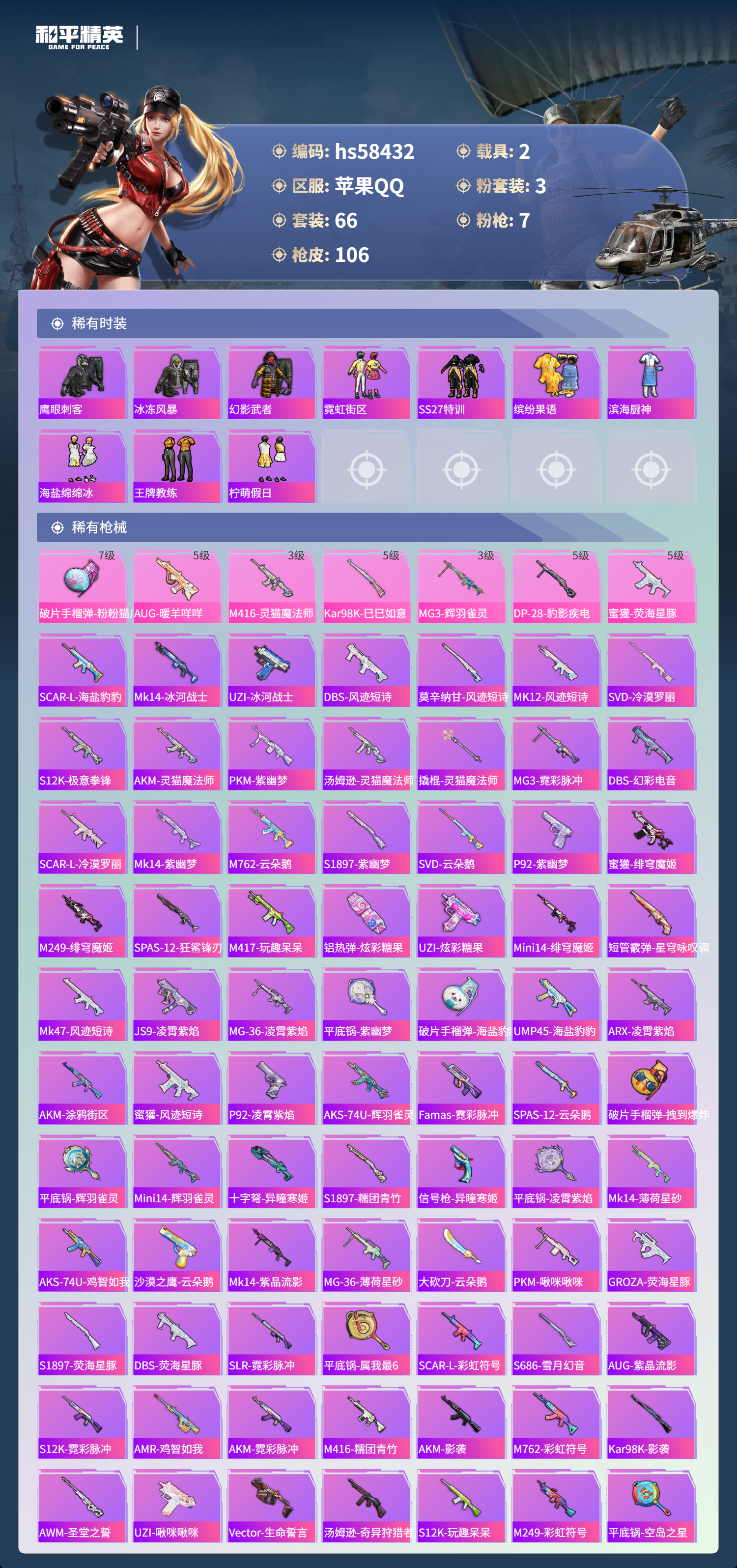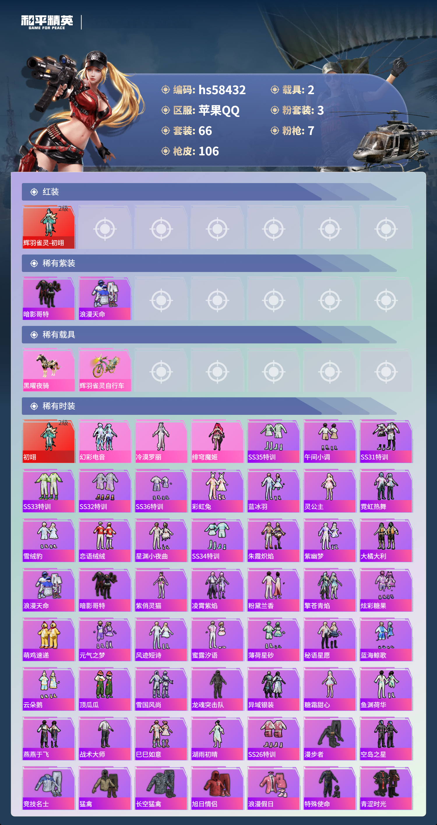 hs58432 苹果手q-5王牌印记-1红装-3粉装-7特效呛-2载具-35983热力值-66套装-106呛皮【1红装】辉羽雀灵-初翊/2级【3粉装】角色-冷漠罗丽套装-幻彩电音角色-绯穹魔姬【7特效呛】dp-28-豹影疾电/5级kar98k-巳巳如意/5级m416-灵猫魔法师/3级mg3-辉羽雀灵/3级破片手留单-粉粉猫爪/7级蜜獾-荧海星豚/5级aug-暖羊咩咩/5级【