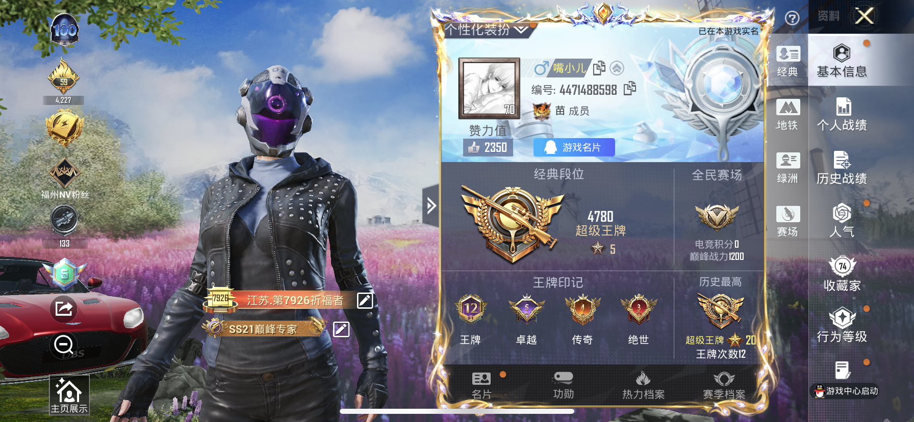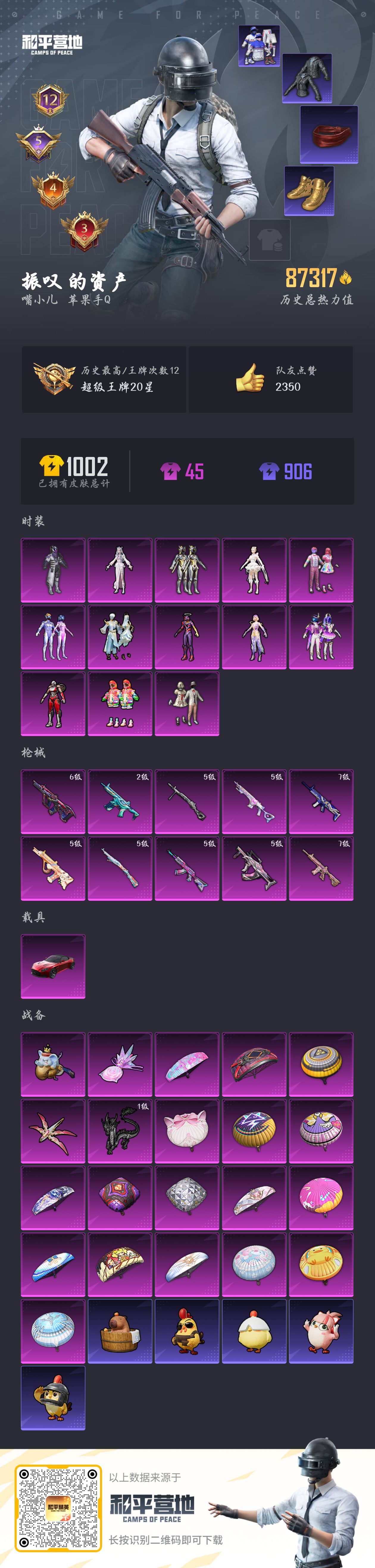 【和平精英】【txhp6524】13粉装,10特效呛,1载具,历史最高段位:超级王牌20星 王牌印记12次 热力值:87317,197套装,268呛械,346装备,162战备;套装:套装-幻影战神,套装-宝贝奶油派,套装-天使彩虹糖,套装-梦幻火箭,套装-极致幻想,套装-绚金战神,角色-阿尔茜,套装-炫光之旅,角色-初号机 觉醒ver.,角色-金域紫灵,套装-金丰海韵,角色-千金淑猫,角色-冷漠罗丽,套装-特训学院,套装-猎鹰,套装-橘黑制服,套装-白色伏地魔,套装-黑色伏地魔,套装-竞技名士,套装-酒红色名流,套装-湖蓝色名流,套装-猛禽,套装-长空猛禽,套装-漫步者,套装-霸义无双,套装-海岛探路者,套装-旭日情侣,套装-冷焰舞者,套装-灼焰舞者,套装-都市猎人,套装-浪漫天命,套装-特战装甲,套装-战地督导,套装-活力之心,套装-春日漫步,套装-滨海假日,套装-鹰眼刺客,套装-人气偶像,套装-街头潮人,套装-暗金炫舞,套装-魅力单车,套装-绮丽涂鸦,套装-狂战萌兔,套装-坚韧舞者,套装-竞技达人朋克,套装-夜莺强袭者,套装-金羽特工,套装-破晓战魂,套装-幻世保卫者,套装-森林游猎者,套装-热血青春,套装-派对舞王,套装-极地朋克,套装-幻世战舞者,套装-清新柠檬,套装-奇异狩猎者,套装-暗影哥特,套装-夏日倾情,套装-青涩时光,套装-缤纷果语,套装-龙魂突击队,套装-特种空勤,套装-冰川特警,套装-元素星魂,套装-格斗先锋,套装-麻辣教官,套装-小丑鱼,套装-粉红小猪,套装-金鼠迎春,套装-军械专家,套装-圣殿骑士,套装-智慧之神,套装-白熊同盟,套装-夏日音浪,套装-探宝勇士,套装-nv战队服,套装-牛气满满,套装-白糯汤圆,套装-特种颜团子,套装-战术大师,套装-ss12特训,套装-牛气冲天,套装-ss18特训,套装-ss13特训,套装-曼妙人鱼,套装-热情海星,套装-纯真浪花,套装-ss14特训,套装-天籁歌者,套装-快乐星愿,套装-星梦畅游,套装-ss17特训,套装-瑞龙福将,套装-团圆交子,套装-极乐追光,套装-福星高照,套装-空投萌叽,套装-ss19特训,套装-飞驰魅影,套装-音速流光,套装-炫蓝之夏,套装-ss20特训,套装-猎梦纪元,套装-甜心亚梦,套装-虚音幻奏,套装-ss21特训,套装-萌趣咩咩,套装-娇憨猪猪,套装-玉兔迎春,套装-ss22特训,套装-光之冒险,套装-绯格组合,套装-ss23特训,套装-神气柴柴,套装-懵萌河马,套装-青玉碎影,套装-ss24特训,套装-ss25特训,套装-金戈铁马,套装-惊鸿侠骨,套装-锦衣飞扬,套装-绝对偶像,套装-香桃花海,套装-深海梦境,角色-2p战斗服款,套装-龙的传人,套装-冰河战士,套装-ss26特训,套装-漫游都市,套装-云魄琉璃,套装-ss27特训,套装-恋语绒绒,套装-老实芭蕉,套装-ss28特训,角色-湖雨初晴,玩偶服-卖崽青蛙,角色-达芬奇,角色-粉雾星云,角色-冰公主,角色-8号机,角色-mark.06,套装-街头风暴,套装-海盐绵绵冰,套装-蝶变,套装-小熊娃娃,套装-ss29特训,套装-雏菊兔兔,角色-狂花道·娜可露露,套装-萝兰蝴蝶,套装-异域银装,角色-都市丽猫,套装-星途旅人,角色-许七安,角色-俏兔智灵,套装-ss30特训,套装-青团波波,套装-棉花软糖,角色-光矢逐梦,套装-糖糖葫芦,套装-萌萌史莱姆,套装-小鸟芋圆,套装-绒宝小鹅,套装-ss31特训,套装-鱼渊荷华,套装-燕燕于飞,套装-智谋强哥,角色-风玲,角色-瑰梦爱神,套装-紫幽梦,套装-粉恋花,套装-晶辉守护,套装-ss33特训,套装-云朵鹅,套装-巳巳如意,套装-ss32特训,套装-彩虹兔,套装-青翼流星,套装-蓝冰羽,套装-雪绒豹,套装-狂鲨锋刃,套装-大橘大利,套装-星渊小夜曲,套装-炫彩糖果,套装-蓝海鲸歌,套装-元气之梦,套装-ss34特训,套装-擎苍青焰,套装-朱霞炽焰,套装-凌霄紫焰,套装-薄荷星砂,套装-ss35特训,套装-琴音绮想,套装-粉黛兰香,套装-画境星梦,套装-ss36特训,套装-雪国风尚,套装-萌鸡速递;呛皮:ace32-画境星梦,ace32-冰晶雪宝,m16a4-甜心亚梦,m16a4-幻世战舞者,m16a4-冰河战士,famas-桃粉嫣然,famas-突变脉冲,famas-霓彩脉冲,famas-乌木金纹,7级scar-l-青春物语,scar-l-红色方程式,scar-l-黄金龙骨,scar-l-夜灯,scar-l-炫彩节奏,scar-l-彩虹符号,scar-l-玉兔迎春,scar-l-星途旅人,scar-l-海盐豹豹,2级蜜獾-异瞳寒姬,蜜獾-娇憨猪猪,蜜獾-垂柳戏鸭,蜜獾-天降萌叽,蜜獾-精灵梦叶罗丽,蜜獾-糖糖葫芦,蜜獾-绿洲时空,蜜獾-乌木金纹,6级aug-星之彼岸,5级aug-暖羊咩咩,aug-甜蜜菠萝,aug-耀粉歌者,aug-天降萌叽,aug-2p战斗服款,aug-异域银装,aug-冰晶雪宝,aug-紫晶流影,5级akm-炫紫旋律,akm-破晓战魂,akm-夜灯,akm-涂鸦街区,akm-星之彼岸,akm-虎虎生威,akm-2p战斗服款,akm-龙的传人,akm-荧星灵猫,akm-霓彩脉冲,akm-绿洲时空,g36c-懵萌河马,g36c-星穹咏叹调,g36c-乌木金纹,m762-奇异狩猎者,m762-甜心宝贝,m762-牛气冲天,m762-瑞龙福将,m762-彩虹甜喵,m762-雏菊兔兔,m762-云朵鹅,q-飞驰魅影,q-未来歌姬,q-纯真浪花,ac-val-甜心亚梦,ac-val-乌木金纹,ac-val-天降萌叽,ac-val-宇宙意志,7级m416-心之恋语,m416-蓝色火焰,m416-绯红前夜,m416-萌萌史莱姆,mk47-百万伏特,mk47-粉色回忆,mk47-洛神天依,mk47-乌木金纹,5级groza-镜光银凌,groza-影袭,groza-彩虹符号,groza-懵萌河马,arx-凌霄紫焰,awm-纯真浪花,awm-乌木金纹,awm-绿洲时空,5级kar98k-巳巳如意,kar98k-影袭,kar98k-梦幻火箭,kar98k-彩虹符号,kar98k-炫彩节奏,kar98k-飞驰魅影,kar98k-顶峰精英,莫辛纳甘-炙焰牛王,莫辛纳甘-乌木金纹,莫辛纳甘-懵萌河马,m24-影袭,m24-炫彩节奏,m24-樱桃泡泡,m24-乌木金纹,amr-鸡智如我,amr-乌木金纹,win94-瑞龙福将,win94-乌木金纹,m200-惊鸿侠骨,m200-乌木金纹,svd-云朵鹅,svd-霓彩脉冲,vss-粉色回忆,