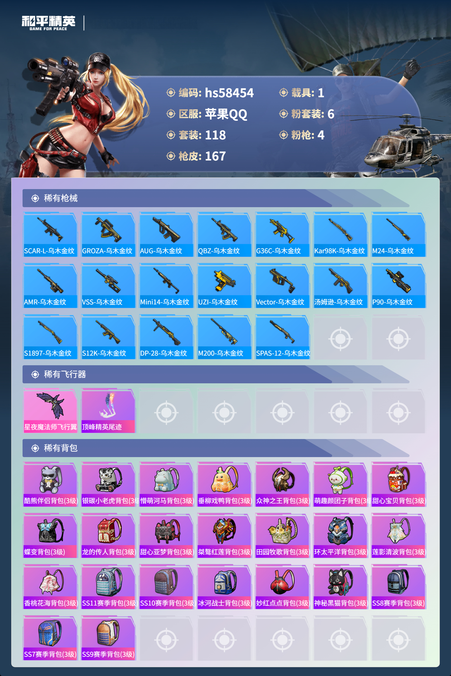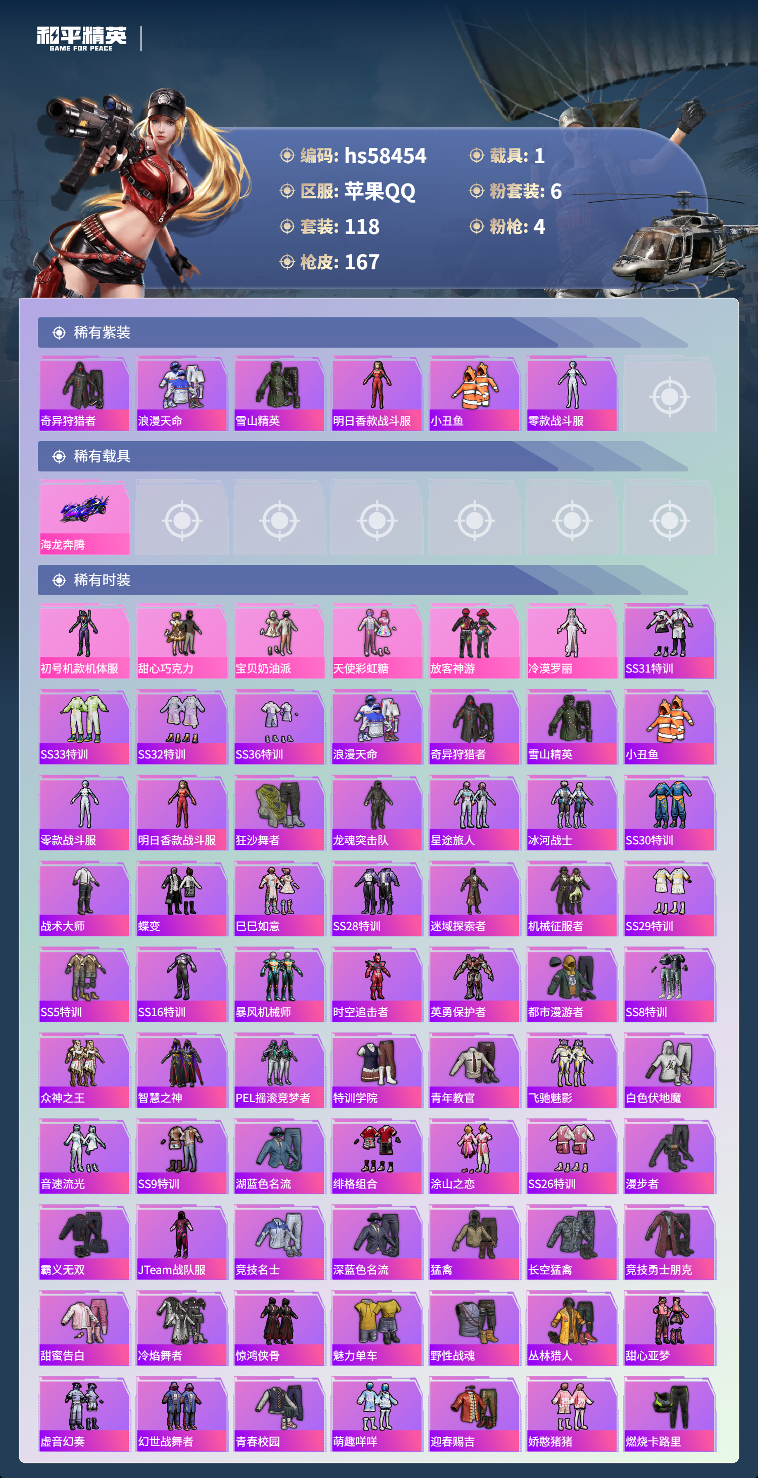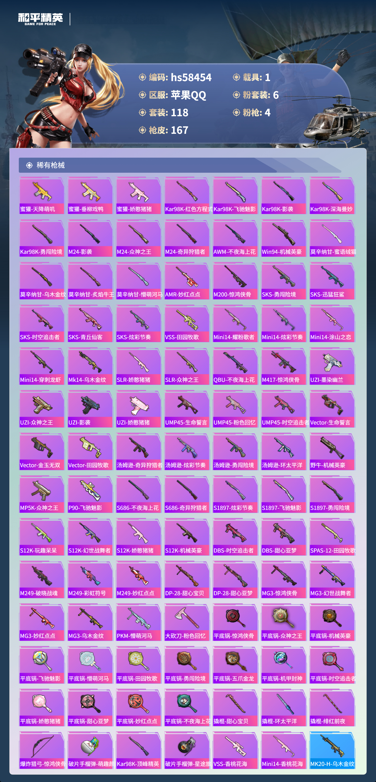 hs58454 苹果手q-16王牌印记-有战神框-6粉装-4特效呛-1载具-53475热力值-118套装-167呛皮-2卓越印记【6粉装】角色-初号机款机体服套装-放客神游套装-宝贝奶油派角色-冷漠罗丽套装-天使彩虹糖套装-甜心巧克力【4特效呛】kar98k-巳巳如意/1级m417-第五大道/1级akm-梦之光华/6级m416-五爪金龙/7级【6稀有紫装】奇异狩猎者浪漫天命